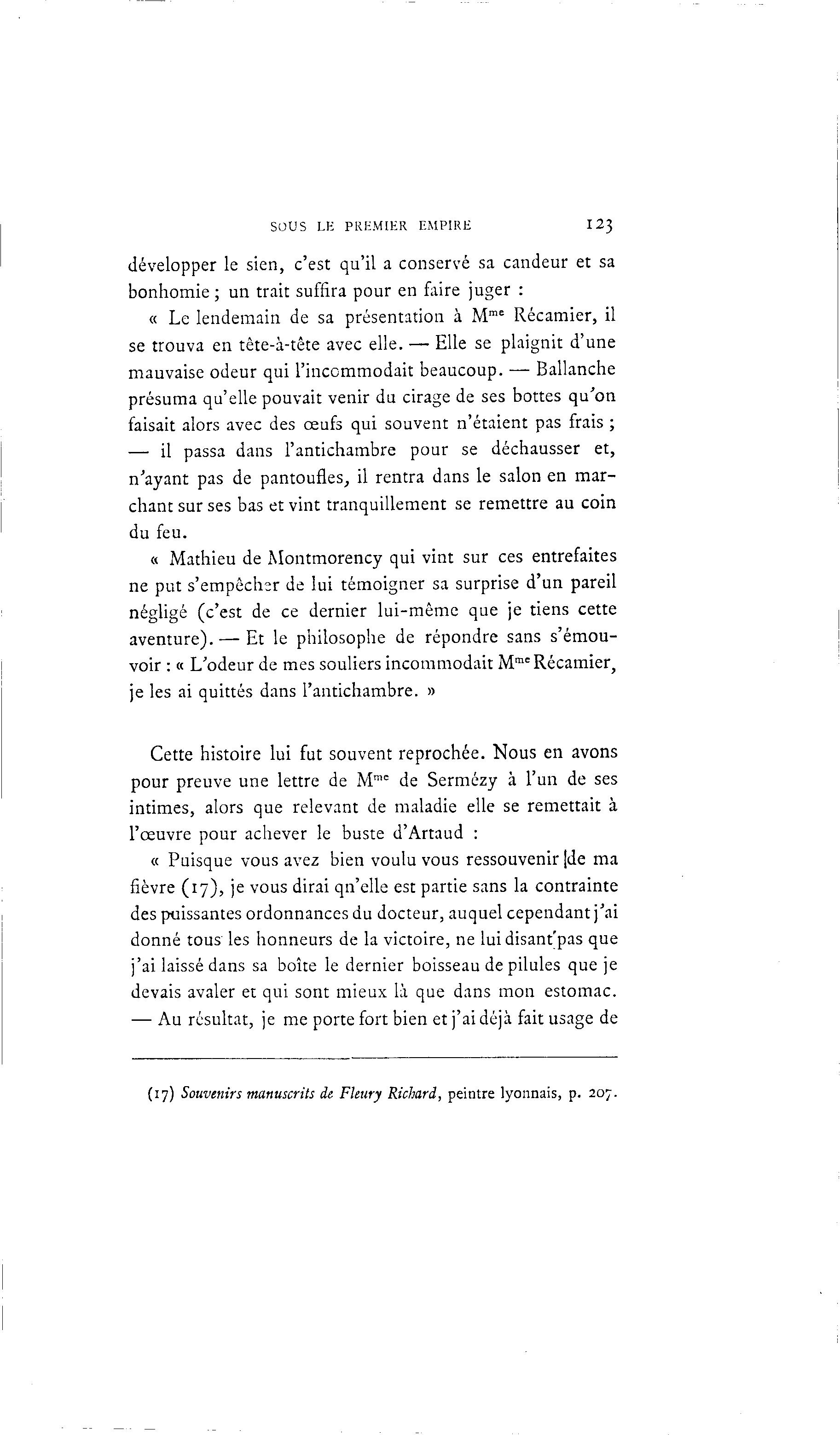 SOUS LE PREMIER EMPIRE 123 développer le sien, c'est qu'il a conservé sa candeur et sa bonhomie ; un trait suffira pour en faire juger : « Le lendemain de sa présentation à Mme Récamier, il se trouva en tète-à -tête avec elle. — Elle se plaignit d'une mauvaise odeur qui l'incommodait beaucoup. — Ballanche présuma qu'elle pouvait venir du cirage de ses bottes qu'on faisait alors avec des œufs qui souvent n'étaient pas frais ; — il passa dans l'antichambre pour se déchausser et, n'ayant pas de pantoufles, il rentra dans le salon en mar- chant sur ses bas et vint tranquillement se remettre au coin du feu. « Mathieu de Montmorency qui vint sur ces entrefaites ne put s'empêcher de lui témoigner sa surprise d'un pareil négligé (c'est de ce dernier lui-même que je tiens cette aventure). — Et le philosophe de répondre sans s'émou- voir : « L'odeur de mes souliers incommodait Mmc Récamier, je les ai quittés dans l'antichambre. » Cette histoire lui fut souvent reprochée. Nous en avons pour preuve une lettre de Mmc de Sermézy à l'un de ses intimes, alors que relevant de maladie elle se remettait à l'œuvre pour achever le buste d'Artaud : « Puisque vous avez bien voulu vous ressouvenir [de ma fièvre (17), je vous dirai qn'elle est partie sans la contrainte des puissantes ordonnances du docteur, auquel cependant j'ai donné tous les honneurs de la victoire, ne luidisant'pas que j'ai laissé dans sa boîte le dernier boisseau de pilules que je devais avaler et qui sont mieux là que dans mon estomac. — Au résultat, je me porte fort bien et j'ai déjà fait usage de (17) Souvenirs manuscrits de Fleury Richard, peintre lyonnais, p. 207.