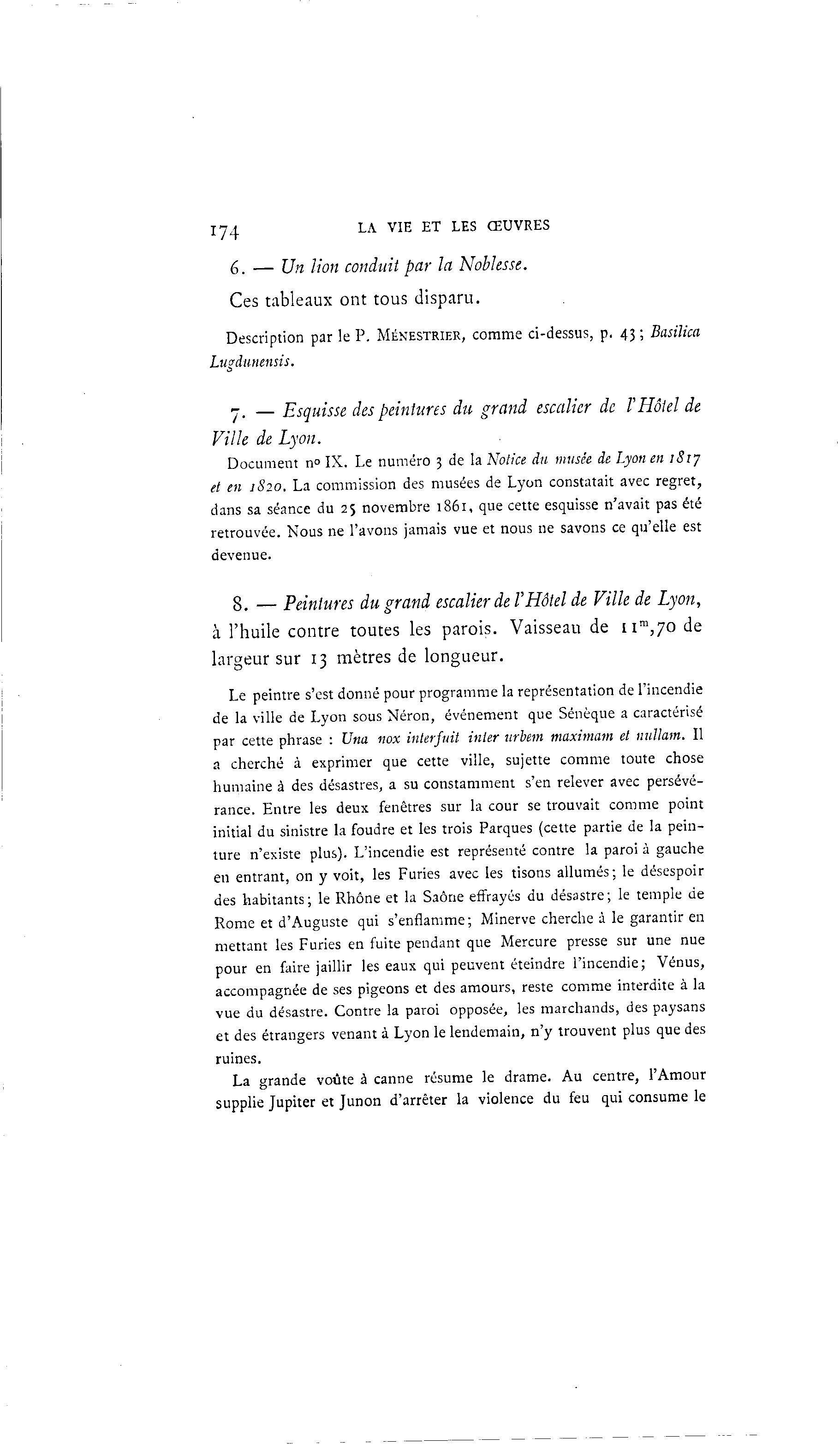 LA VIE ET LES 174 ŒUVRES 6. — Un lion conduit par la Noblesse. Ces tableaux ont tous disparu. Description par le P. MÉNESTRIER, comme ci-dessus, p. 43 ; Basilka Lugdunensis. 7. — Esquisse des peintures du grand escalier de VHôtel de Ville de Lyon. Document n° IX. Le numéro 3 de la Notice du musée de Lyon en 1S17 et en 1820. La commission des musées de Lyon constatait avec regret, dans sa séance du 25 novembre 1861, que cette esquisse n'avait pas été retrouvée. Nous ne l'avons jamais vue et nous ne savons ce qu'elle est devenue. 8. — Peintures du grand escalier de VHôtel de Ville de Lyon, à l'huile contre toutes les parois. Vaisseau de u m , 7 0 de largeur sur 13 mètres de longueur. Le peintre s'est donné pour programme la représentation de l'incendie de la ville de Lyon sous Néron, événement que Sénèque a caractérisé par cette phrase : Una nox interfuit inler urbem maximum et nutlam. Il a cherché à exprimer que cette ville, sujette comme toute chose humaine à des désastres, a su constamment s'en relever avec persévé- rance. Entre les deux fenêtres sur la cour se trouvait comme point initial du sinistre la foudre et les trois Parques (cette partie de la pein- ture n'existe plus). L'incendie est représenté contre la paroi à gauche en entrant, on y voit, les Furies avec les tisons allumés; le désespoir des habitants; le Rhône et la Saône effrayés du désastre; le temple de Rome et d'Auguste qui s'enflamme; Minerve cherche à le garantir en mettant les Furies en fuite pendant que Mercure presse sur une nue pour en faire jaillir les eaux qui peuvent éteindre l'incendie; Vénus, accompagnée de ses pigeons et des amours, reste comme interdite à la vue du désastre. Contre la paroi opposée, les marchands, des paysans et des étrangers venant à Lyon le lendemain, n'y trouvent plus que des ruines. La grande voûte à canne résume le drame. Au centre, l'Amour supplie Jupiter et Junon d'arrêter la violence du feu qui consume le
