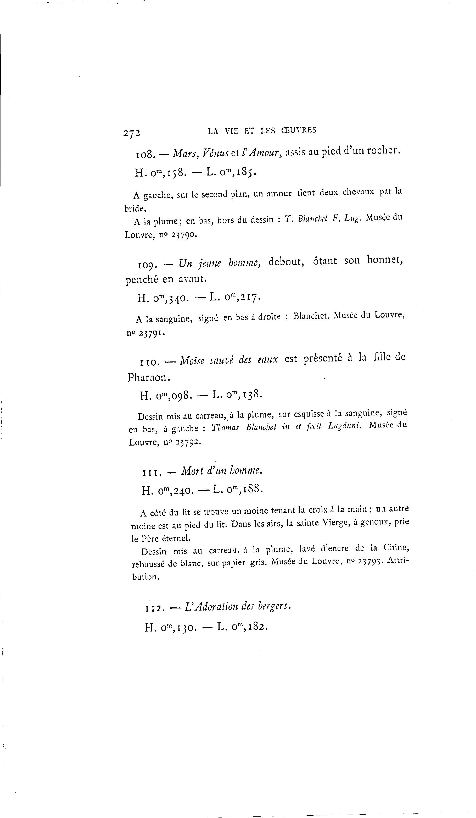 272 LA VIE ET LES ŒUVRES 108. — Mars, Vénus et F Amour, assis au pied d'un rocher. H. o m ,i58. — L. o m ,i85. A gauche, sur le second plan, un amour tient deux chevaux par la bride. A la plume; en bas, hors du dessin : T. Blanchet F. Lttg. Musée du Louvre, n° 23790. 109. — Un jeune homme, debout, ôtant son bonnet, penché en avant. H. o m ,340. — L. o m ,2i7. A la sanguine, signé en bas à droite : Blanchet. Musée du Louvre, n° 23791. 110. —Moïse sauvé des eaux est présenté à la fille de Pharaon. H. o m ,098. — L. o m ,i38. Dessin mis au carreau, à la plume, sur esquisse à la sanguine, signé en bas, à gauche : Thomas Blanchet in et fecit Lvgduni. Musée du Louvre, n° 23792. n i . — Mort d'un homme. H. o ra ,240. — L. o m ,i88. A côté du lit se trouve un moine tenant la croix à la main ; un autre mcine est au pied du lit. Dans les airs, la sainte Vierge, à genoux, prie le Père éternel. Dessin mis au carreau, a la plume, lavé d'encre de la Chine, rehaussé de blanc, sur papier gris. Musée du Louvre, 11° 23795. Attri- bution. 112. — L'Adoration des bergers. H. o m ,i30. — L. o m ,i82.