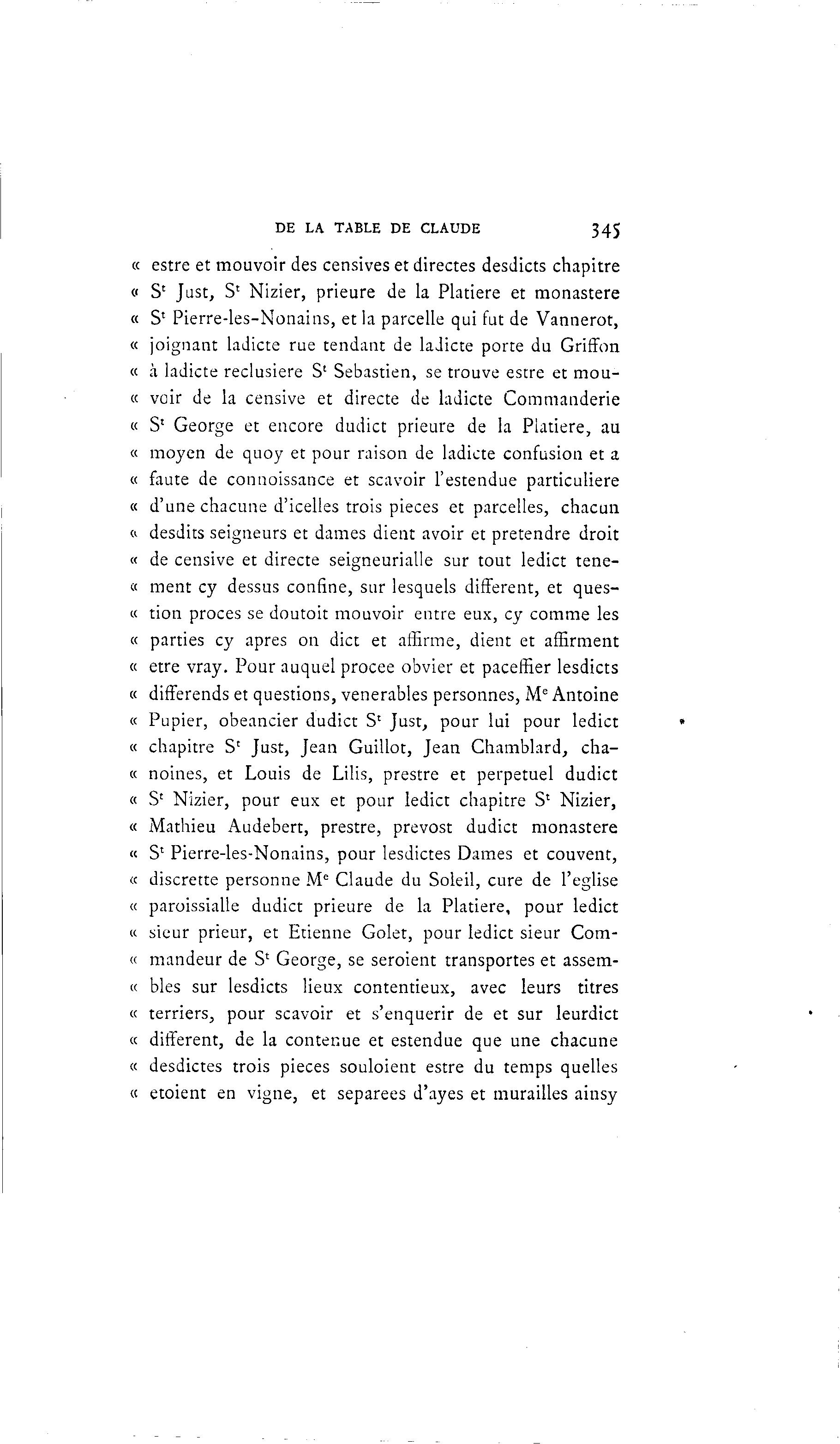 DE LA TABLE DE CLAUDE 345 « estre et mouvoir des censives et directes desdicts chapitre « S1 Just, S' Nizier, prieure de la Platiere et monastère « S1 Pierre-les-Nonains, et la parcelle qui fut de Vannerot, « joignant ladicte rue tendant de ladicte porte du Griffon « à ladicte reclusiere S' Sebastien, se trouve estre et mou- c e voir de la censive et directe de ladicte Commanderie « S1 George et encore dudict prieure de la Platiere, au « moyen de quoy et pour raison de ladicte confusion et a « faute de connoissance et scavoir l'estendue particulière « d'une chacune d'icelles trois pièces et parcelles, chacun o desdits seigneurs et dames dient avoir et prétendre droit « de censive et directe seigneurialle sur tout ledict tene- « ment cy dessus confine, sur lesquels différent, et ques- « tion procès se doutoit mouvoir entre eux, cy comme les « parties cy après on dict et affirme, dient et affirment « être vray. Pour auquel procee obvier et paceffier lesdicts « différends et questions, vénérables personnes, Me Antoine « Pupier, obeancier dudict S1 Just, pour lui pour ledict « chapitre S' Just, Jean Guillot, Jean Chamblard, cha- « noines, et Louis de Lilis, prestre et perpétuel dudict « S' Nizier, pour eux et pour ledict chapitre S1 Nizier, « Mathieu Audebert, prestre, prevost dudict monastère « S1 Pierre-les-Nonains, pour lesdictes Dames et couvent, « discrette personne Me Claude du Soleil, cure de l'église « paroissialle dudict prieure de la Platiere, pour ledict « sieur prieur, et Etienne Golet, pour ledict sieur Com- « mandeur de S1 George, se seroient transportes et assem- « blés sur lesdicts lieux contentieux, avec leurs titres « terriers, pour scavoir et s'enquérir de et sur leurdict « différent, de la contenue et estendue que une chacune « desdictes trois pièces souloient estre du temps quelles « etoient en vigne, et séparées d'ayes et murailles ainsy