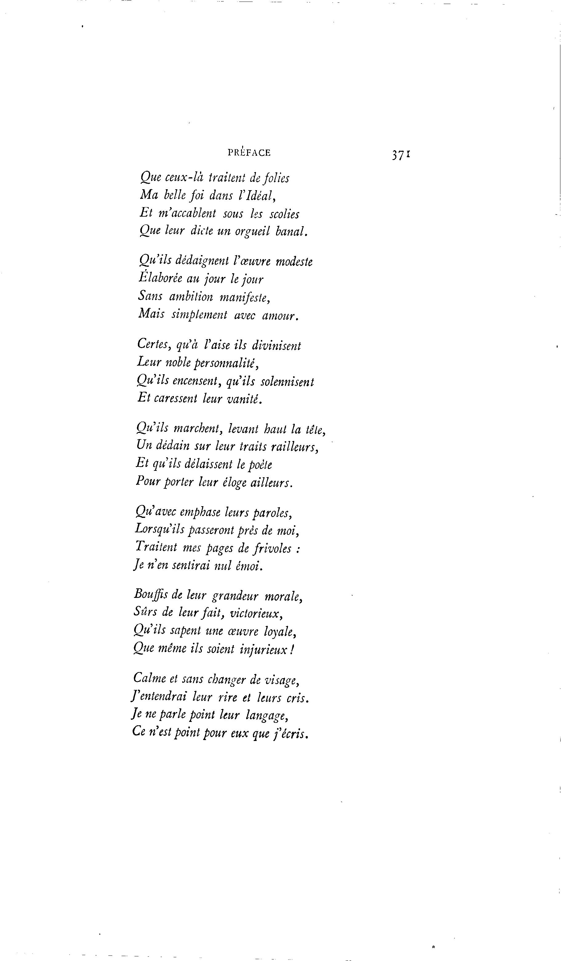 PREFACE Que ceux-là traitent de folies Ma belle foi dans l'Idéal, Et m'accablent sous ks scolies Que leur dicte un orgueil banal. Qu'ils dédaignent l'œuvre modeste Elaborée au jour le jour Sans ambition manifeste, Mais simplement avec amour. Certes, qu'à l'aise ils divinisent Leur noble personnalité, Qu'ils encensent, qu'ils solennisent Et caressent leur vanité. Qu'ils marchent, levant haut la tête, Un dédain sur leur traits railleurs, Et qu'ils délaissent le poète Pour porter leur éloge ailleurs. Qu'avec emphase leurs paroles, Lorsqu'ils passeront près de moi, Traitent mes pages de frivoles : Je n'en sentirai nul émoi. Bouffis de leur grandeur morale, Sûrs de leur fait, victorieux, Qu'ils sapent une œuvre loyale, Que même ils soient injurieux ! Calme et sans changer de visage, J'entendrai leur rire et leurs cris. Je ne parle point leur langage, Ce n'est point pour eux que j'écris.