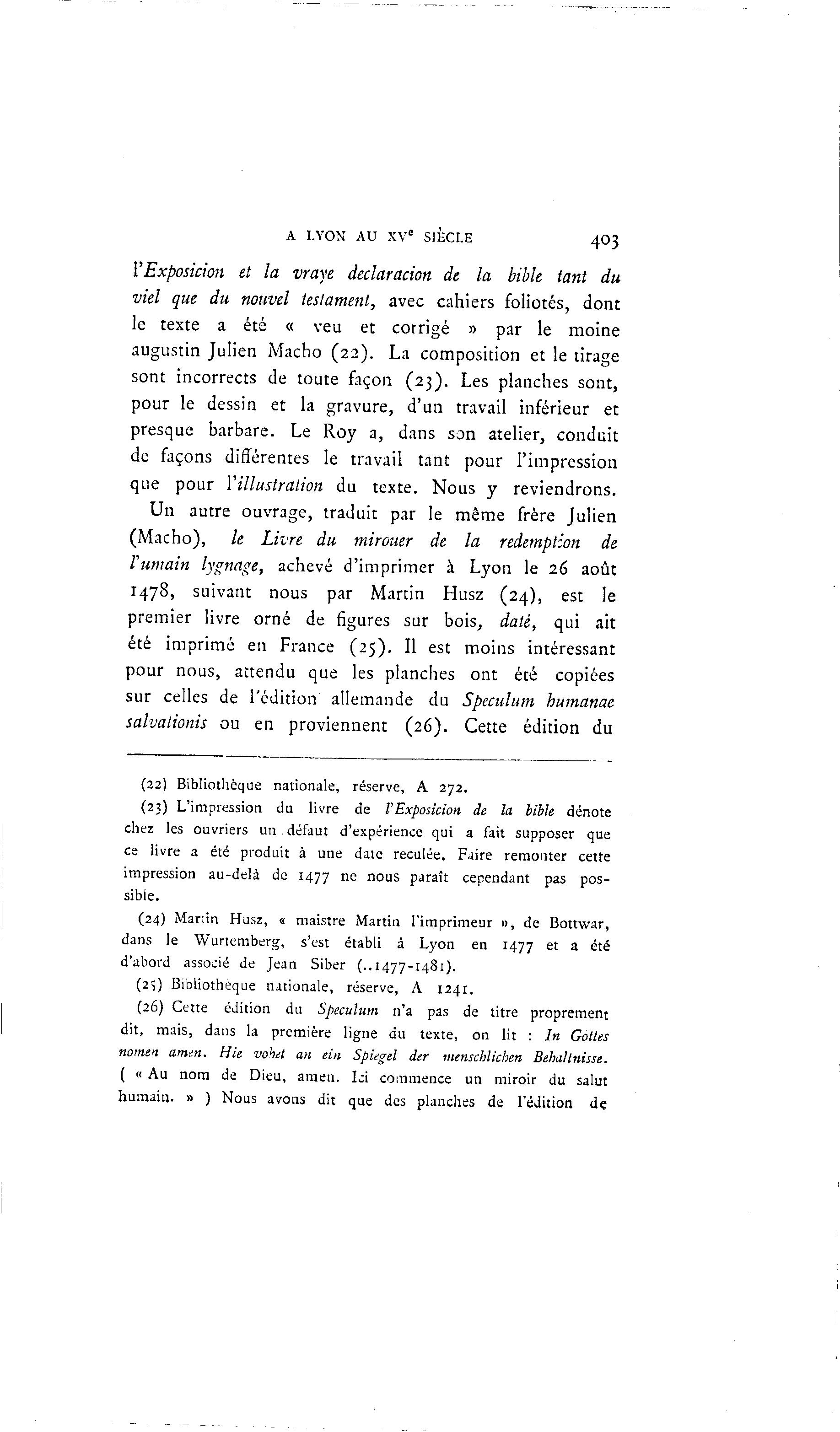 A LYON AU XVe SIECLE 403 l'Exposition et la vraye déclaration de la bible tant du viel que du nouvel testament, avec cahiers foliotés, dont le texte a été « veu et corrigé » par le moine augustin Julien Macho (22). La composition et le tirage sont incorrects de toute façon (23). Les planches sont, pour le dessin et la gravure, d'un travail inférieur et presque barbare. Le Roy a, dans son atelier, conduit de façons différentes le travail tant pour l'impression que pour l'illustration du texte. Nous y reviendrons. Un autre ouvrage, traduit par le même frère Julien (Macho), le Livre du mirouer de la rédemption de Vuntain lygnage, achevé d'imprimer à Lyon le 26 août 1478, suivant nous par Martin Husz (24), est le premier livre orné de figures sur bois, daté, qui ait été imprimé en France (25). Il est moins intéressant pour nous, attendu que les planches ont été copiées sur celles de l'édition allemande du Spéculum humanae salvalionis ou en proviennent (26). Cette édition du (22) Bibliothèque nationale, réserve, A 272. (23) L'impression du livre de TExposicion de la bible dénote chez les ouvriers un . défaut d'expérience qui a fait supposer que ce livre a été produit à une date reculée. Faire remonter cette impression au-delà de 1477 n e nous paraît cependant pas pos- sible. (24) Martin Husz, « maistre Martin l'imprimeur », de Bottwar, dans le Wurtemberg, s'est établi à Lyon en 1477 e t a été d'abord associé de Jean Siber (..1477-1481). (25) Bibliothèque nationale, réserve, A 1241. (26) Cette édition du Spéculum n'a pas de titre proprement dit, mais, dans la première ligne du texte, on lit : In Gottes nomen amen. Hie vohet an ein Spiegel der menschlichen Behaltnisse. ( « Au nom de Dieu, amen. Ici commence un miroir du salut humain. » ) Nous avons dit que des planches de l'édition de