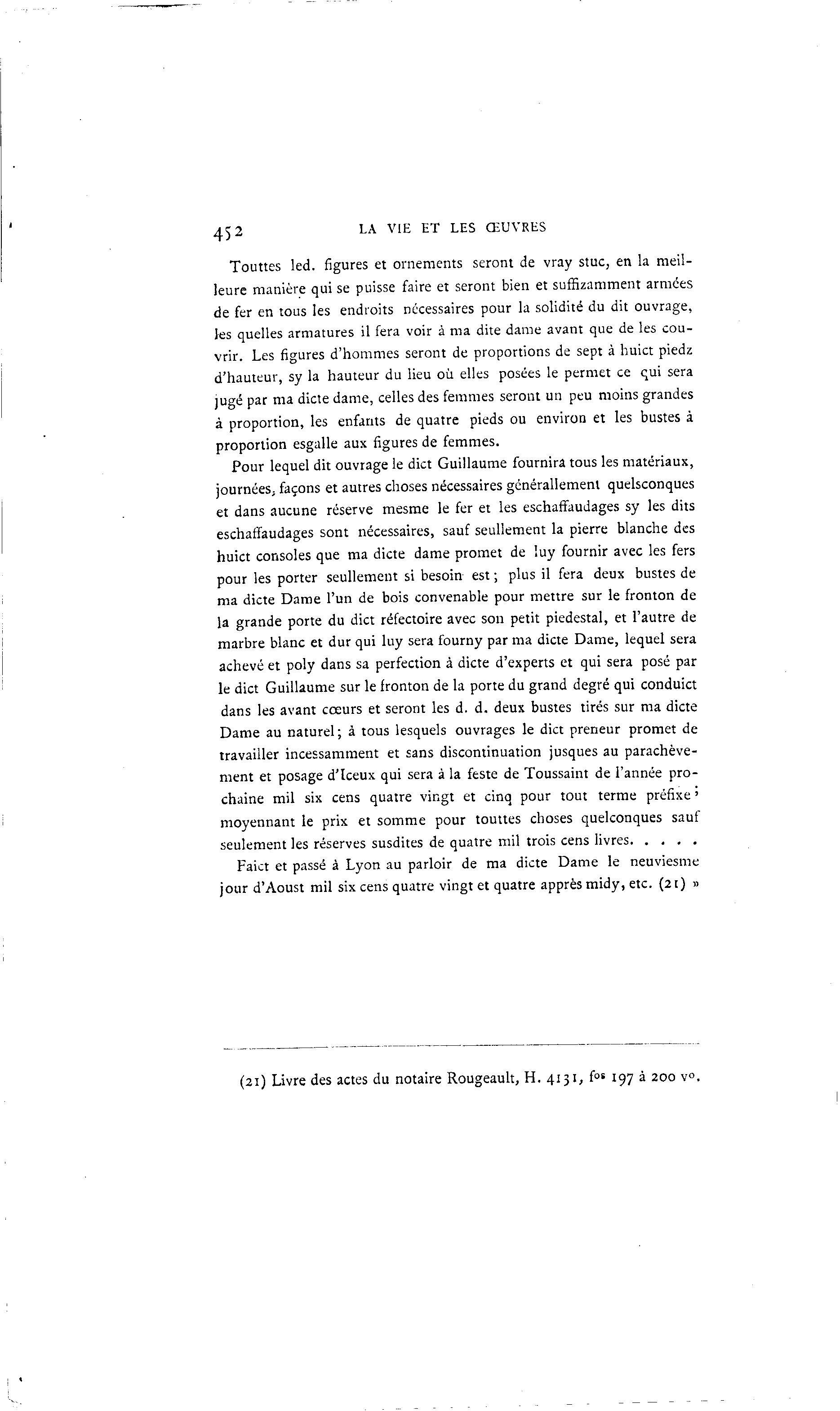 452 LA VIE ET LES ŒUVRES Touttes led. figures et ornements seront de vray stuc, en la meil- leure manière qui se puisse faire et seront bien et suffizamment armées de fer en tous les endroits nécessaires pour la solidité du dit ouvrage, les quelles armatures il fera voir à ma dite dame avant que de les cou- vrir. Les figures d'hommes seront de proportions de sept à huict piedz d'hauteur, sy la hauteur du lieu où elles posées le permet ce qui sera jugé par ma dicte dame, celles des femmes seront un peu moins grandes à proportion, les enfants de quatre pieds ou environ et les bustes à proportion esgalle aux figures de femmes. Pour lequel dit ouvrage le dict Guillaume fournira tous les matériaux, journées; façons et autres choses nécessaires générallement quelsconques et dans aucune réserve mesme le fer et les eschaffaudages sy les dits eschaffaudages sont nécessaires, sauf seullement la pierre blanche des huict consoles que ma dicte dame promet de luy fournir avec les fers pour les porter seullement si besoin est ; plus il fera deux bustes de ma dicte Dame l'un de bois convenable pour mettre sur le fronton de la grande porte du dict réfectoire avec son petit piédestal, et l'autre de marbre blanc et dur qui luy sera fourny par ma dicte Dame, lequel sera achevé et poly dans sa perfection à dicte d'experts et qui sera posé par le dict Guillaume sur le fronton de la porte du grand degré qui conduict dans les avant coeurs et seront les d. d. deux bustes tirés sur ma dicte Dame au naturel; à tous lesquels ouvrages le dict preneur promet de travailler incessamment et sans discontinuation jusques au parachève- ment et posage d'Iceux qui sera à la feste de Toussaint de l'année pro- chaine mil six cens quatre vingt et cinq pour tout terme préfixe ' moyennant le prix et somme pour touttes choses quelconques sauf seulement les réserves susdites de quatre mil trois cens livres Faict et passé à Lyon au parloir de ma dicte Dame le neuviesme jour d'Aoust mil six cens quatre vingt et quatre apprèsmidy, etc. (21) » (21) Livre des actes du notaire Rougeault, H. 4131, fos 197 à 200 v°.