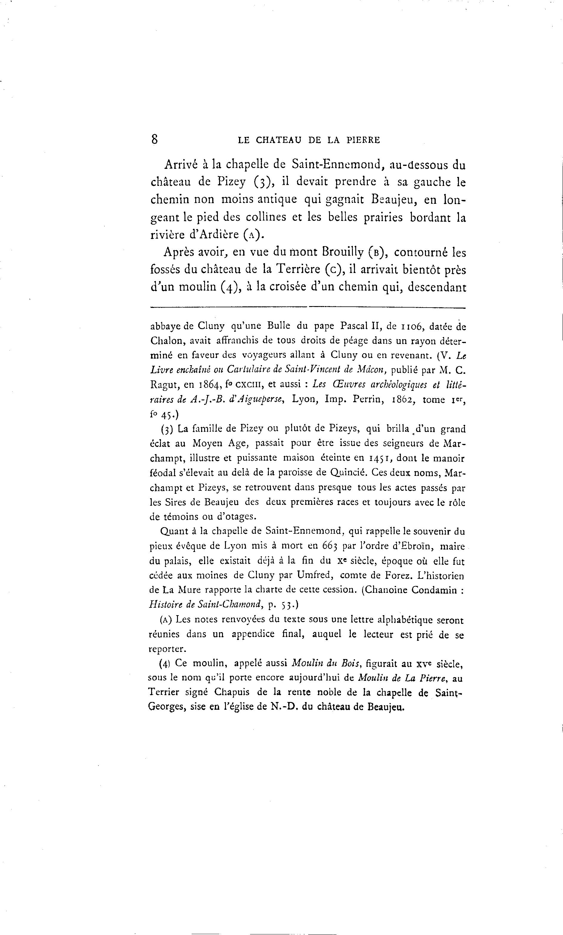 8 LE CHATEAU DE LA PIERRE Arrivé à la chapelle de Saint-Ennemond, au-dessous du château de Pizey (3), il devait prendre à sa gauche le chemin non moins antique qui gagnait Beaujeu, en lon- geant le pied des collines et les belles prairies bordant la rivière d'Ardière (A). Après avoir, en vue du mont Brouilly (B), contourné les fossés du château de la Terrière (c), il arrivait bientôt près d'un moulin (4), à la croisée d'un chemin qui, descendant abbaye de Cluny qu'une Bulle du pape Pascal II, de 1106, datée de Chalon, avait affranchis de tous droits de péage dans un rayon déter- miné en faveur des voyageurs allant à Cluny ou en revenant. (V. Le Livre enchaîné ou Cartulaire de Saint-Vincent de Mdcon, publié par M. C. Ragut, en 1864, f° cxcm, et aussi : Les Œuvres archéologiques et litté- raires de A.-J.-B. d'Aigueperse, Lyon, Imp. Perrin, 1862, tome i " , fo 45.) (3) La famille de Pizey ou plutôt de Pizeys, qui brilla d'un grand éclat au Moyen Age, passait pour être issue des seigneurs de Mar- champt, illustre et puissante maison éteinte en 1451, dont le manoir féodal s'élevait au delà de la paroisse de Quincié. Ces deux noms, Mar- charapt et Pizeys, se retrouvent dans presque tous les actes passés par les Sires de Beaujeu des deux premières races et toujours avec le rôle de témoins ou d'otages. Quant à la chapelle de Saint-Ennemond, qui rappelle le souvenir du pieux évêque de Lyon mis à mort en 663 par l'ordre d'Ebroïn, maire du palais, elle existait déjà à la fin du x= siècle, époque où elle fut cédée aux moines de Cluny par Umfred, comte de Forez. L'historien de La Mure rapporte la charte de cette cession. (Chanoine Condamin : Histoire de Saint-Chamond, p. 53.) (A) Les notes renvoyées du texte sous une lettre alphabétique seront réunies dans un appendice final, auquel le lecteur est prié de se reporter. (4) Ce moulin, appelé aussi Moulin du Bois, figurait au XVe siècle, sous le nom qu'il porte encore aujourd'hui de Moulin de La Pierre, au Terrier signé Chapuis de la rente noble de la chapelle de Saint- Georges, sise en l'église de N . - D . du château de Beaujeu.