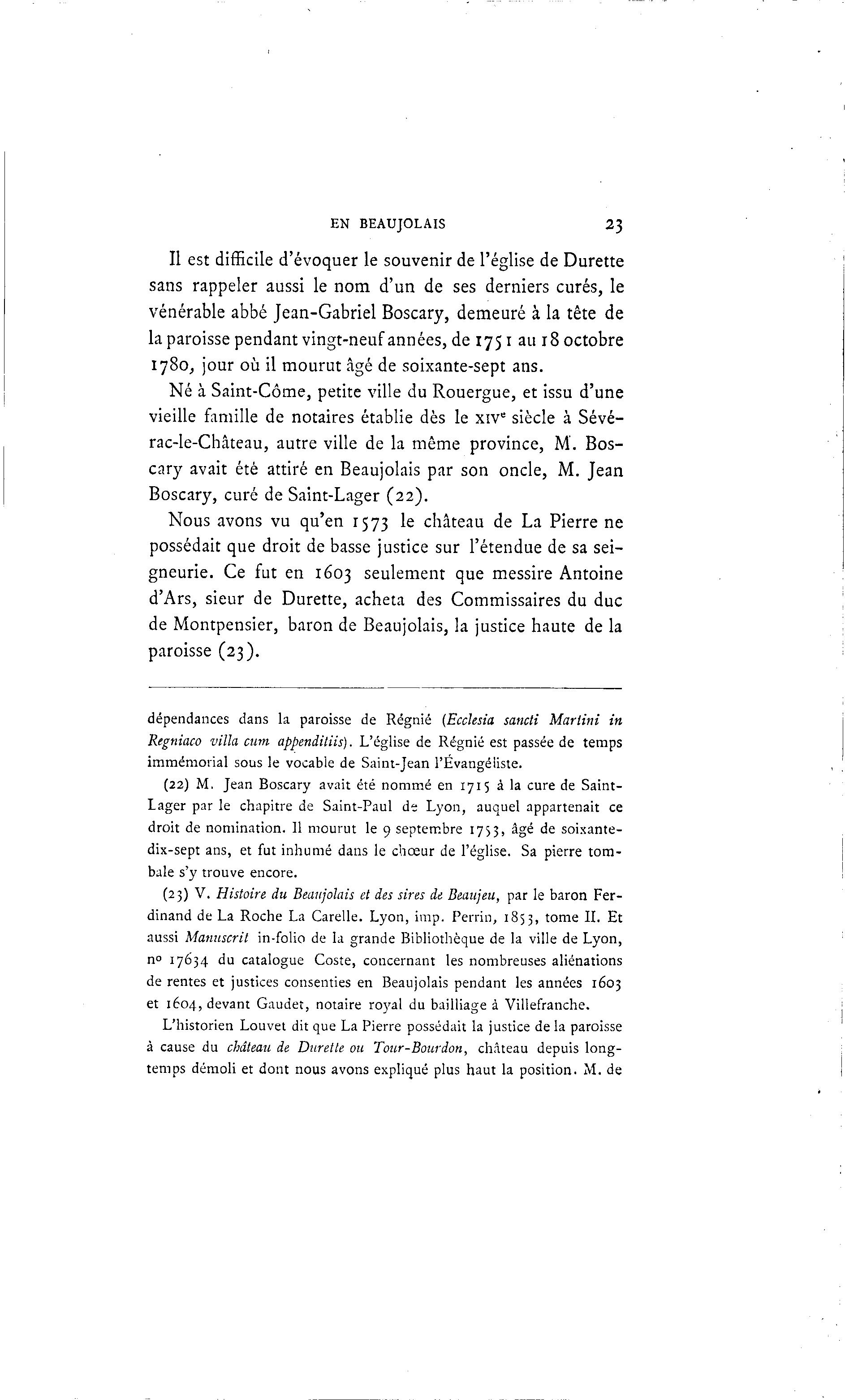 EN BEAUJOLAIS 23 Il est difficile d'évoquer le souvenir de l'église de Durette sans rappeler aussi le nom d'un de ses derniers curés, le vénérable abbé Jean-Gabriel Boscary, demeuré à la tête de la paroisse pendant vingt-neuf années, de 1751 au 18 octobre 1780, jour où il mourut âgé de soixante-sept ans. Né à Saint-Côme, petite ville du Rouergue, et issu d'une vieille famille de notaires établie dès le xive siècle à Sévé- rac-le-Château, autre ville de la même province, M. Bos- cary avait été attiré en Beaujolais par son oncle, M. Jean Boscary, curé de Saint-Lager (22). Nous avons vu qu'en 1573 le château de La Pierre ne possédait que droit de basse justice sur l'étendue de sa sei- gneurie. Ce fut en 1603 seulement que messire Antoine d'Ars, sieur de Durette, acheta des Commissaires du duc de Montpensier, baron de Beaujolais, la justice haute de la paroisse (23). dépendances dans la paroisse de Régnié (Ecchsia sancti Martini in Regniaco villa cum appenditiis). L'église de Régnié est passée de temps immémorial sous le vocable de Saint-Jean l'Evangéliste. (22) M. Jean Boscary avait été nommé en 1715 à la cure de Saint- Lager par le chapitre de Saint-Paul de Lyon, auquel appartenait ce droit de nomination. 11 mourut le 9 septembre 1753, âgé de soixante- dix-sept ans, et fut inhumé dans le chœur de l'église. Sa pierre tom- bale s'y trouve encore. (23) V. Histoire du Beaujolais et des sires de Beaujeu, par le baron Fer- dinand de La Roche La Carelle. Lyon, imp. Perrin, 1853, tome IL Et aussi Manuscrit in-folio de la grande Bibliothèque de la ville de Lyon, n° 17634 du catalogue Coste, concernant les nombreuses aliénations de rentes et justices consenties en Beaujolais pendant les années 1603 et 1604, devant Gaudet, notaire royal du bailliage à Villefranche. L'historien Louvet dit que La Pierre possédait la justice de la paroisse à cause du château de Durette ou Tour-Bourdon, château depuis long- temps démoli et dont nous avons expliqué plus haut la position. M. de