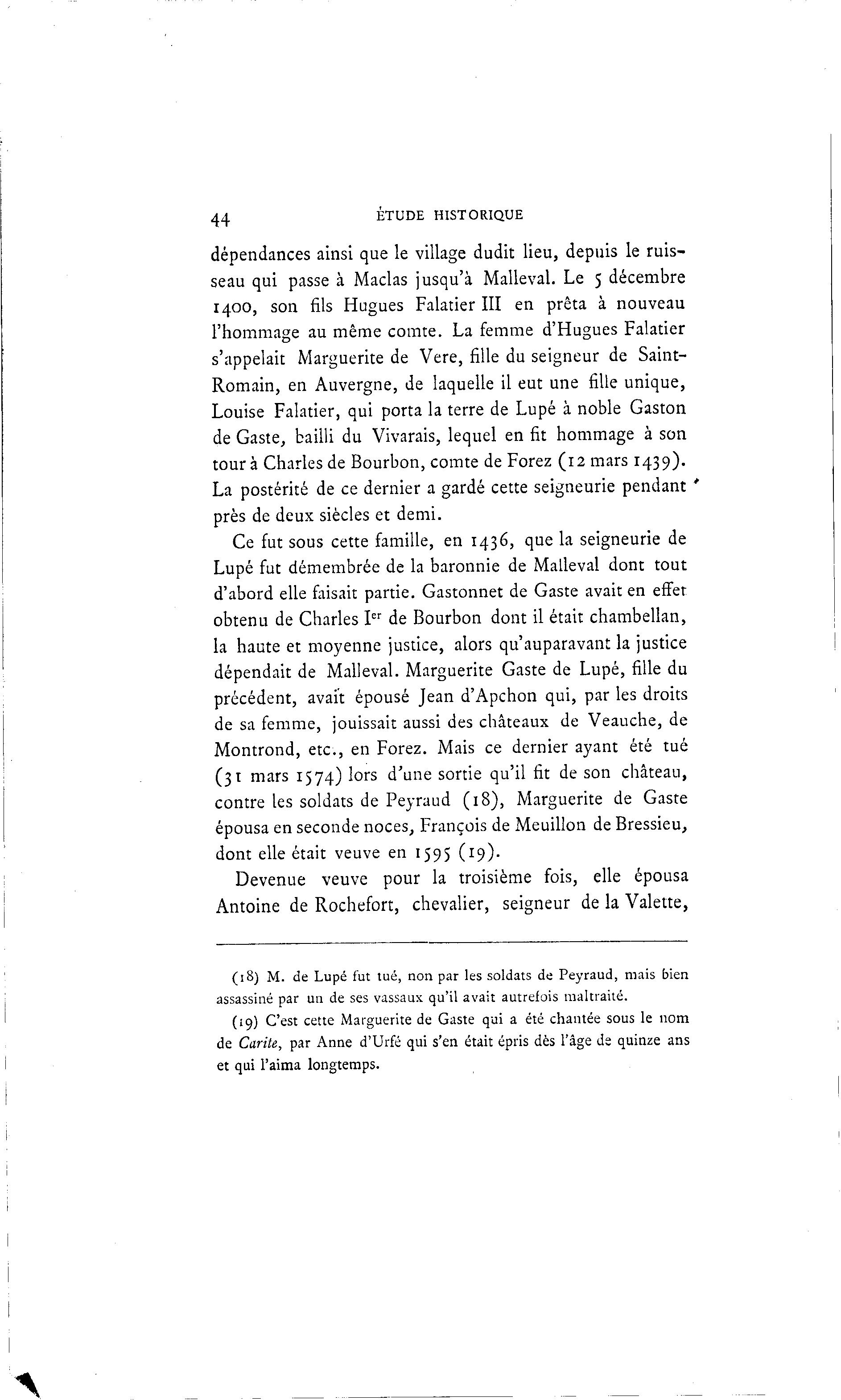 44 ETUDE HISTORIQUE dépendances ainsi que le village dudit lieu, depuis le ruis- seau qui passe à Maclas jusqu'à Mallevai. Le 5 décembre 1400, son fils Hugues Falatier III en prêta à nouveau l'hommage au même comte. La femme d'Hugues Falatier s'appelait Marguerite de Vere, fille du seigneur de Saint- Romain, en Auvergne, de laquelle il eut une fille unique, Louise Falatier, qui porta la terre de Lupé à noble Gaston de Gaste, bailli du Vivarais, lequel en fit hommage à son tour à Charles de Bourbon, comte de Forez (12 mars 1439). La postérité de ce dernier a gardé cette seigneurie pendant ' près de deux siècles et demi. Ce fut sous cette famille, en 1436, que la seigneurie de Lupé fut démembrée de la baronnie de Malleval dont tout d'abord elle faisait partie. Gastonnet de Gaste avait en effet obtenu de Charles I er de Bourbon dont il était chambellan, la haute et moyenne justice, alors qu'auparavant la justice dépendait de Mallevai. Marguerite Gaste de Lupé, fille du précédent, avait épousé Jean d'Apchon qui, par les droits de sa femme, jouissait aussi des châteaux de Veauche, de Montrond, etc., en Forez. Mais ce dernier ayant été tué (31 mars 1574) lors d'une sortie qu'il fit de son château, contre les soldats de Peyraud (18), Marguerite de Gaste épousa en seconde noces, François de Meuillon de Bressieu, dont elle était veuve en 1595 (19). Devenue veuve pour la troisième fois, elle épousa Antoine de Rochefort, chevalier, seigneur de la Valette, (18) M. de Lupé fut tué, non par les soldats de Peyraud, mais bien assassiné par un de ses vassaux qu'il avait autrefois maltraité. (19) C'est cette Marguerite de Gaste qui a été chantée sous le nom de Carite, par Anne d'Urfé qui s'en était épris dès l'âge de quinze ans et qui l'aima longtemps.