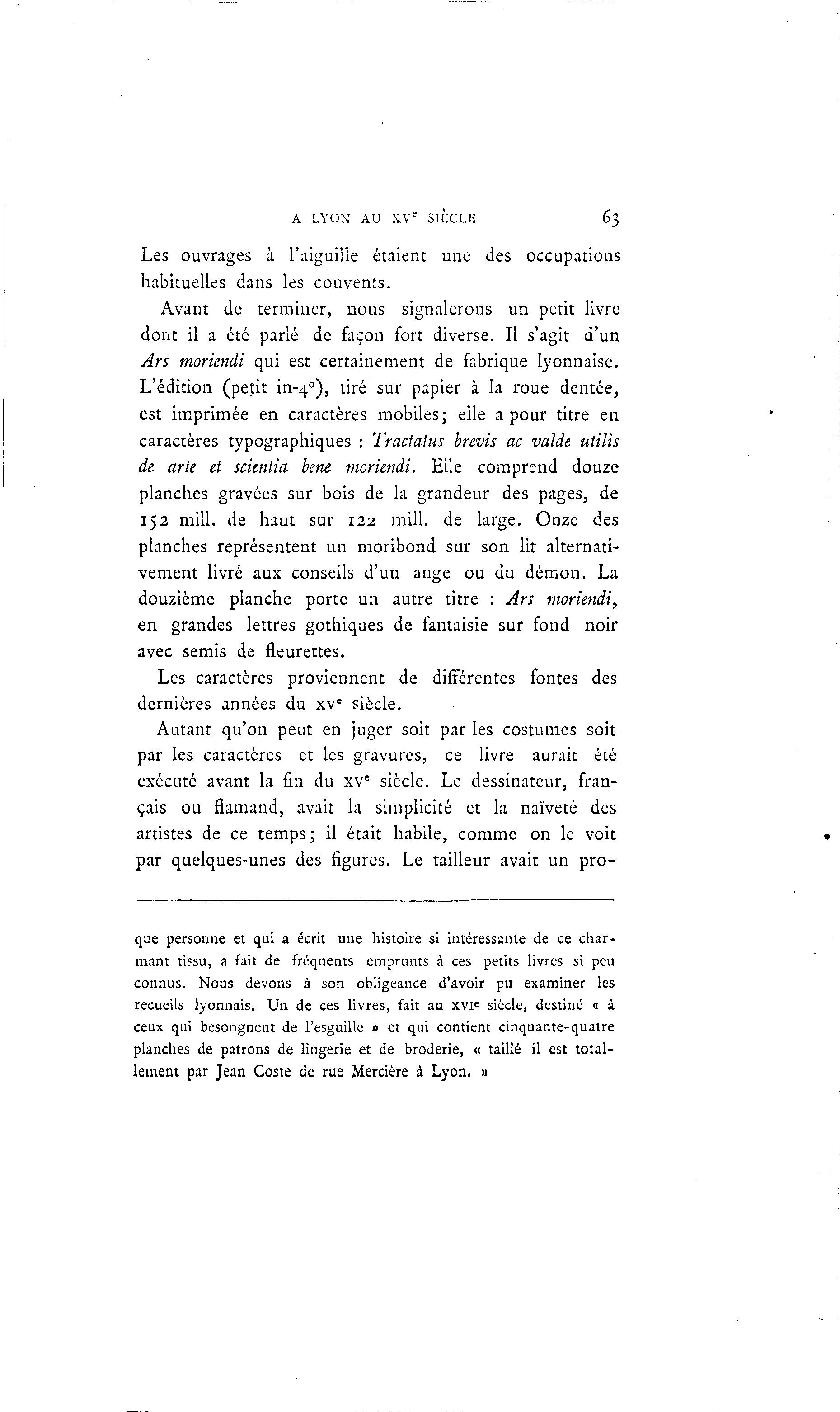 A LYON AU XVe SIÈCLE 63 Les ouvrages à l'aiguille étaient une des occupations habituelles dans les couvents. Avant de terminer, nous signalerons un petit livre dont il a été parlé de façon fort diverse. Il s'agit d'un Ars moriendi qui est certainement de fabrique lyonnaise. L'édition (petit in-4 0 ), tiré sur papier à la roue dentée, est imprimée en caractères mobiles; elle a pour titre en caractères typographiques : Tractalus brevis ac valde utilis de arle et scienlia bene moriendi. Elle comprend douze planches gravées sur bois de la grandeur des pages, de 152 mill. de haut sur 122 mill. de large. Onze des planches représentent un moribond sur son lit alternati- vement livré aux conseils d'un ange ou du démon. La douzième planche porte un autre titre : Ars moriendi, en grandes lettres gothiques de fantaisie sur fond noir avec semis de fleurettes. Les caractères proviennent de différentes fontes des dernières années du xve siècle. Autant qu'on peut en juger soit par les costumes soit par les caractères et les gravures, ce livre aurait été exécuté avant la fin du xve siècle. Le dessinateur, fran- çais ou flamand, avait la simplicité et la naïveté des artistes de ce temps ; il était habile, comme on le voit par quelques-unes des figures. Le tailleur avait un pro- que personne et qui a écrit une histoire si intéressante de ce char- mant tissu, a fait de fréquents emprunts à ces petits livres si peu connus. Nous devons à son obligeance d'avoir pu examiner les recueils lyonnais. Un de ces livres, fait au XVIe siècle, destiné « à ceux qui besongnent de l'esguille » et qui contient cinquante-quatre planches de patrons de lingerie et de broderie, « taillé il est total- lement par Jean Coste de rue Mercière à Lyon. »