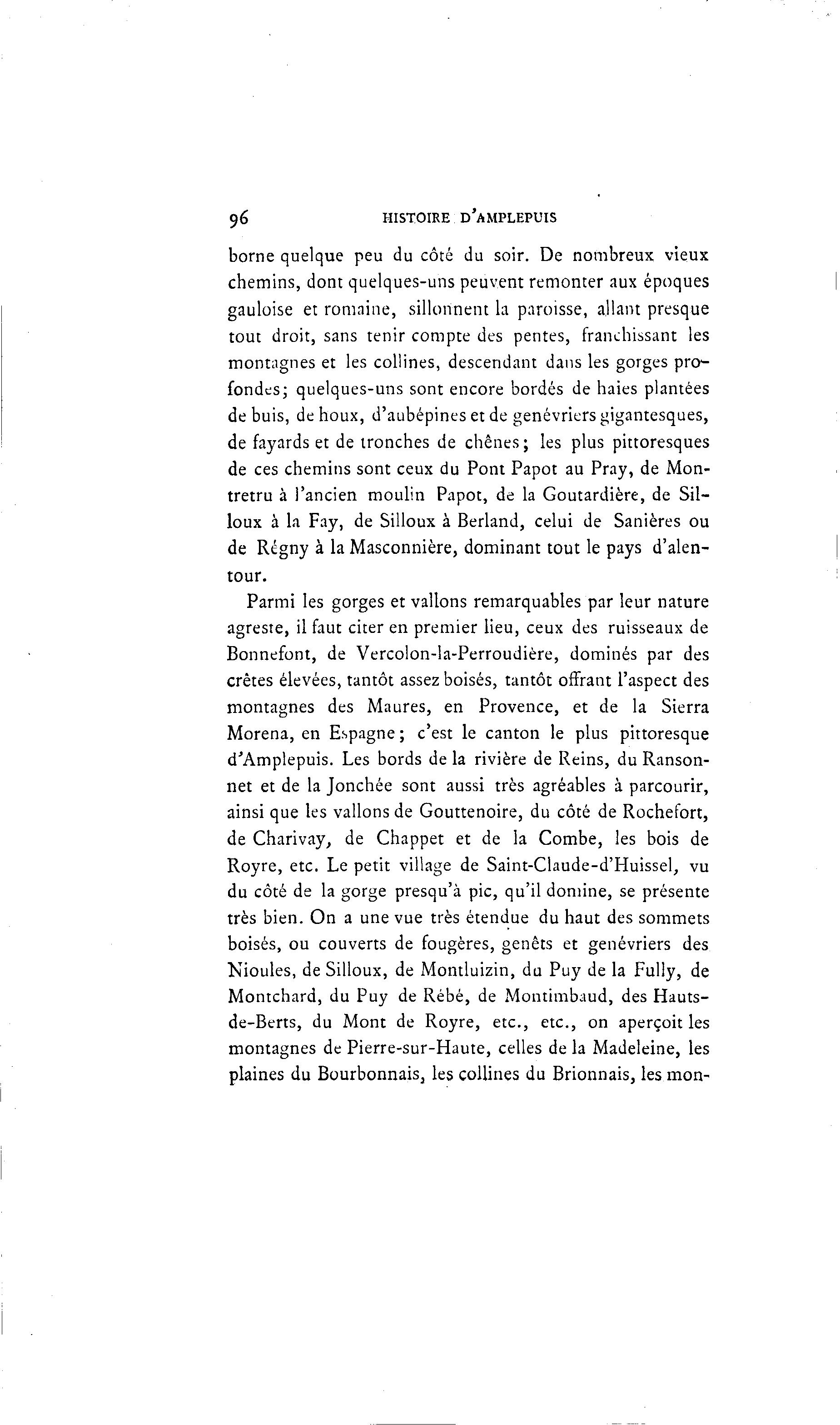 96 HISTOIRE D'AMPLEPUIS borne quelque peu du côté du soir. De nombreux vieux chemins, dont quelques-uns peuvent remonter aux époques gauloise et romaine, sillonnent la paroisse, allant presque tout droit, sans tenir compte des pentes, franchissant les montagnes et les collines, descendant dans les gorges pro- fondes; quelques-uns sont encore bordés de haies plantées de buis, de houx, d'aubépines et de genévriers gigantesques, de fayards et de tronches de chênes; les plus pittoresques de ces chemins sont ceux du Pont Papot au Pray, de Mon- tretru à l'ancien moulin Papot, de la Goutardière, de Sil- loux à la Fay, de Silloux à Berland, celui de Sanières ou de Régny à la Masconnière, dominant tout le pays d'alen- tour. Parmi les gorges et vallons remarquables par leur nature agreste, il faut citer en premier lieu, ceux des ruisseaux de Bonnefont, de Vercolon-la-Perroudière, dominés par des crêtes élevées, tantôt assez boisés, tantôt offrant l'aspect des montagnes des Maures, en Provence, et de la Sierra Morena, en Espagne; c'est le canton le plus pittoresque d'Amplepuis. Les bords de la rivière de Reins, du Ranson- net et de la Jonchée sont aussi très agréables à parcourir, ainsi que les vallons de Gouttenoire, du côté de Rochefort, de Charivay, de Chappet et de la Combe, les bois de Royre, etc. Le petit village de Saint-Claude-d'Huissel, vu du côté de la gorge presqu'à pic, qu'il domine, se présente très bien. On a une vue très étendue du haut des sommets boisés, ou couverts de fougères, genêts et genévriers des Nioules, de Silloux, de Montluizin, du Puy de la Fully, de Montchard, du Puy de Rébé, de Montimbaud, des Hauts- de-Berts, du Mont de Royre, etc., etc., on aperçoit les montagnes de Pierre-sur-Haute, celles de la Madeleine, les plaines du Bourbonnais, les collines du Brionnais, les mon-
