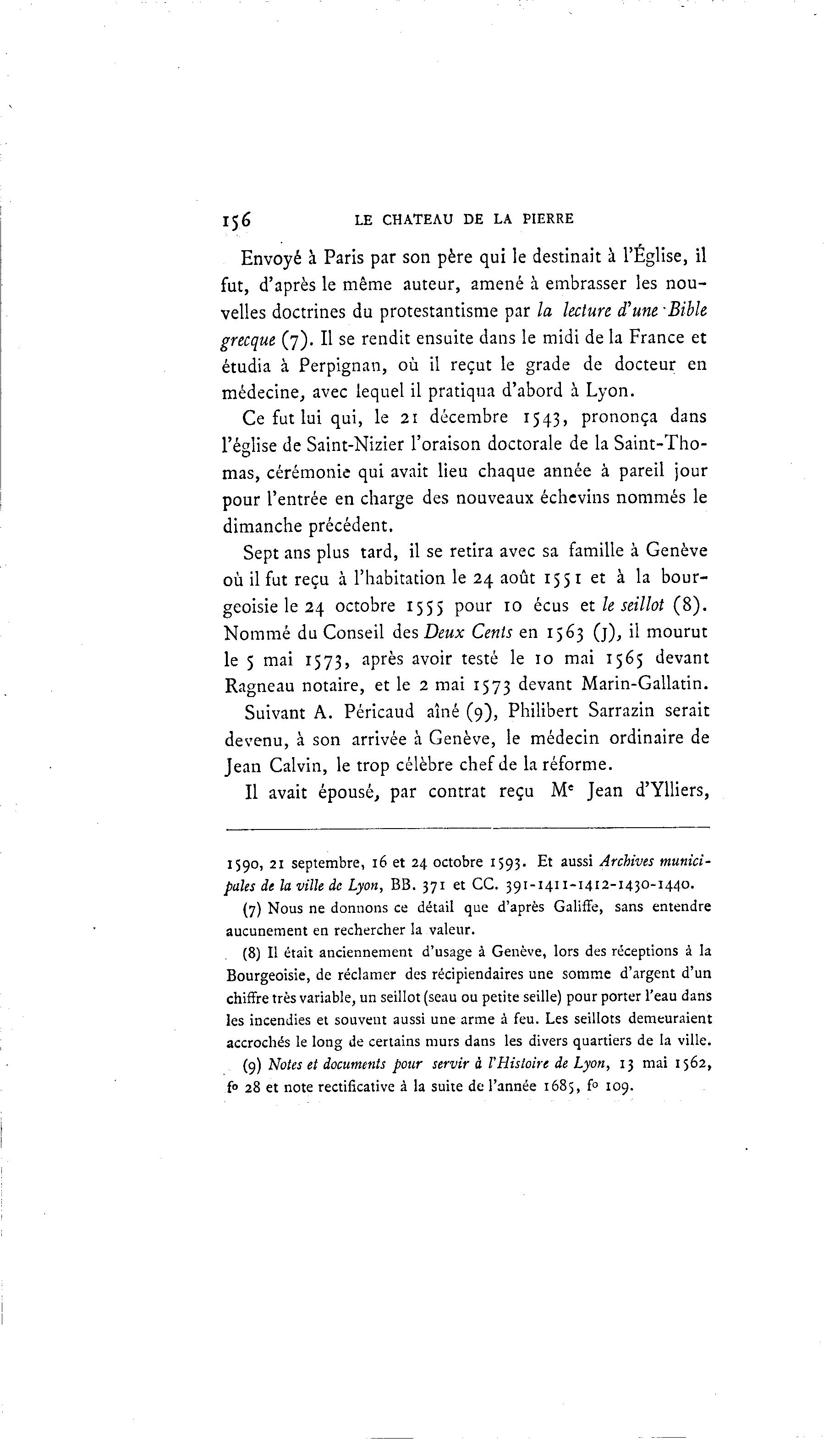 156 LE CHATEAU DE LA PIERRE Envoyé à Paris par son père qui le destinait à l'Église, il fut, d'après le même auteur, amené à embrasser les nou- velles doctrines du protestantisme par la lecture d'une -Bible grecque (7). Il se rendit ensuite dans le midi de la France et étudia à Perpignan, où il reçut le grade de docteur en médecine, avec lequel il pratiqua d'abord à Lyon. Ce fut lui qui, le 21 décembre 1543, prononça dans l'église de Saint-Nizier l'oraison doctorale de la Saint-Tho- mas, cérémonie qui avait lieu chaque année à pareil jour pour l'entrée en charge des nouveaux échevins nommés le dimanche précédent. Sept ans plus tard, il se retira avec sa famille à Genève où il fut reçu à l'habitation le 24 août 1551 et à la bour- geoisie le 24 octobre 1555 pour 10 écus et le seillot ( 8 ) . Nommé du Conseil des Deux Cents en 1563 (j), il mourut le 5 mai 1573, après avoir testé le 10 mai 1565 devant Ragneau notaire, et le 2 mai 1573 devant Marin-Gallatin. Suivant A. Péricaud aîné (9), Philibert Sarrazin serait devenu, à son arrivée à Genève, le médecin ordinaire de Jean Calvin, le trop célèbre chef de la réforme. Il avait épousé, par contrat reçu M° Jean d'Ylliers, 1590, 21 septembre, 16 et 24 octobre 1593. Et aussi Archives munici- pales de la ville de Lyon, BB. 371 et CC. 391-1411-1412-1430-1440. (7) Nous ne donnons ce détail que d'après Galiffe, sans entendre aucunement en rechercher la valeur. (8) Il était anciennement d'usage à Genève, lors des réceptions à la Bourgeoisie, de réclamer des récipiendaires une somme d'argent d'un chiffre très variable, un seillot (seau ou petite seille) pour porter l'eau dans les incendies et souvent aussi une arme à feu. Les seillots demeuraient accrochés le long de certains murs dans les divers quartiers de la ville. (9) Notes et documents pour servir à l'Histoire de Lyon, 13 mai 1562, f° 28 et note rectificative à la suite de l'année 1685, f° 109.