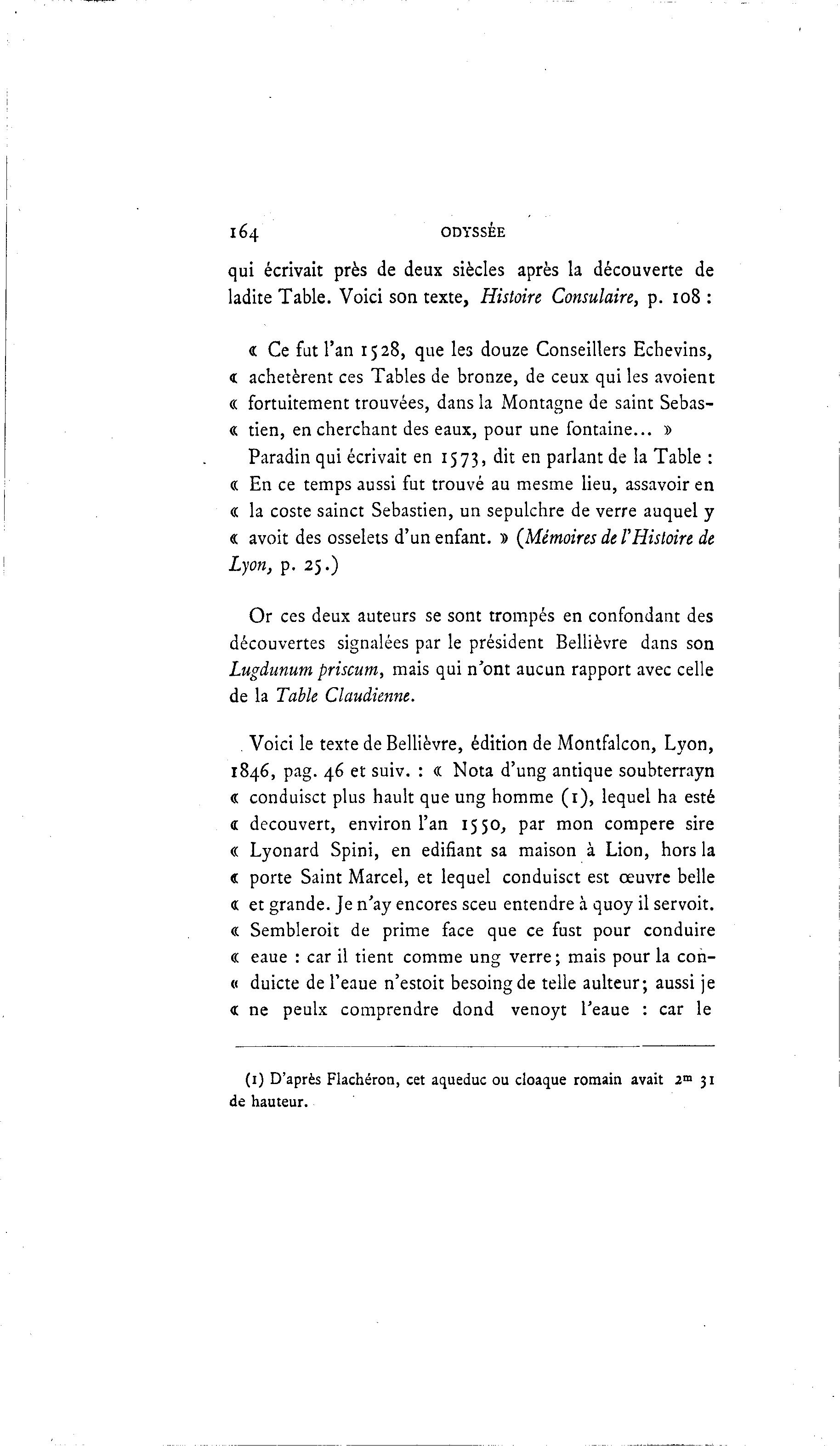 164 ODYSSÉE qui écrivait près de deux siècles après la découverte de ladite Table. Voici son texte, Histoire Consulaire, p. 108 : « Ce fut l'an 1528, que les douze Conseillers Echevins, « achetèrent ces Tables de bronze, de ceux qui les avoient « fortuitement trouvées, dans la Montagne de saint Sebas- « tien, en cherchant des eaux, pour une fontaine... » Paradin qui écrivait en 1573, dit en parlant de la Table : « En ce temps aussi fut trouvé au mesme lieu, assavoir en « la coste sainct Sebastien, un sepulchre de verre auquel y « avoit des osselets d'un enfant. » (Mémoires de l'Histoire de Lyon, p. 25.) Or ces deux auteurs se sont trompés en confondant des découvertes signalées par le président Bellièvre dans son Lugdunum priscum, mais qui n'ont aucun rapport avec celle de la Table Claudienne. Voici le texte de Bellièvre, édition de Montfalcon, Lyon, 1846, pag. 46 et suiv. : « Nota d'ung antique soubterrayn « conduisct plus hault que ung homme (1), lequel ha esté « découvert, environ l'an 1550, par mon compère sire « Lyonard Spini, en édifiant sa maison à Lion, hors la « porte Saint Marcel, et lequel conduisct est œuvre belle « et grande. Je n'ay encores sceu entendre à quoy il servoit. « Semblerait de prime face que ce fust pour conduire « eaue : car il tient comme ung verre ; mais pour la con- « duicte de l'eaue n'estoit besoingde telle aulteur; aussi je « ne peulx comprendre dond venoyt l'eaue : car le (1) D'après Flachéron, cet aqueduc ou cloaque romain avait 2m 31 de hauteur.