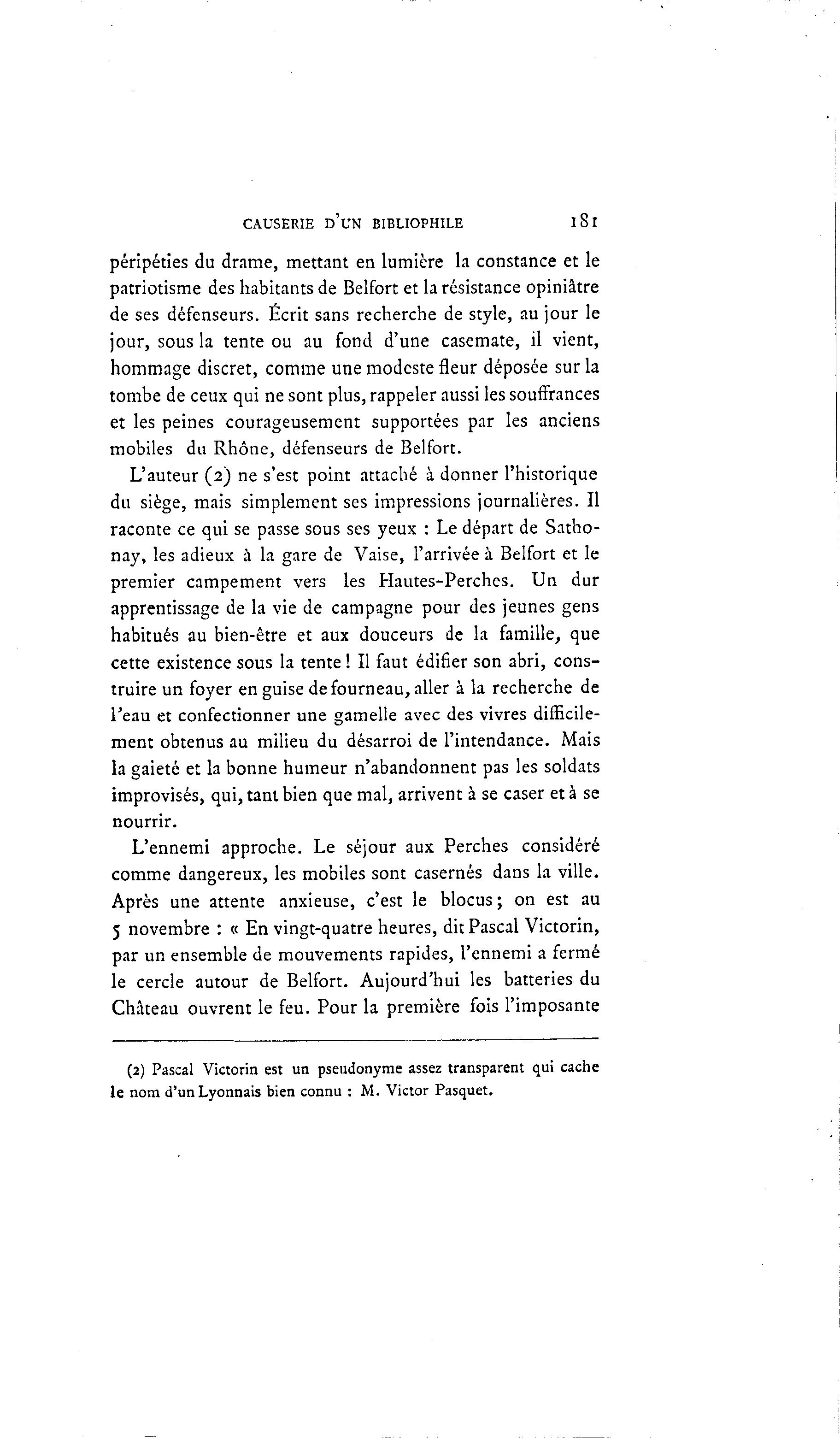 CAUSERIE D'UN BIBLIOPHILE iSr péripéties du drame, mettant en lumière la constance et le patriotisme des habitants de Belfort et la résistance opiniâtre de ses défenseurs. Écrit sans recherche de style, au jour le jour, sous la tente ou au fond d'une casemate, il vient, hommage discret, comme une modeste fleur déposée sur la tombe de ceux qui ne sont plus, rappeler aussi les souffrances et les peines courageusement supportées par les anciens mobiles du Rhône, défenseurs de Belfort. L'auteur (2) ne s'est point attaché à donner l'historique du siège, mais simplement ses impressions journalières. Il raconte ce qui se passe sous ses yeux : Le départ de Satho- nay, les adieux à la gare de Vaise, l'arrivée à Belfort et le premier campement vers les Hautes-Perches. Un dur apprentissage de la vie de campagne pour des jeunes gens habitués au bien-être et aux douceurs de la famille, que cette existence sous la tente ! Il faut édifier son abri, cons- truire un foyer en guise de fourneau, aller à la recherche de l'eau et confectionner une gamelle avec des vivres difficile- ment obtenus au milieu du désarroi de l'intendance. Mais la gaieté et la bonne humeur n'abandonnent pas les soldats improvisés, qui, tant bien que mal, arrivent à se caser et à se nourrir. L'ennemi approche. Le séjour aux Perches considéré comme dangereux, les mobiles sont casernes dans la ville. Après une attente anxieuse, c'est le blocus ; on est au 5 novembre : « En vingt-quatre heures, dit Pascal Victorin, par un ensemble de mouvements rapides, l'ennemi a fermé le cercle autour de Belfort. Aujourd'hui les batteries du Château ouvrent le feu. Pour la première fois l'imposante (2) Pascal Victorin est un pseudonyme assez transparent qui cache le nom d'un Lyonnais bien connu : M. Victor Pasquet.