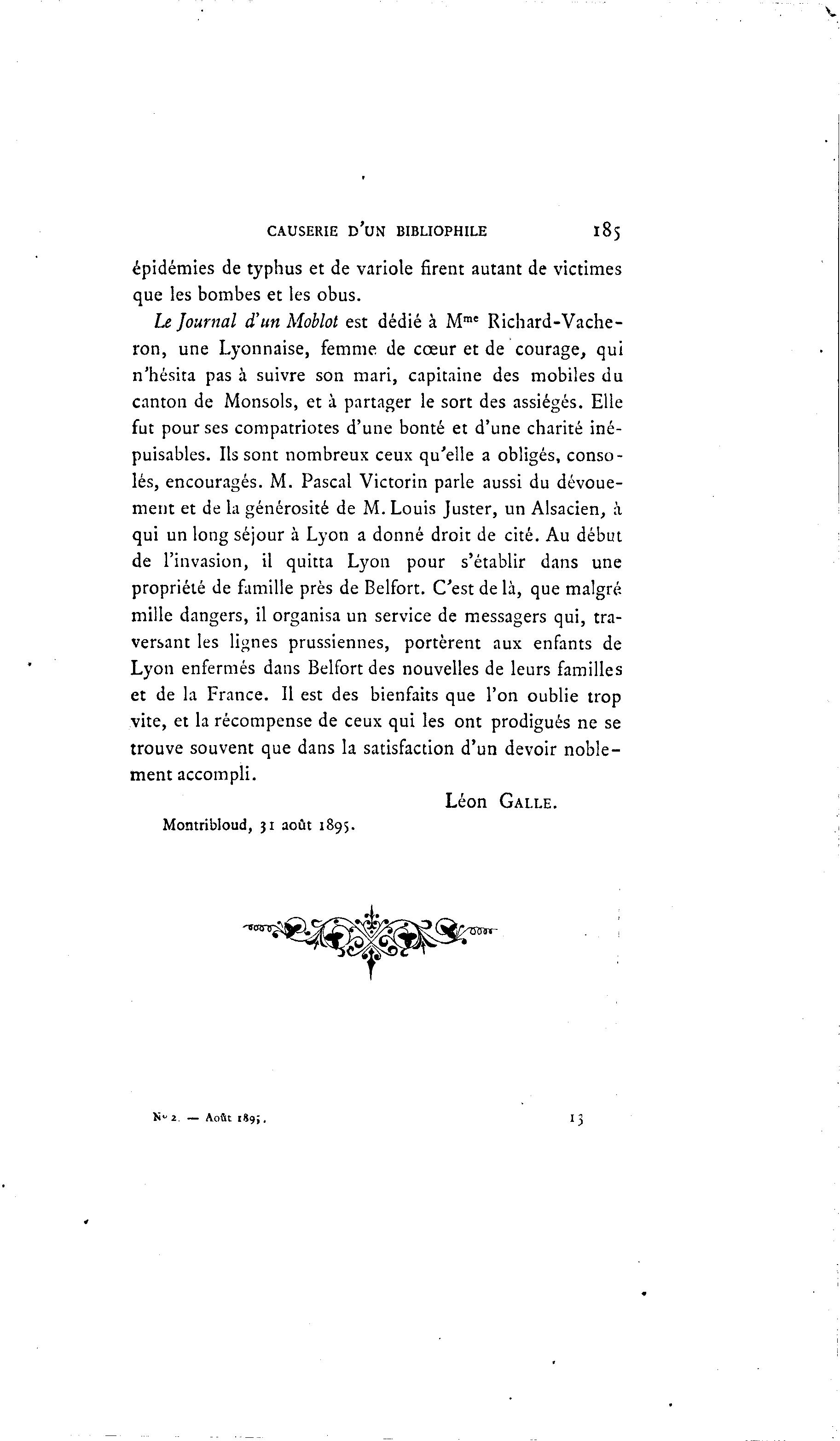 CAUSERIE D'UN BIBLIOPHILE 185 épidémies de typhus et de variole firent autant de victimes que les bombes et les obus. Le Journal d'unMoblot est dédié à Mme Richard-Vache- ron, une Lyonnaise, femme de cœur et de courage, qui n'hésita pas à suivre son mari, capitaine des mobiles du canton de Monsols, et à partager le sort des assiégés. Elle fut pour ses compatriotes d'une bonté et d'une charité iné- puisables. Ils sont nombreux ceux qu'elle a obligés, conso- lés, encouragés. M. Pascal Victorin parle aussi du dévoue- ment et de la générosité de M. Louis Juster, un Alsacien, à qui un long séjour à Lyon a donné droit de cité. Au début de l'invasion, il quitta Lyon pour s'établir dans une propriété de famille près de Belfort. C'est de là , que malgré mille dangers, il organisa un service de messagers qui, tra- versant les lignes prussiennes, portèrent aux enfants de Lyon enfermés dans Belfort des nouvelles de leurs familles et de la France. Il est des bienfaits que l'on oublie trop vite, et la récompense de ceux qui les ont prodigués ne se trouve souvent que dans la satisfaction d'un devoir noble- ment accompli. Léon GALLE. Montribloud, 31 août 1895. -^^^m^- K" 2 — Août 1 8 9 ; . 13