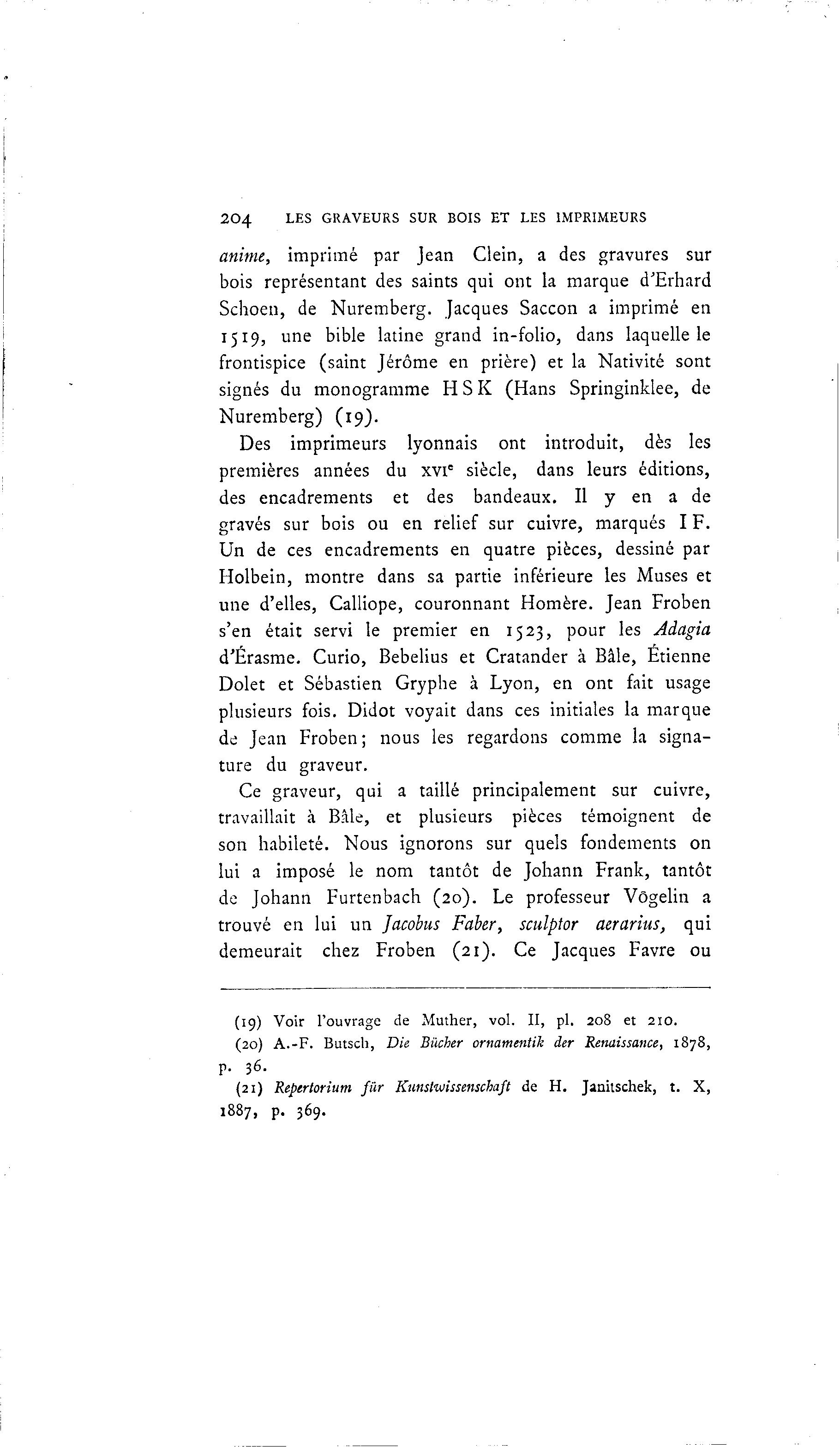 204 LES GRAVEURS SUR BOIS ET LES IMPRIMEURS anime, imprimé par Jean Clein, a des gravures sur bois représentant des saints qui ont la marque d'Erhard Schoeu, de Nuremberg. Jacques Saccon a imprimé en 1519, une bible latine grand in-folio, dans laquelle le frontispice (saint Jérôme en prière) et la Nativité sont signés du monogramme H S K (Hans Springinldee, de Nuremberg) (19). Des imprimeurs lyonnais ont introduit, dès les premières années du xvi c siècle, dans leurs éditions, des encadrements et des bandeaux. Il y en a de gravés sur bois ou en relief sur cuivre, marqués I F. Un de ces encadrements en quatre pièces, dessiné par Holbein, montre dans sa partie inférieure les Muses et une d'elles, Calliope, couronnant Homère. Jean Froben s'en était servi le premier en 1523, pour les Adagia d'Érasme. Curio, Bebelius et Cratander à Bâle, Etienne Dolet et Sébastien Gryphe à Lyon, en ont fait usage plusieurs fois. Didot voyait dans ces initiales la marque de Jean Froben ; nous les regardons comme la signa- ture du graveur. Ce graveur, qui a taillé principalement sur cuivre, travaillait à Bâle, et plusieurs pièces témoignent de son habileté. Nous ignorons sur quels fondements on lui a imposé le nom tantôt de Johann Frank, tantôt de Johann Furtenbach (20). Le professeur Vôgelin a trouvé en lui un Jacobus Faber, sculptor acrarius, qui demeurait chez Froben (21). Ce Jacques Favre ou (19) Voir l'ouvrage de Muther, vol. II, pi. 208 et 210. (20) A . - F . Butsch, Die Bûcher ornamentih der Renaissance, 1878, p. 36. (21) Répertoriant fur Kunsluiissenscbaft de H. Janitschek, t. X, 1887, p. 369.