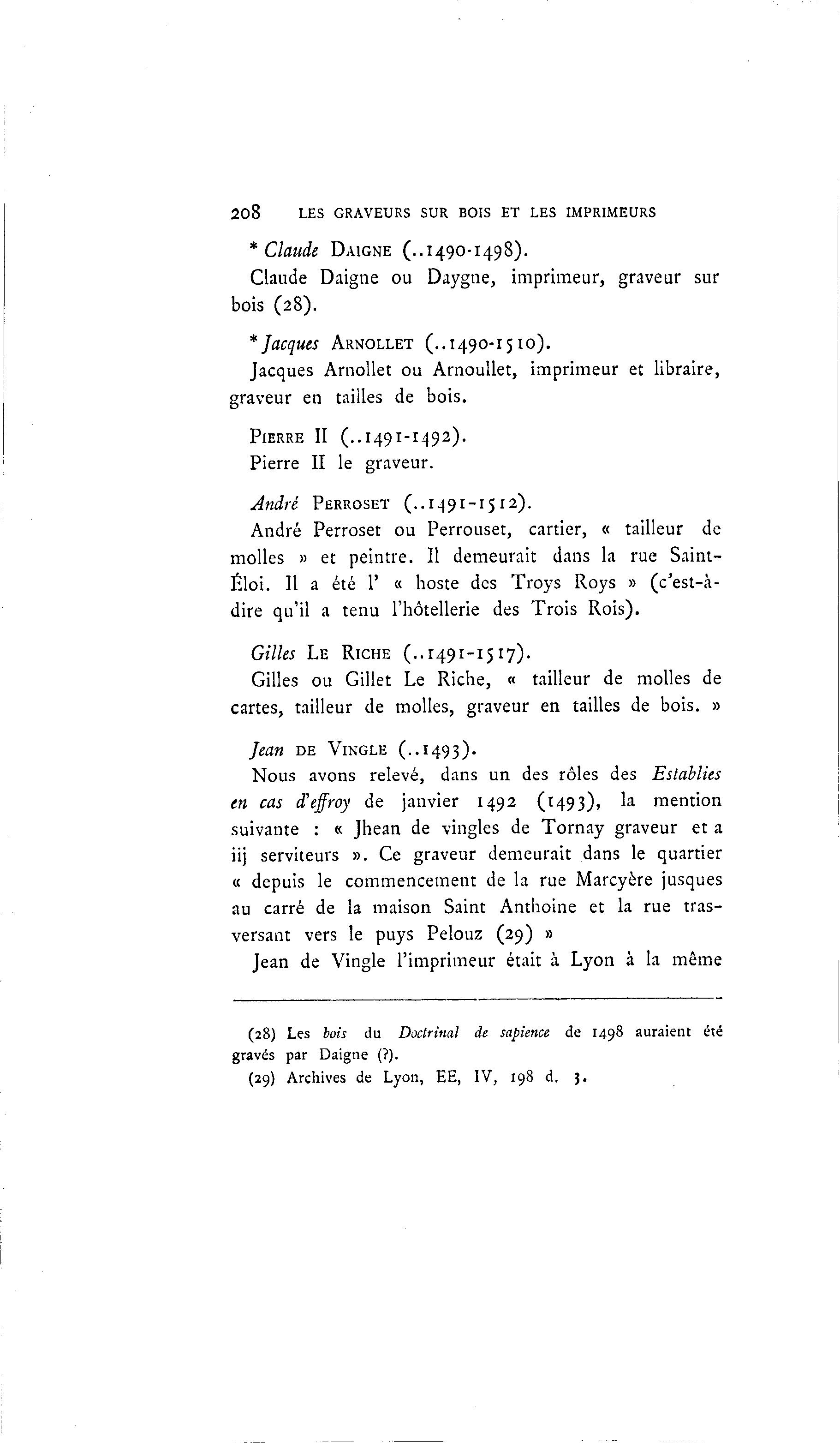 208 LES GRAVEURS SUR BOIS ET LES IMPRIMEURS * Claude DAIGNE (..1490-1498). Claude Daigne ou Daygne, imprimeur, graveur sur bois (28). * Jacques ARNOLLET (..1490-1510). Jacques Arnollet ou Arnoullet, imprimeur et libraire, graveur en tailles de bois. PIERRE II (..1491-1492). Pierre II le graveur. André PERROSET (..1491-1512). André Perroset ou Perrouset, cartier, « tailleur de molles » et peintre. Il demeurait dans la rue Saint- Éloi. Il a été 1' « hoste des Troys Roys » (c'est-à - dire qu'il a tenu l'hôtellerie des Trois Rois). Gilles L E RICHE (..1491-1517). Gilles ou Gillet Le Riche, « tailleur de molles de cartes, tailleur de molles, graveur en tailles de bois. » Jean DE VINGLE (..1493). Nous avons relevé, dans un des rôles des Eslablies en cas d'effroy de janvier 1492 (1493), la mention suivante : « Jhean de vingles de Tornay graveur et a iij serviteurs ». Ce graveur demeurait dans le quartier « depuis le commencement de la rue Marcyère jusques au carré de la maison Saint Anthoine et la rue tras- versant vers le puys Pelouz (29) » Jean de Vingle l'imprimeur était à Lyon à la même (28) Les bois du Doctrinal de sapience de 1498 auraient été gravés par Daigne (?). (29) Archives de Lyon, EE, IV, 198 d. 3.