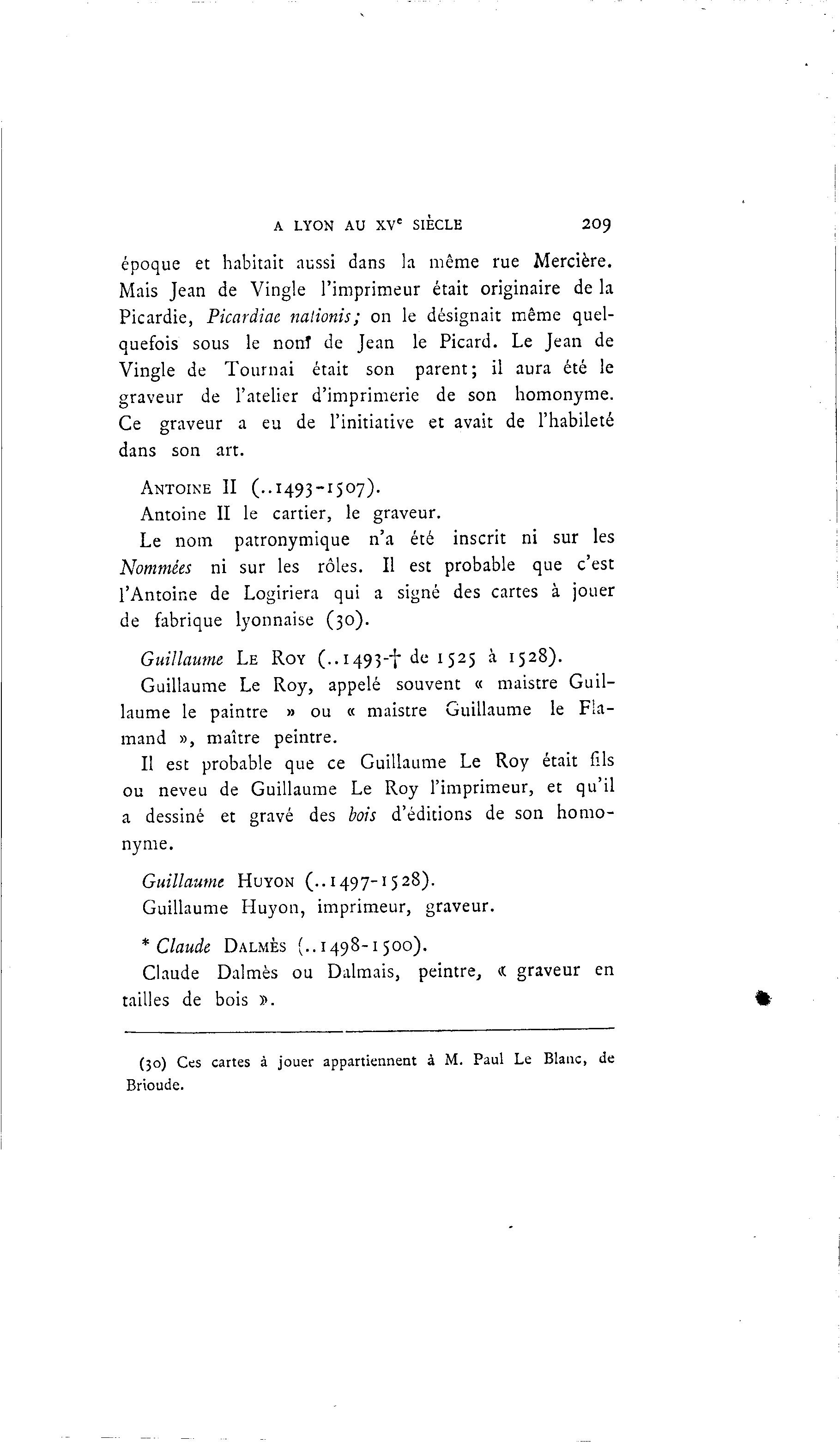 A LYON AU XVe SIECLE 209 époque et habitait aussi dans la même rue Mercière. Mais Jean de Vingle l'imprimeur était originaire de la Picardie, Picardiae nalionis; on le désignait même quel- quefois sous le non! de Jean le Picard. Le Jean de Vingle de Tournai était son parent ; il aura été le graveur de l'atelier d'imprimerie de son homonyme. Ce graveur a eu de l'initiative et avait de l'habileté dans son art. ANTOINE II (..1493-1507). Antoine II le cartier, le graveur. Le nom patronymique n'a été inscrit ni sur les Nommées ni sur les rôles. Il est probable que c'est l'Antoine de Logiriera qui a signé des cartes à jouer de fabrique lyonnaise (30). Guillaume LE ROY (..1493-f de 1 525 à 1528). Guillaume Le Roy, appelé souvent « maistre Guil- laume le paintre » ou « maistre Guillaume le Fla- mand », maître peintre. Il est probable que ce Guillaume Le Roy était fils ou neveu de Guillaume Le Roy l'imprimeur, et qu'il a dessiné et gravé des bois d'éditions de son homo- nyme. Guillaume HUYON (..1497-1528). Guillaume Huyon, imprimeur, graveur. * Claude DALMÈS (..1498-1 500). Claude Dalmès ou Dalmais, peintre, « graveur en tailles de bois ». (30) Ces cartes à jouer appartiennent à M. Paul Le Blanc, de Brioude.