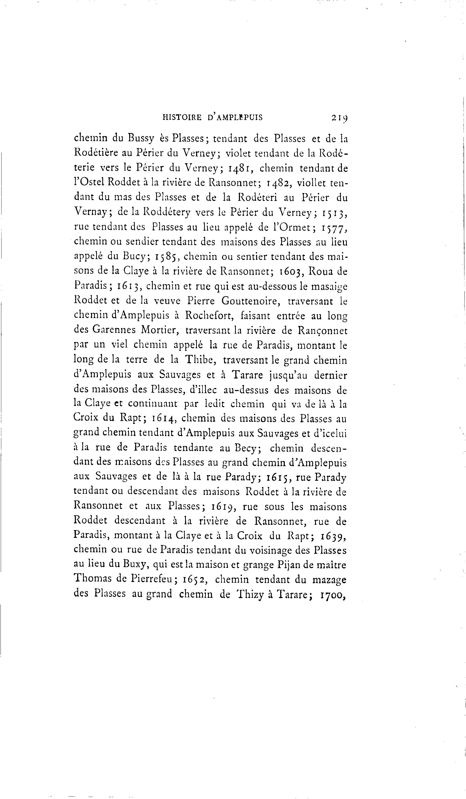 HISTOIRE D'AMPLBPUIS 219 chemin du Bussy es Plasses; tendant des Plasses et de la Rodétière au Périer du Verney; violet tendant de la Rodé- terie vers le Périer du Verney; 1481, chemin tendant de l'Ostel Roddet à la rivière de Ransonnet; 1482, viollet ten- dant du mas des Plasses et de la Rodéteri au Périer du Vernay; de la Roddétery vers le Périer du Verney; 1513, rue tendant des Plasses au lieu appelé de l'Ormet ; 1577, chemin ou sendier tendant des maisons des Plasses au lieu appelé du Bucy; 1585, chemin ou sentier tendant des mai- sons de la Claye à la rivière de Ransonnet; 1603, Roua de Paradis; 1613, chemin et rue qui est au-dessous le masaige Roddet et de la veuve Pierre Gouttenoire, traversant le chemin d'Amplepuis à Rochefort, faisant entrée au long des Garennes Mortier, traversant la rivière de Rançonnet par un viel chemin appelé la rue de Paradis, montant le long de la terre de la Thibe, traversant le grand chemin d'Amplepuis aux Sauvages et à Tarare jusqu'au dernier des maisons des Plasses, d'illec au-dessus des maisons de la Claye et continuant par ledit chemin qui va de là à la Croix du Rapt; 1614, chemin des maisons des Plasses au grand chemin tendant d'Amplepuis aux Sauvages et d'icelui à la rue de Paradis tendante au Becy; chemin descen- dant des maisons des Plasses au grand chemin d'Amplepuis aux Sauvages et de là à la rue Parady; 1615, rue Parady tendant ou descendant des maisons Roddet à la rivière de Ransonnet et aux Plasses; 1619, rue sous les maisons Roddet descendant à la rivière de Ransonnet, rue de Paradis, montant à la Claye et à la Croix du Rapt; 1639, chemin ou rue de Paradis tendant du voisinage des Plasses au lieu du Buxy, qui est la maison et grange Pijan de maître Thomas de Pierrefeu ; 1652, chemin tendant du mazage des Plasses au grand chemin de Thizy à Tarare; 1700,