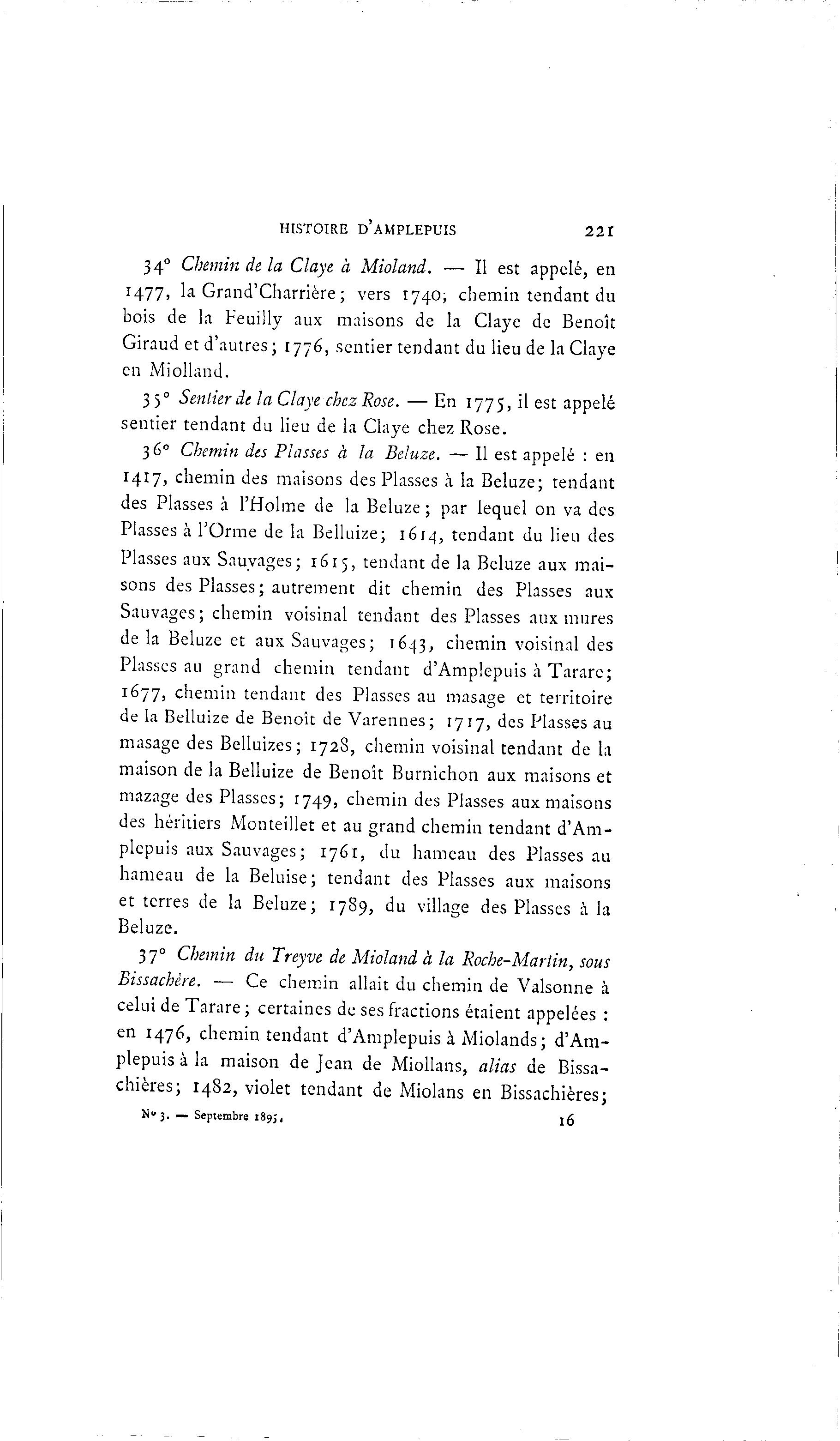 HISTOIRE D ' A M P L E P L ' I S 221 34° Chemin de la Claye à Mioland. — Il est appelé, en 1477, la Grand'Charrière; vers 1740, chemin tendant du bois de la Feuilly aux maisons de la Claye de Benoît Giraud et d'autres ; 177e, sentier tendant du lieu de la Claye en Miolland. 35 0 Sentier de la Claye chez Rose. — En 1775, il est appelé sentier tendant du lieu de la Claye chez Rose. 3 6° Chemin des Fiasses a la Beluze. — Il est appelé : en 1417, chemin des maisons des Plasses à la Beluze; tendant des Plasses à l'Holme de la Beluze ; par lequel on va des Plasses à l'Orme de la Belluize; 1614, tendant du lieu des Plasses aux Sauvages; 1615, tendant de la Beluze aux mai- sons des Plasses; autrement dit chemin des Plasses aux Sauvages; chemin voisinai tendant des Plasses aux mures de la Beluze et aux Sauvages; 1643, chemin voisinai des Plasses au grand chemin tendant d'Amplepuis à Tarare; 1677, chemin tendant des Plasses au inasage et territoire de la Belluize de Benoît de Varennes; 1717, des Plasses au masage des Belluizes; 1728, chemin voisinai tendant de la maison de la Belluize de Benoît Burnichon aux maisons et mazage des Plasses; 1749, chemin des Plasses aux maisons des héritiers Monteillet et au grand chemin tendant d'Am- plepuis aux Sauvages; 1761, du hameau des Plasses au hameau de la Beluise; tendant des Plasses aux maisons et terres de la Beluze; 1789, du village des Plasses à la Beluze. 37 0 Chemin du Treyve de Mioland à la Roche-Martin, sous Bissachère. — Ce chemin allait du chemin de Valsonne à celui de Tarare; certaines de ses fractions étaient appelées : en 1476, chemin tendant d'Amplepuis à Miolands; d'Am- plepuis à la maison de Jean de Miollans, alias de Bissa- chières; 1482, violet tendant de Miolans en Bissachières; N " 3 . — Septembre 1895, l6