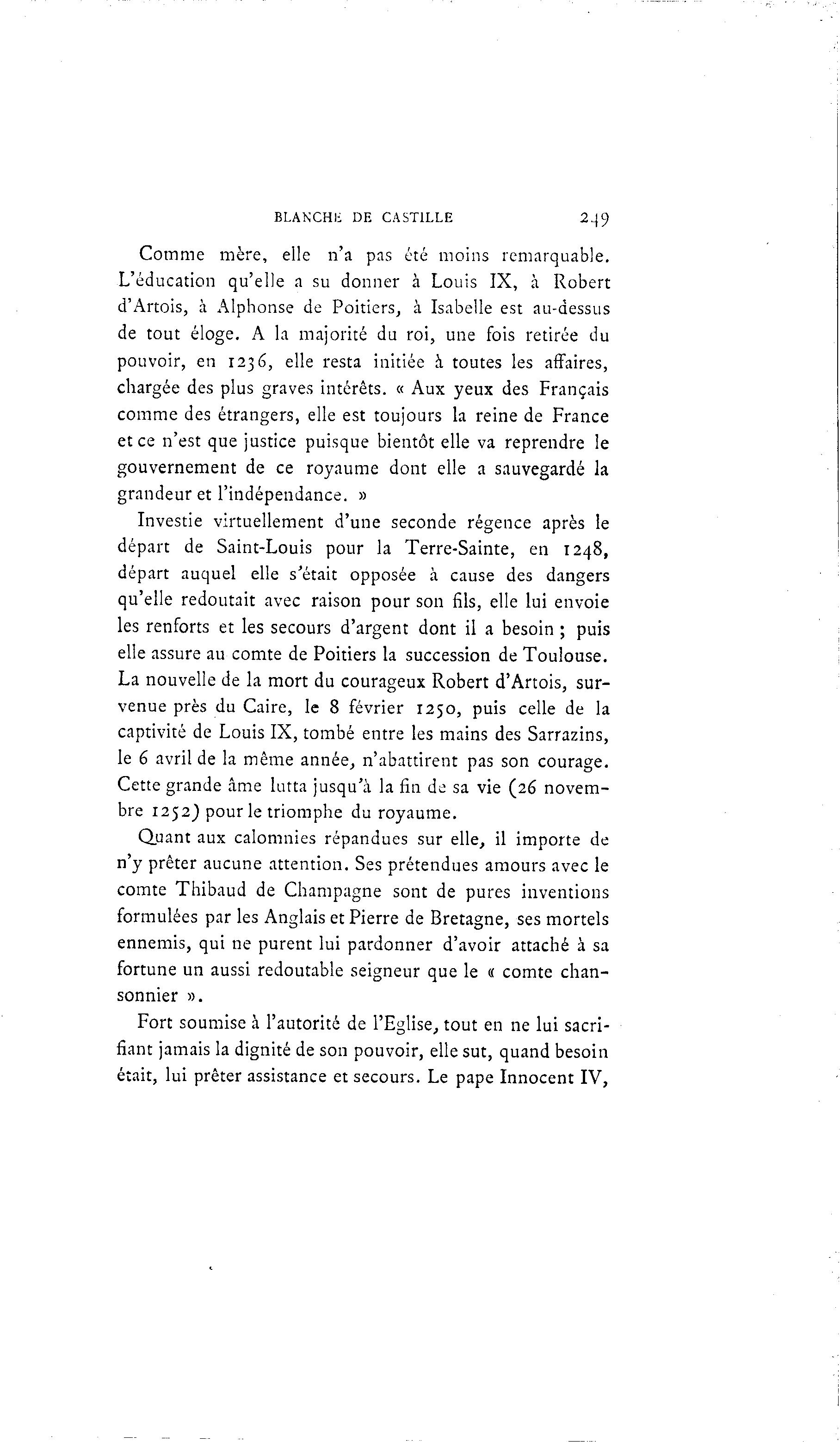 BLANCHI- DE CAST1LLE 2^9 Comme mère, elle n'a pas été moins remarquable. L'éducation qu'elle a su donner à Louis IX, à Robert d'Artois, à Alphonse de Poitiers, à Isabelle est au-dessus de tout éloge. A la majorité du roi, une fois retirée du pouvoir, en 1236, elle resta initiée à toutes les affaires, chargée des plus graves intérêts. « Aux yeux des Français comme des étrangers, elle est toujours la reine de France et ce n'est que justice puisque bientôt elle va reprendre le gouvernement de ce royaume dont elle a sauvegardé la grandeur et l'indépendance. » Investie virtuellement d'une seconde régence après le départ de Saint-Louis pour la Terre-Sainte, en 1248, départ auquel elle s'était opposée à cause des dangers qu'elle redoutait avec raison pour son fils, elle lui envoie les renforts et les secours d'argent dont il a besoin ; puis elle assure au comte de Poitiers la succession de Toulouse. La nouvelle de la mort du courageux Robert d'Artois, sur- venue près du Caire, le 8 février 1250, puis celle de la captivité de Louis IX, tombé entre les mains des Sarrazins, le 6 avril de la même année, n'abattirent pas son courage. Cette grande âme lutta jusqu'à la fin de sa vie (26 novem- bre 1252) pour le triomphe du royaume. Quant aux calomnies répandues sur elle, il importe de n'y prêter aucune attention. Ses prétendues amours avec le comte Thibaud de Champagne sont de pures inventions formulées par les Anglais et Pierre de Bretagne, ses mortels ennemis, qui ne purent lui pardonner d'avoir attaché à sa fortune un aussi redoutable seigneur que le « comte chan- sonnier ». Fort soumise à l'autorité de l'Eglise, tout en ne lui sacri- fiant jamais la dignité de son pouvoir, elle sut, quand besoin était, lui prêter assistance et secours. Le pape Innocent IV,