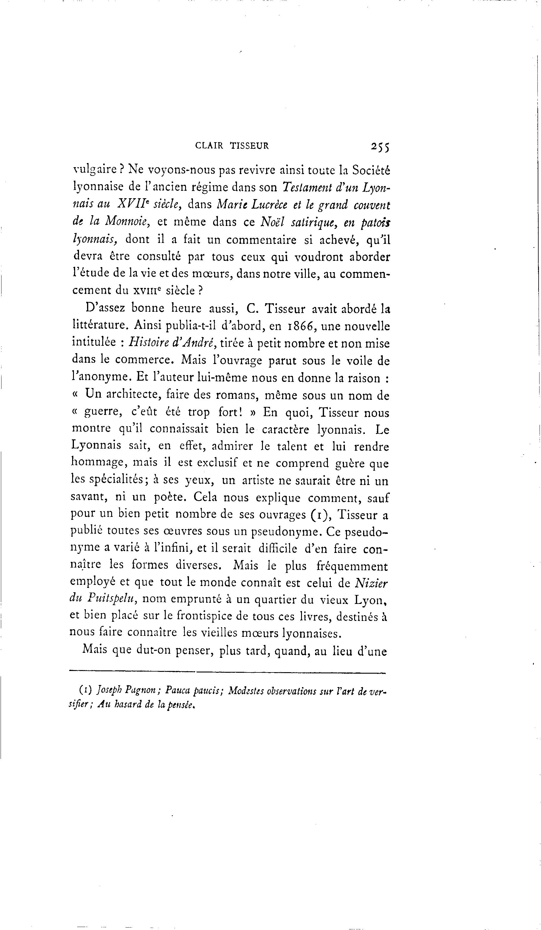 CLAIR TISSEUR 255 vulgaire ? Ne voyons-nous pas revivre ainsi toute la Société lyonnaise de l'ancien régime dans son Testament d'un Lyon- nais au XVIIe siècle, dans Marie Lucrèce et le grand couvent de la Monnoie, et même dans ce Noël satirique, en patois lyonnais, dont il a fait un commentaire si achevé, qu'il devra être consulté par tous ceux qui voudront aborder l'étude de la vie et des mœurs, dans notre ville, au commen- cement du xvm e siècle ? D'assez bonne heure aussi, C. Tisseur avait abordé la littérature. Ainsi publia-t-il d'abord, en 1866, une nouvelle intitulée : Histoire d'André, tirée à petit nombre et non mise dans le commerce. Mais l'ouvrage parut sous le voile de l'anonyme. Et l'auteur lui-même nous en donne la raison : « Un architecte, faire des romans, même sous un nom de « guerre, c'eût été trop fort! » En quoi, Tisseur nous montre qu'il connaissait bien le caractère lyonnais. Le Lyonnais sait, en effet, admirer le talent et lui rendre hommage, mais il est exclusif et ne comprend guère que les spécialités; à ses yeux, un artiste ne saurait être ni un savant, ni un poète. Cela nous explique comment, sauf pour un bien petit nombre de ses ouvrages (1), Tisseur a publié toutes ses œuvres sous un pseudonyme. Ce pseudo- nyme a varié à l'infini, et il serait difficile d'en faire con- naître les formes diverses. Mais le plus fréquemment employé et que tout le monde connaît est celui de Nizier du Puitspelu, nom emprunté à un quartier du vieux Lyon, et bien placé sur le frontispice de tous ces livres, destinés à nous faire connaître les vieilles mœurs lyonnaises. Mais que dut-on penser, plus tard, quand, au lieu d'une (1) Joseph Pugnon; Pauca paucis; Modestes observations sur t'art de ver- sifier ; Au hasard de h pensée.