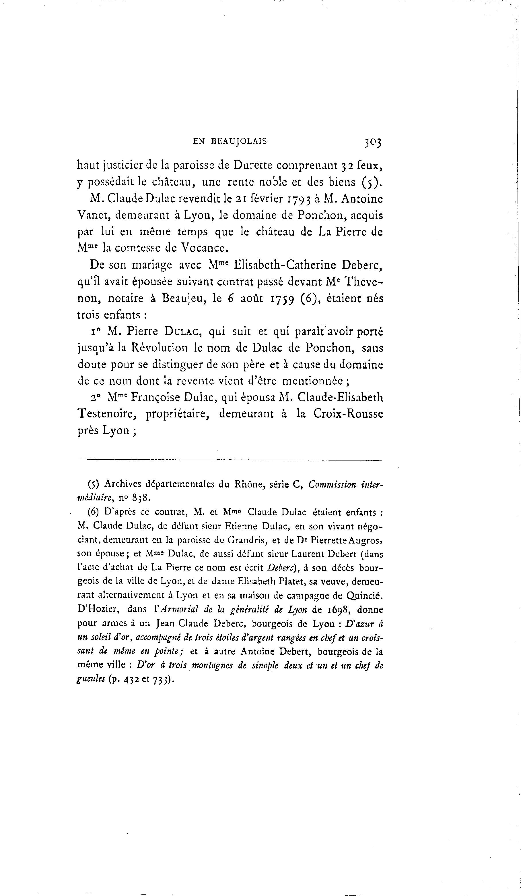 EN BEAUJOLAIS 303 haut justicier de la paroisse de Durette comprenant 32 feux, y possédait le château, une rente noble et des biens (5). M. Claude Dulac revendit le 21 février 1793 à M. Antoine Vanet, demeurant à Lyon, le domaine de Ponchon, acquis par lui en même temps que le château de La Pierre de Mme la comtesse de Vocance. De son mariage avec Mme Elisabeth-Catherine Deberc, qu'il avait épousée suivant contrat passé devant Me Theve- non, notaire à Beaujeu, le 6 août 1759 (6), étaient nés trois enfants : i° M. Pierre DULAC, qui suit et qui paraît avoir porté jusqu'à la Révolution le nom de Dulac de Ponchon, sans doute pour se distinguer de son père et à cause du domaine de ce nom dont la revente vient d'être mentionnée ; 2° Mme Françoise Dulac, qui épousa M. Claude-Elisabeth Testenoire, propriétaire, demeurant à la Croix-Rousse près Lyon ; (5) Archives départementales du Rhône, série C, Commission inter- médiaire, n° 838. (6) D'après ce contrat, M. et M™ Claude Dulac étaient enfants : M. Claude Dulac, de défunt sieur Etienne Dulac, en son vivant négo- ciant, demeurant en la paroisse de Grandris, et de D e Pierrette Augros. son épouse ; et Mme Dulac, de aussi défunt sieur Laurent Debert (dans l'acte d'achat de La Pierre ce nom est écrit Deberc), à son décès bour- geois de la ville de Lyon, et de dame Elisabeth Platet, sa veuve, demeu- rant alternativement à Lyon et en sa maison de campagne de Quincié. D'Hozier, dans l'Armoriai de la généralité de Lyon de 1698, donne pour armes à un Jean-Claude Deberc, bourgeois de Lyon : D'azur à un soleil d'or, accompagné de trois étoiles d'argent rangées en chef et un crois- sant de même en pointe ; et à autre Antoine Debert, bourgeois de la même ville : D'or à trois montagnes de sinople deux et un et un chej de gueules (p. 432 et 733).