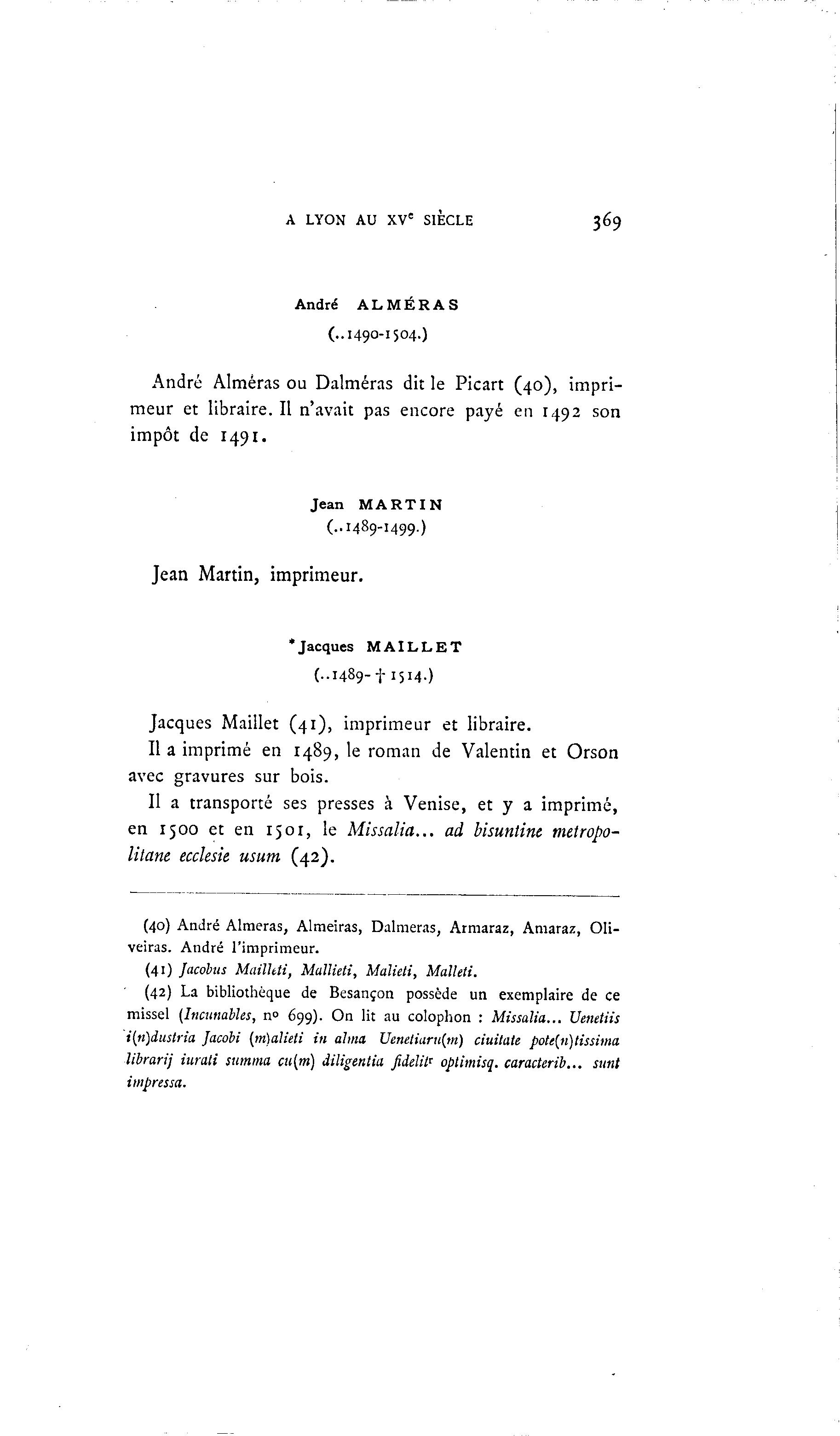 A LYON AU XVe SIECLE 369 André ALMÉRAS (..1490-1504.) André Aimeras ou Dalméras dit le Picart (40), impri- meur et libraire. Il n'avait pas encore payé en 1492 son impôt de 1491. Jean M A R T I N (..1489-1499.) Jean Martin, imprimeur. 'Jacques MAILLET (..1489--J-1514.) Jacques Maillet (40> imprimeur et libraire. Il a imprimé en 1489, le roman de Valentin et Orson avec gravures sur bois. Il a transporté ses presses à Venise, et y a imprimé, en 1500 et en 1501, le Missalia... ad bisunlinc métropo- litain eccksie usum (42). (40) André Aimeras, Almeiras, Dalméras, Armaraz, Amaraz, Oli- veiras. André l'imprimeur. (41) Jacobus Mailhti, Mallieti, Malieti, Malleti. (42) La bibliothèque de Besançon possède un exemplaire de ce missel (Incunables, n° 699). On lit au colophon : Missalia... Uenetiis i(n)dustria Jacobi (m)alieti in aima Uenetiaru{m) ciuitate pote(n)tissima librarij iurati summa cu(m) diligentia fidelit' optimisq. caracterib... sunt impressa.