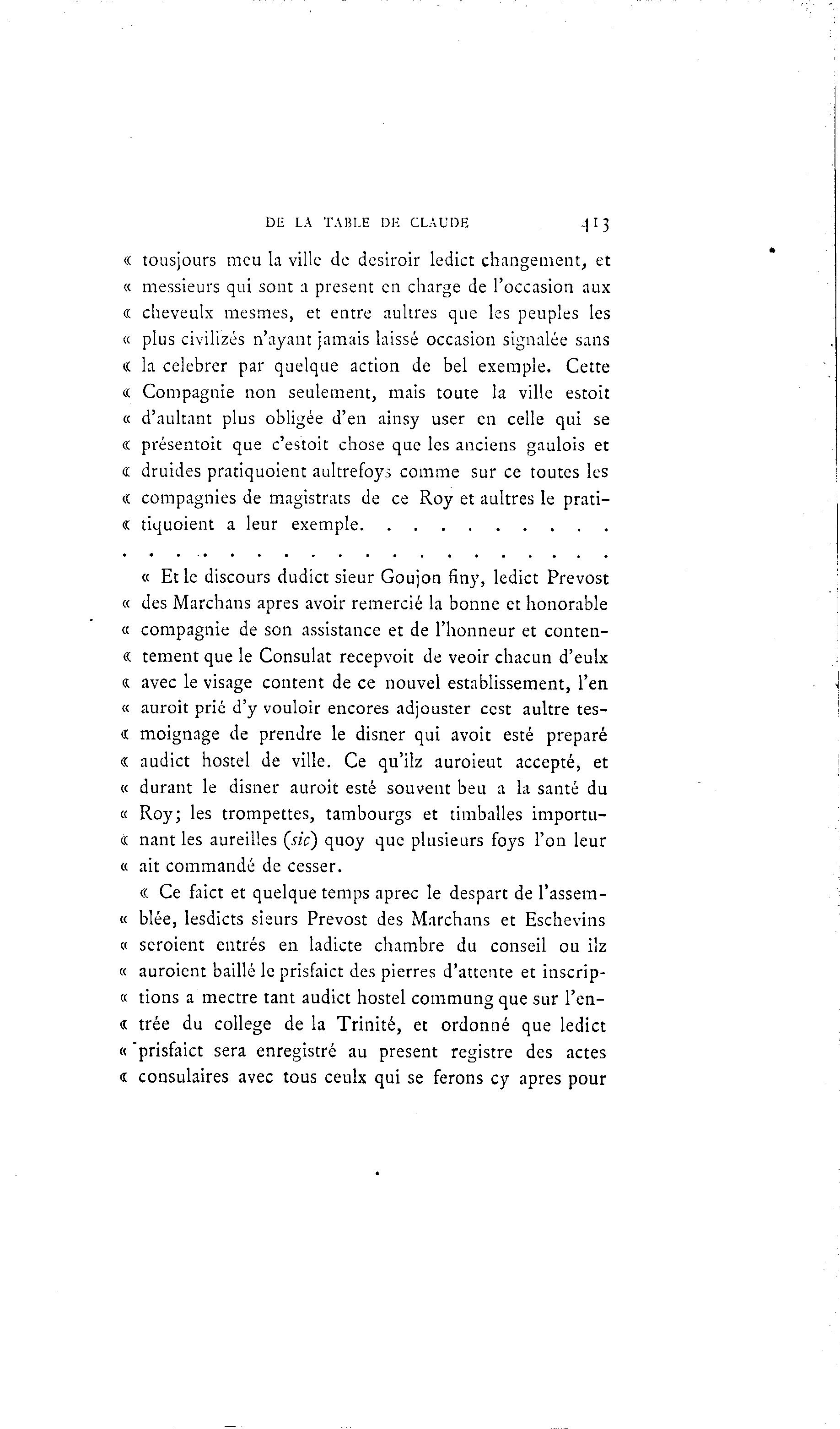 DE LA TABLE DE CLAUDE 4I3 « tousjours meu la ville de desiroir ledict changement, et « messieurs qui sont a présent en charge de l'occasion aux « cheveulx mesmes, et entre aultres que les peuples les « plus civilizés n'ayant jamais laissé occasion signalée sans « la célébrer par quelque action de bel exemple. Cette « Compagnie non seulement, mais toute la ville estoit « d'aultant plus obligée d'en ainsy user en celle qui se « présentoit que c'estoit chose que les anciens gaulois et