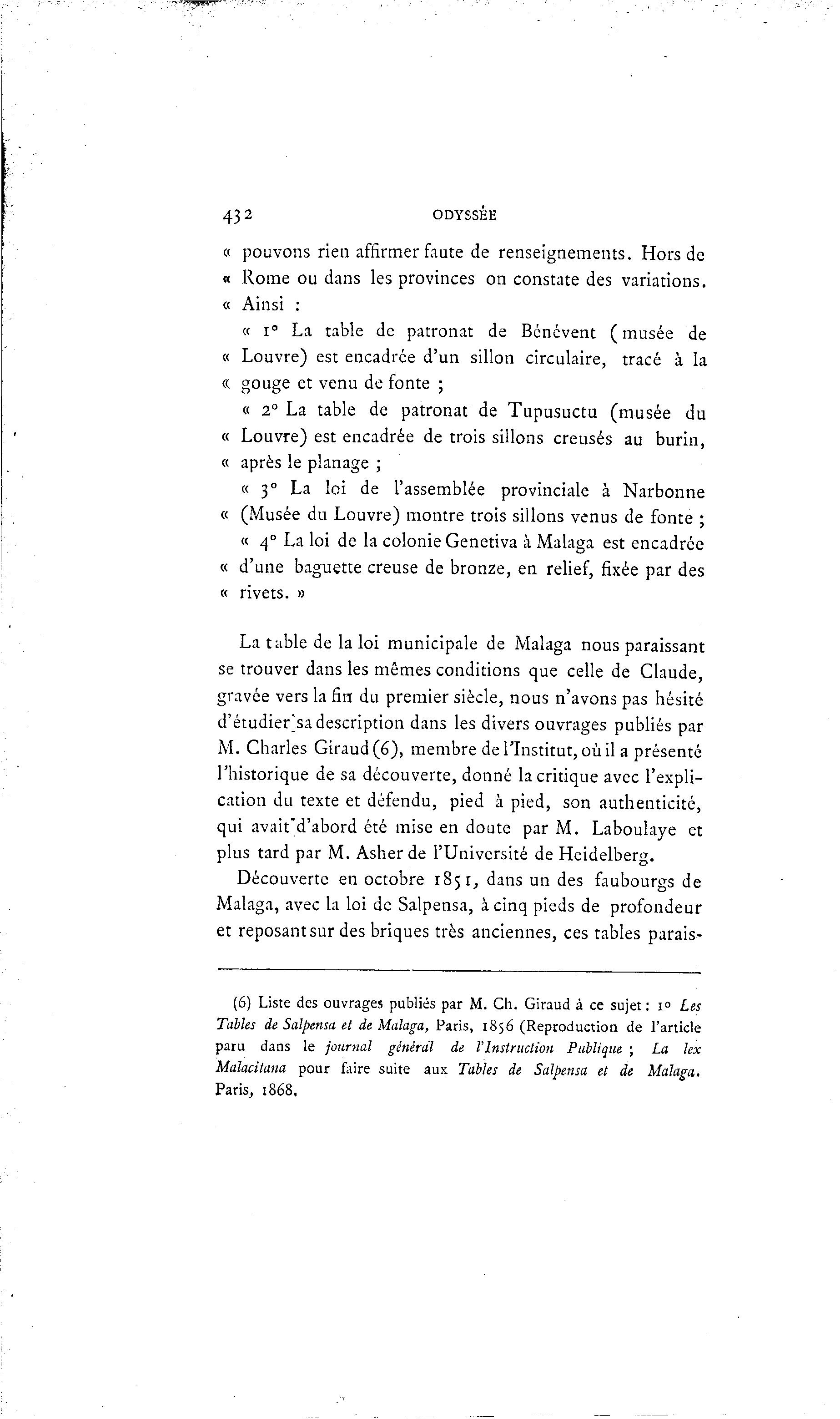 43 2 ODYSSEE « pouvons rien affirmer faute de renseignements. Hors de « Rome ou dans les provinces on constate des variations. « Ainsi : « i° La table de patronat de Bénévent (musée de « Louvre) est encadrée d'un sillon circulaire, tracé à la « gouge et venu de fonte ; « 2° La table de patronat de Tupusuctu (musée du « Louvre) est encadrée de trois sillons creusés au burin, « après le planage ; « 3 0 La loi de l'assemblée provinciale à Narbonne « (Musée du Louvre) montre trois sillons venus de fonte ; « 4° La loi de la colonie Genetiva à Malaga est encadrée « d'une baguette creuse de bronze, en relief, fixée par des « rivets. » La table de la loi municipale de Malaga nous paraissant se trouver dans les mêmes conditions que celle de Claude, gravée vers la fin du premier siècle, nous n'avons pas hésité d'étudier^sa description dans les divers ouvrages publiés par M. Charles Giraud(6), membre de l'Institut, où il a présenté l'historique de sa découverte, donné la critique avec l'expli- cation du texte et défendu, pied à pied, son authenticité, qui avait'd'abord été mise en doute par M. Laboulaye et plus tard par M. Asherde l'Université de Heidelberg. Découverte en octobre 1851, dans un des faubourgs de Malaga, avec la loi de Salpensa, à cinq pieds de profondeur et reposant sur des briques très anciennes, ces tables parais- (6) Liste des ouvrages publiés par M. Cli. Giraud à ce sujet : i° Les Tables de Salpensa et de Malaga, Paris, 1856 (Reproduction de l'article paru dans le journal général de VInstruction Publique ; La lex Malacitana pour faire suite aux Tables de Salpensa et de Malaga. Paris, 1868,