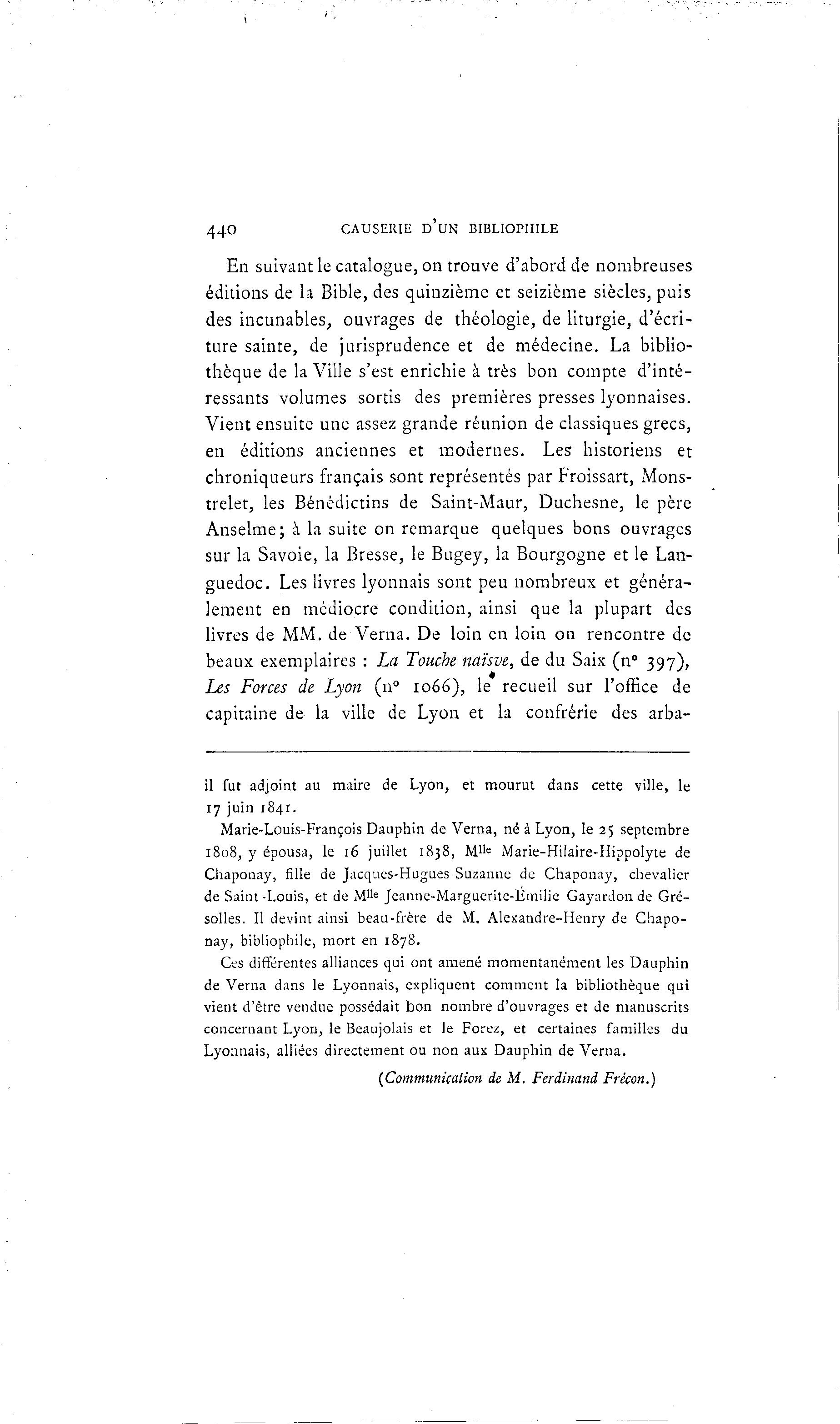 44-0 CAUSERIE D'UN BIBLIOPHILE En suivant le catalogue, on trouve d'abord de nombreuses éditions de la Bible, des quinzième et seizième siècles, puis des incunables, ouvrages de théologie, de liturgie, d'écri- ture sainte, de jurisprudence et de médecine. La biblio- thèque de la Ville s'est enrichie à très bon compte d'inté- ressants volumes sortis des premières presses lyonnaises. Vient ensuite une assez grande réunion de classiques grecs, en éditions anciennes et modernes. Les historiens et chroniqueurs français sont représentés par Froissart, Mons- trelet, les Bénédictins de Saint-Maur, Duchesne, le père Anselme; à la suite on remarque quelques bons ouvrages sur la Savoie, la Bresse, le Bugey, la Bourgogne et le Lan- guedoc. Les livres lyonnais sont peu nombreux et généra- lement en médiocre condition, ainsi que la plupart des livres de MM. de Verna. De loin en loin on rencontre de beaux exemplaires : La Touche naïsve, de du Saix (n° 397), Les Forces de Lyon (n° 1066), le recueil sur l'office de capitaine de la ville de Lyon et la confrérie des arba- il fut adjoint au maire de Lyon, et mourut dans cette ville, le 17 juin 1841. Marie-Louis-François Dauphin de Verna, né à Lyon, le 25 septembre 1808, y épousa, le 16 juillet 1838, M lle Marie-Hilaire-Hippolyte de Chaponay, fille de Jacques-Hugues Suzanne de Chaponay, chevalier de Saint -Louis, et de Mlle Jeanne-Marguerite-Emilie Gayardon de Gré- solles. Il devint ainsi beau-frère de M. Alexandre-Henry de Chapo- nay, bibliophile, mort en 1878. Ces différentes alliances qui ont amené momentanément les Dauphin de Verna dans le Lyonnais, expliquent comment la bibliothèque qui vient d'être vendue possédait bon nombre d'ouvrages et de manuscrits concernant Lyon, le Beaujolais et le Forez, et certaines familles du Lyonnais, alliées directement ou non aux Dauphin de Verna. {Communication de M. Ferdinand Frécon.)