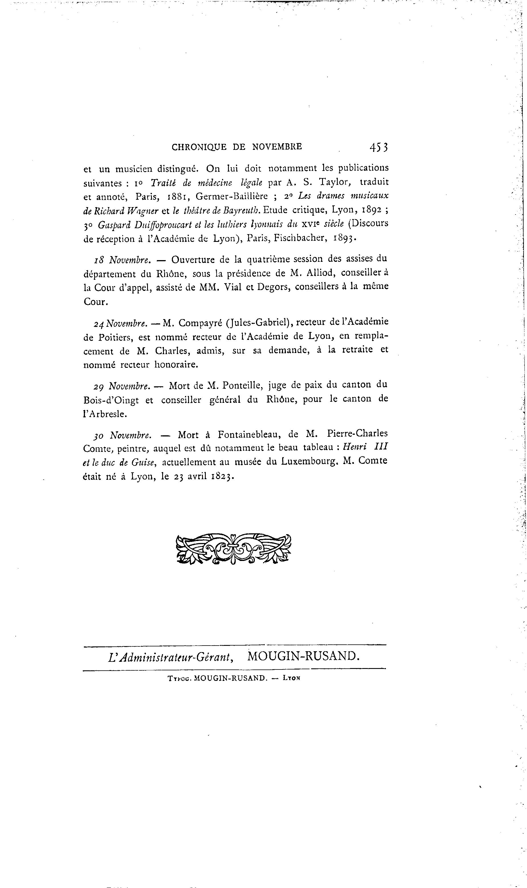 de réception à l'Académie de Lyon), Paris, Fischbacher, 1893.