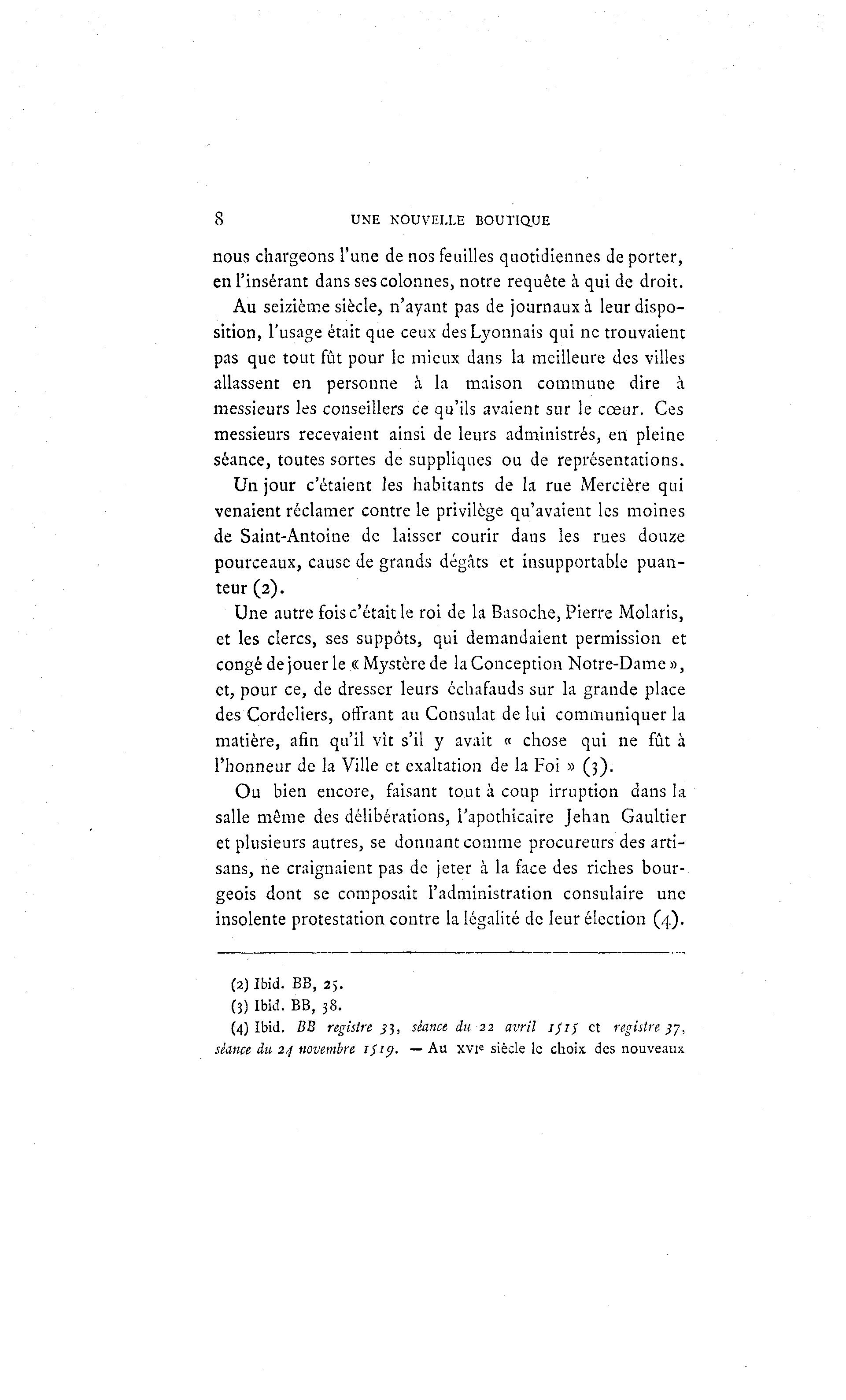 8 UNE NOUVELLE BOUTIQUE nous chargeons l'une de nos feuilles quotidiennes de porter, en l'insérant dans ses colonnes, notre requête à qui de droit. Au seizième siècle, n'ayant pas de journaux à leur dispo- sition, l'usage était que ceux des Lyonnais qui ne trouvaient pas que tout fût pour le mieux dans la meilleure des villes allassent en personne à la maison commune dire à messieurs les conseillers ce qu'ils avaient sur le cœur. Ces messieurs recevaient ainsi de leurs administrés, en pleine séance, toutes sortes de suppliques ou de représentations. Un jour c'étaient les habitants de la rue Mercière qui venaient réclamer contre le privilège qu'avaient les moines de Saint-Antoine de laisser courir dans les rues douze pourceaux, cause de grands dégâts et insupportable puan- teur (2). Une autre fois c'était le roi de la Basoche, Pierre Molaris, et les clercs, ses suppôts, qui demandaient permission et congé de jouer le « Mystère de la Conception Notre-Dame», et, pour ce, de dresser leurs échafauds sur la grande place des Cordeliers, offrant au Consulat de lui communiquer la matière, afin qu'il vît s'il y avait « chose qui ne fût à l'honneur de la Ville et exaltation de la Foi » (3). Ou bien encore, faisant tout à coup irruption dans la salle même des délibérations, l'apothicaire Jehan Gaultier et plusieurs autres, se donnant comme procureurs des arti- sans, ne craignaient pas de jeter à la face des riches bour- geois dont se composait l'administration consulaire une insolente protestation contre la légalité de leur élection (4). (2) Ibid. BB, 25. (3) Ibid. BB, 38. (4) Ibid. BB registre _;3, séance au 22 avril ijif et registre 37, séance du 24 novembre iStcj. — Au xvi e siècle le choix des nouveaux