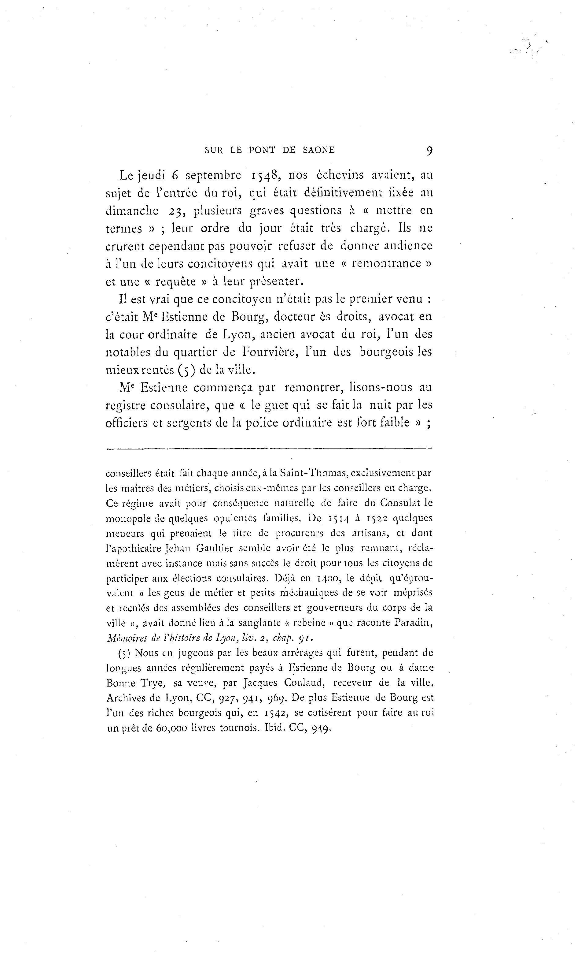 SUR LE PONT DE SAONE 9 Le jeudi 6 septembre 1548, nos échevins avaient, au sujet de l'entrée du roi, qui était définitivement fixée au dimanche 23, plusieurs graves questions à « mettre en termes » ; leur ordre du jour était très chargé. Ils ne crurent cependant pas pouvoir refuser de donner audience à l'un de leurs concitoyens qui avait une « remontrance » et une « requête » à leur présenter. Il est vrai que ce concitoyen n'était pas le premier venu : c'était Me Estienne de Bourg, docteur es droits, avocat en la cour ordinaire de Lyon, ancien avocat du roi, l'un des notables du quartier de Fourvière, l'un des bourgeois les mieuxrentés (5) de la ville. Me Estienne commença par remontrer, lisons-nous au registre consulaire, que « le guet qui se fait la nuit par les officiers et sergents de la police ordinaire est fort faible » ; conseillers était fait chaque année, à la Saint-Thomas, exclusivement par les maîtres des métiers, choisis eux-mêmes par les conseillers en charge. Ce régime avait pour conséquence naturelle de faire du Consulat le monopole de quelques opulentes familles. De 1514 à 1522 quelques meneurs qui prenaient le titre de procureurs des artisans, et dont l'apothicaire Jehan Gaultier semble avoir été le plus remuant, récla- mèrent avec instance mais sans succès le droit pour tous les citoyens de participer aux élections consulaires. Déjà en 1400, le dépit qu'éprou- vaient « les gens de métier et petits méchaniques de se voir méprisés et reculés des assemblées des conseillers et gouverneurs du corps de la ville », avait donné lieu à la sanglante « rebeine » que raconte Paradin, Mémoires de l'histoire de Lyon, liv. 2, chap.