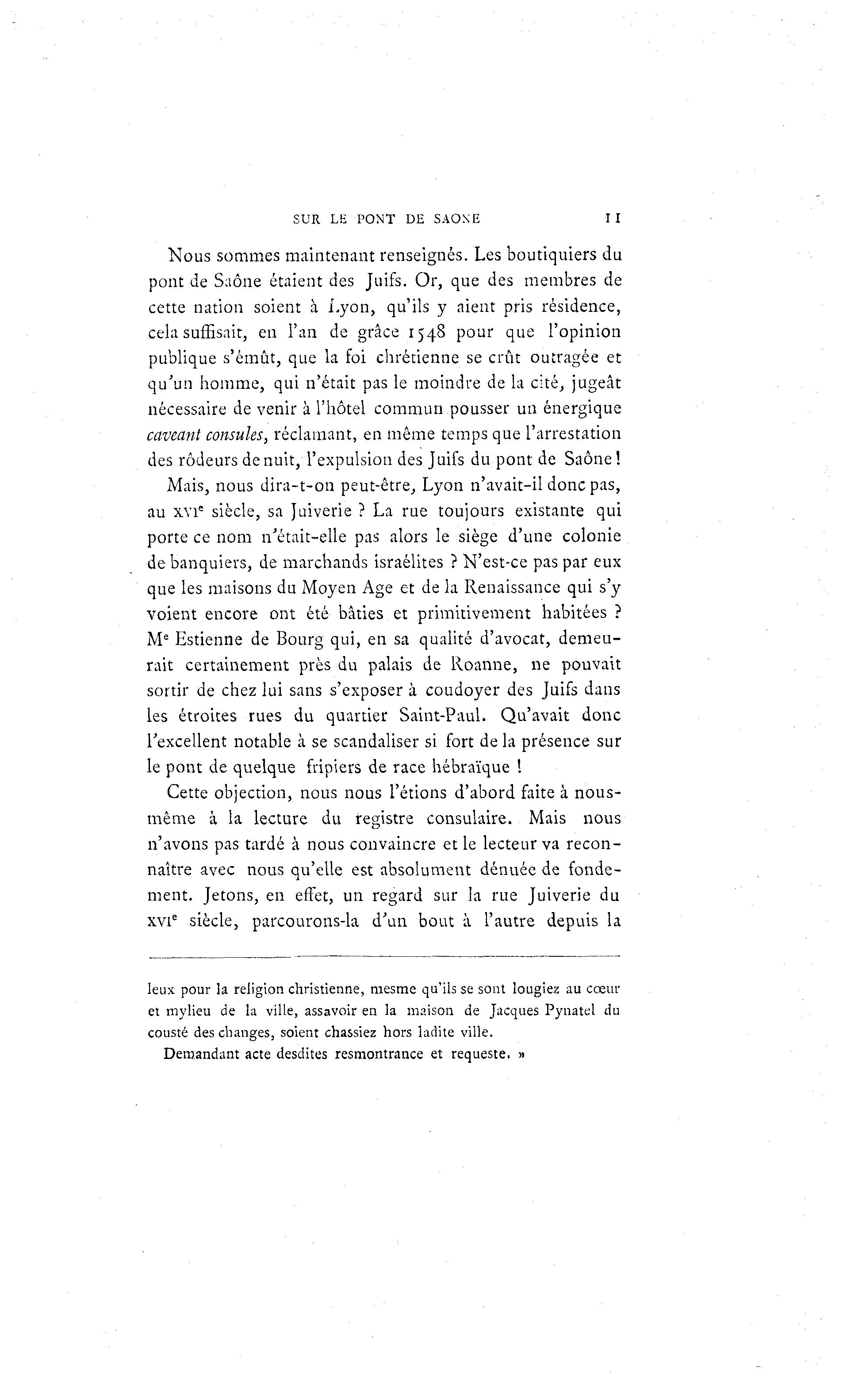 SUR LE PONT DE SAONE II Nous sommes maintenant renseignés. Les boutiquiers du pont de Saône étaient des Juifs. Or, que des membres de cette nation soient à Lyon, qu'ils y aient pris résidence, cela suffisait, en l'an de grâce 1548 pour que l'opinion publique s'émût, que la foi chrétienne se crût outragée et qu'un homme, qui n'était pas le moindre de la cité, jugeât nécessaire de venir à l'hôtel commun pousser un énergique caveant consules, réclamant, en même temps que l'arrestation des rôdeurs de nuit, l'expulsion des Juifs du pont de Saône ! Mais, nous dira-t-on peut-être, Lyon n'avait-il donc pas, au XVIe siècle, sa Juiverie ? La rue toujours existante qui porte ce nom n'était-elle pas alors le siège d'une colonie de banquiers, de marchands israélites ? N'est-ce pas par eux que les maisons du Moyen Age et de la Renaissance qui s'y voient encore ont été bâties et primitivement habitées ? Me Estienne de Bourg qui, en sa qualité d'avocat, demeu- rait certainement près du palais de Roanne, ne pouvait sortir de chez lui sans s'exposer à coudoyer des Juifs dans les étroites rues du quartier Saint-Paul. Qu'avait donc l'excellent notable à se scandaliser si fort de la présence sur le pont de quelque fripiers de race hébraïque ! Cette objection, nous nous l'étions d'abord faite à nous- même à la lecture du registre consulaire. Mais nous n'avons pas tardé à nous convaincre et le lecteur va recon- naître avec nous qu'elle est absolument dénuée de fonde- ment. Jetons, en effet, un regard sur la rue Juiverie du xvie siècle, parcourons-la d'un bout à l'autre depuis la leux pour la religion christienne, mesrne qu'ils se sont lougiez au coeur et mylieu de la ville, assavoir en la maison de Jacques Pynatel du cousté des changes, soient chassiez hors ladite ville. Demandant acte desdites resmontrance et requeste, »
