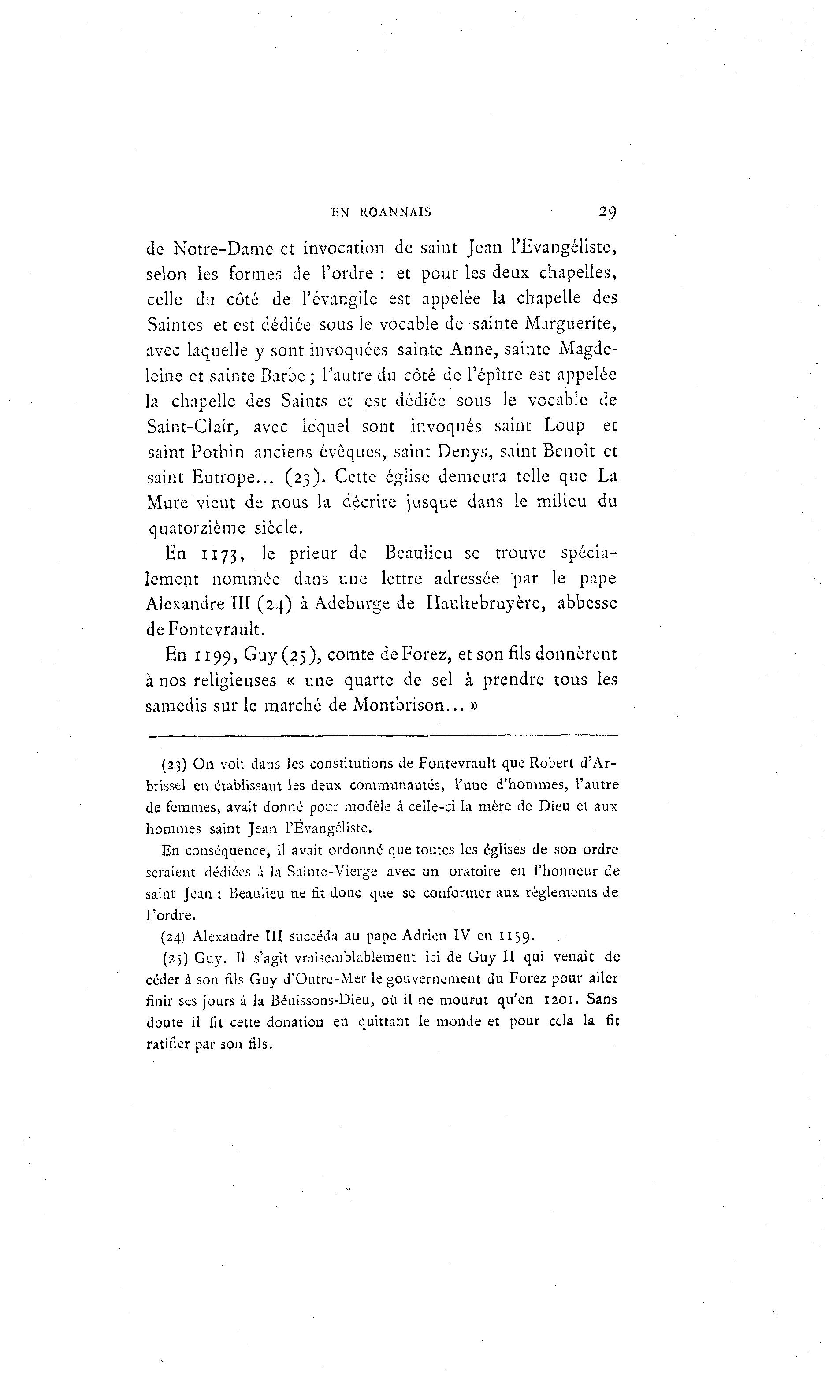 EN ROANNAIS 2<) de Notre-Dame et invocation de saint Jean l'Evangéliste, selon les formes de l'ordre : et pour les deux chapelles, celle du côté de l'évangile est appelée la chapelle des Saintes et est dédiée sous le vocable de sainte Marguerite, avec laquelle y sont invoquées sainte Anne, sainte Magde- leine et sainte Barbe ; l'autre du côté de l'épître est appelée la chapelle des Saints et est dédiée sous le vocable de Saint-Clair, avec lequel sont invoqués saint Loup et saint Pothin anciens évoques, saint Denys, saint Benoît et saint Eutrope... (23). Cette église demeura telle que La Mure vient de nous la décrire jusque dans le milieu du quatorzième siècle. En 1173, le prieur de Beaulieu se trouve spécia- lement nommée dans une lettre adressée par le pape Alexandre III (24) à Adeburge de Haultebruyère, abbesse deFontevrault. En 1199, Guy (25), comte de Forez, et son fils donnèrent à nos religieuses « une quarte de sel à prendre tous les samedis sur le marché de Montbrison... » (23) On voit dans les constitutions de Fontevrault que Robert d'Ar- brissel en établissant les deux communautés, l'une d'hommes, l'autre de femmes, avait donné pour modèle à celle-ci la mère de Dieu et aux hommes saint Jean l'Evangéliste. En conséquence, il avait ordonné que toutes les églises de son ordre seraient dédiées à la Sainte-Vierge avec un oratoire en l'honneur de saint Jean ; Beaulieu ne fit donc que se conformer aux règlements de l'ordre. (24) Alexandre III succéda au pape Adrien IV en 1159. (25) Guy. Il s'agit vraisemblablement ici de Guy II qui venait de céder à son fils Guy d'Outre-Mer le gouvernement du Forez pour aller finir ses jours à la Bénissons-Dieu, où il ne mourut qu'en 1201. Sans doute il fit cette donation en quittant le monde et pour cela la fit ratifier par son fils.