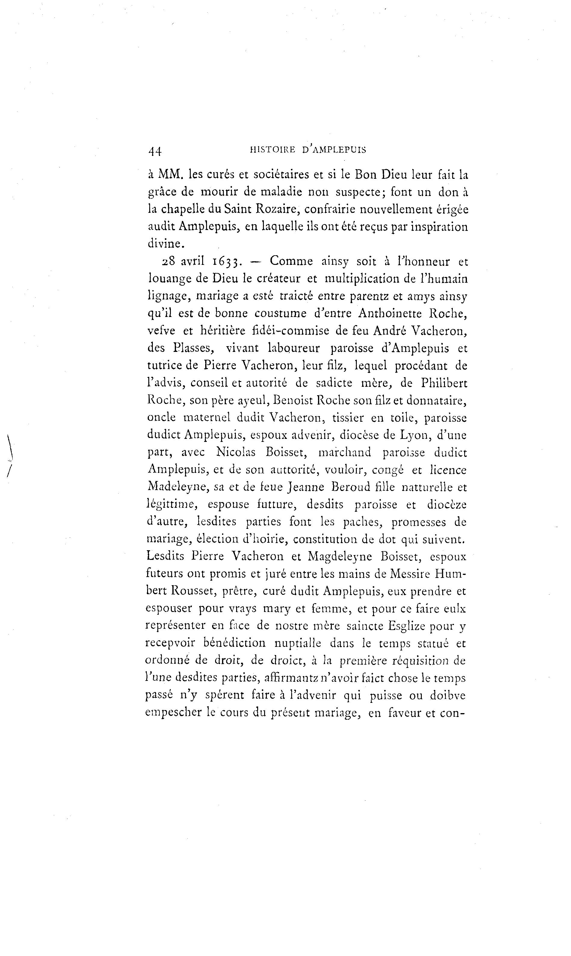 44 HISTOIRE D'AMPLEPUIS à MM. les curés et sociétaires et si le Bon Dieu leur fait la grâce de mourir de maladie non suspecte; font un don à la chapelle du Saint Rozaire, confrairie nouvellement érigée audit Amplepuis, en laquelle ils ont été reçus par inspiration divine. 28 avril 1633. — Comme ainsy soit à l'honneur et louange de Dieu le créateur et multiplication de l'humain lignage, mariage a esté traicté entre parentz et amys ainsy qu'il est de bonne coustume d'entre Anthoinette Roche, vefve et héritière fidéi-commise de feu André Vacheron, des Plasses, vivant laboureur paroisse d'Amplepuis et tutrice de Pierre Vacheron, leur filz, lequel procédant de l'advis, conseil et autorité de sadicte mère, de Philibert Roche, son père ayeul, Benoist Roche son filz et donnataire, oncle maternel dudit Vacheron, tissier en toile, paroisse dudict Amplepuis, espoux advenir, diocèse de Lyon, d'une part, avec Nicolas Boisset, marchand paroisse dudict Amplepuis, et de son auttorité, vouloir, congé et licence Madeleyne, sa et de feue Jeanne Beroud fille natturelle et légittime, espouse futture, desdits paroisse et diocèze d'autre, lesdites parties font les paches, promesses de mariage, élection d'hoirie, constitution de dot qui suivent. Lesdits Pierre Vacheron et Magdeleyne Boisset, espoux futeurs ont promis et juré entre les mains de Messire Hum- bert Rousset, prêtre, curé dudit Amplepuis, eux prendre et espouser pour vrays mary et femme, et pour ce faire eulx représenter en face de nostre mère saincte Esglize pour y recepvoir bénédiction nuptialle dans le temps statué et ordonné de droit, de droict, à la première réquisition de l'une desdites parties, affirmantz n'avoir faict chose le temps passé n'y spérent faire à l'advenir qui puisse ou doibve empescher le cours du présent mariage, en faveur et con-