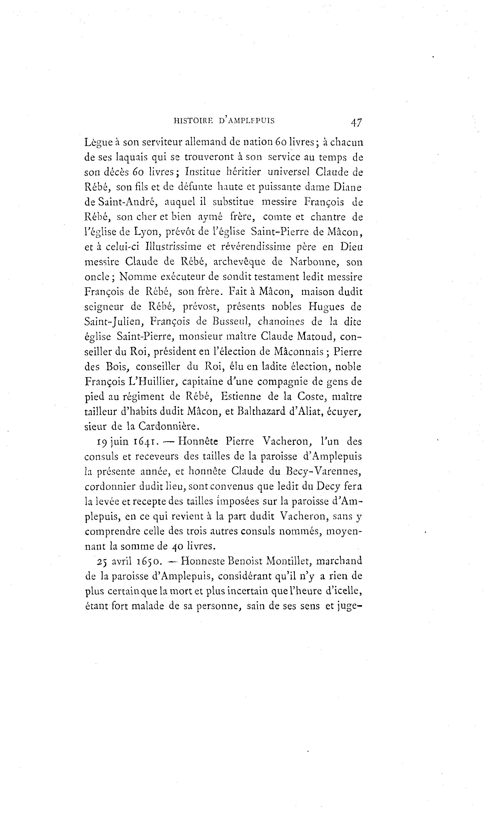 HISTOIRE D'AMPLFPUIS 47 Lègue à son serviteur allemand de nation 60 livres ; à chacun de ses laquais qui se trouveront à son service au temps de son décès 60 livres ; Institue héritier universel Claude de Rébé, son fils et de défunte haute et puissante dame Diane de Saint-André, auquel il substitue messire François de Rébé, son cher et bien aymé frère, comte et chantre de l'église de Lyon, prévôt de l'église Saint-Pierre de Mà con, et à celui-ci Illustrissime et révérendissime père en Dieu messire Claude de Rébé, archevêque de Narbonne, son oncle; Nomme exécuteur de sondit testament ledit messire François de Rébé, son frère. Fait à Mâcon, maison dudit seigneur de Rébé, prévost, présents nobles Hugues de Saint-Julien, François de Busseul, chanoines de la dite église Saint-Pierre, monsieur maître Claude Matoud, con- seiller du Roi, président en l'élection de Maçonnais ; Pierre des Bois, conseiller du Roi, élu en ladite élection, noble François L'HuilIier, capitaine d'une compagnie de gens de pied au régiment de Rébé, Estienne de la Coste, maître tailleur d'habits dudit Mâcon, et Balthazard d'Aliat, écuyer, sieur de la Cardonnière. I 9 j u i n i 6 4 i . — H o n n ê t e Pierre Vacheron, l'un des consuls et receveurs des tailles de la paroisse d'Amplepuis la présente année, et honnête Claude du Becy-Varennes, cordonnier dudit lieu, sont convenus que ledit du Decy fera la levée et recepte des tailles imposées sur la paroisse d'Am- plepuis, en ce qui revient à la part dudit Vacheron, sans y comprendre celle des trois autres consuls nommés, moyen- nant la somme de 40 livres. 25 avril 1650. —Honneste Benoist Montillet, marchand de la paroisse d'Amplepuis, considérant qu'il n'y a rien de plus certainquelamortet plus incertain que l'heure d'icelle, étant fort malade de sa personne, sain de ses sens et juge-