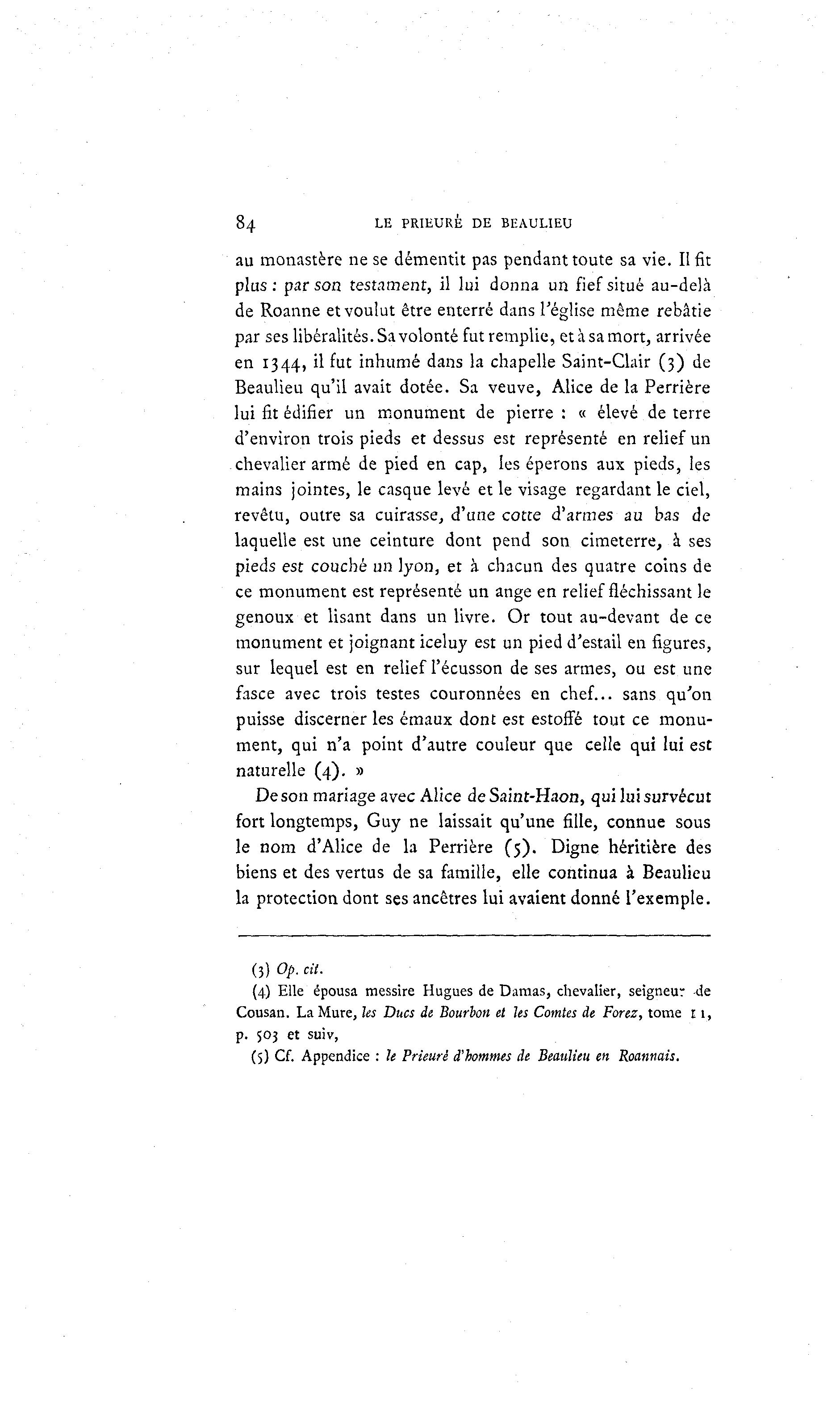 84 LE PRIEURÉ DE BEAULIEU au monastère ne se démentit pas pendant toute sa vie. II fit plus: par son testament, il lui donna un fief situé au-delà de Roanne et voulut être enterré dans l'église même rebâtie par ses libéralités. Savolonté fut remplie, et à sa mort, arrivée en 1344, il fut inhumé dans la chapelle Saint-Clair (3) de Beaulieu qu'il avait dotée. Sa veuve, Alice de la Perrière lui fit édifier un monument de pierre : « élevé de terre d'environ trois pieds et dessus est représenté en relief un chevalier armé de pied en cap, les éperons aux pieds, les mains jointes, le casque levé et le visage regardant le ciel, revêtu, outre sa cuirasse, d'une cotte d'armes au bas de laquelle est une ceinture dont pend son cimeterre, à ses pieds est couché un lyon, et à chacun des quatre coins de ce monument est représenté un ange en relief fléchissant le genoux et lisant dans un livre. Or tout au-devant de ce monument et joignant iceluy est un pied d'estail en figures, sur lequel est en relief l'écusson de ses armes, ou est une fasce avec trois testes couronnées en chef... sans qu'on puisse discerner les émaux dont est estofTé tout ce monu- ment, qui n'a point d'autre couleur que celle qui lui est naturelle (4). » De son mariage avec Alice deSaint-Haon, qui lui survécut fort longtemps, Guy ne laissait qu'une fille, connue sous le nom d'Alice de la Perrière (5). Digne héritière des biens et des vertus de sa famille, elle continua à Beaulieu la protection dont ses ancêtres lui avaient donné l'exemple. (3) Op. cit. (4) Elle épousa messire Hugues de Damas, chevalier, seigneur -de Cousan. La Mure, les Ducs de Bourbon et les Comtes de Forez, tome 11, p. 503 et suiv, (5) Cf. Appendice : h Prieuré d'hommes de Beaulieu en Roannais.