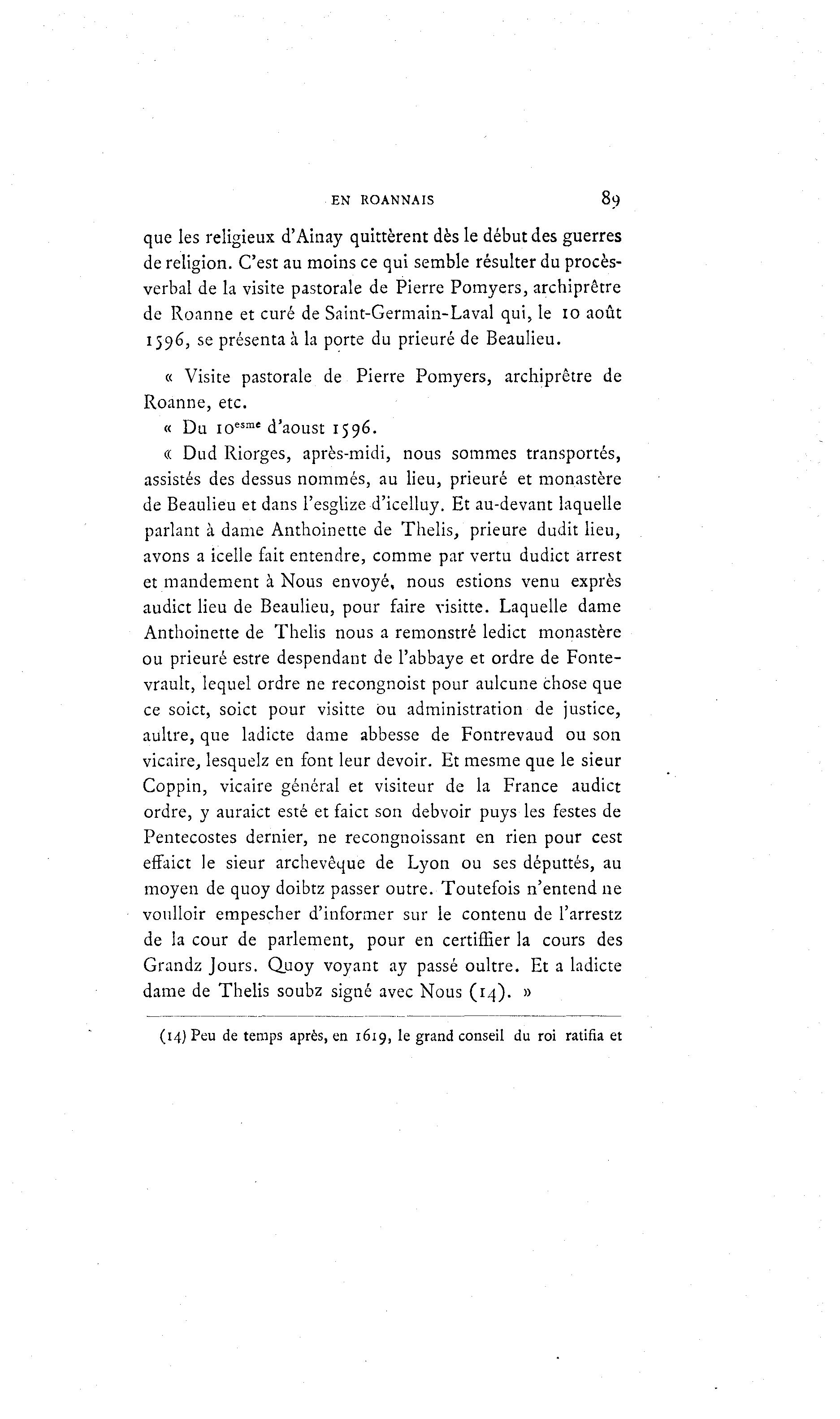 EN ROANNAIS 89 que les religieux d'Ainay quittèrent dès le début des guerres de religion. C'est au moins ce qui semble résulter du procès- verbal de la visite pastorale de Pierre Pomyers, archiprêtre de Roanne et curé de Saint-Germain-Laval qui, le 10 août 1596, se présenta à la porte du prieuré de Beaulieu. « Visite pastorale de Pierre Pomyers, archiprêtre de Roanne, etc. « Du io esme d'aoust 1596. « Dud Riorges, après-midi, nous sommes transportés, assistés des dessus nommés, au lieu, prieuré et monastère de Beaulieu et dans l'esglize d'icelluy. Et au-devant laquelle parlant à dame Anthoinette de Thelis, prieure dudit lieu, avons a icelle fait entendre, comme par vertu dudict arrest et mandement à Nous envoyé, nous estions venu exprès audict lieu de Beaulieu, pour faire visitte. Laquelle dame Anthoinette de Thelis nous a remonstré ledict monastère ou prieuré estre despendant de l'abbaye et ordre de Fonte- vrault, lequel ordre ne recongnoist pour aulcune chose que ce soict, soict pour visitte bu administration de justice, aultre, que ladicte dame abbesse de Fontrevaud ou son vicaire, lesquelz en font leur devoir. Et mesme que le sieur Coppin, vicaire général et visiteur de la France audict ordre, y auraict esté et faict son debvoir puys les festes de Pentecostes dernier, ne recongnoissant en rien pour cest effaict le sieur archevêque de Lyon ou ses députtés, au moyen de quoy doibtz passer outre. Toutefois n'entend ne voulloir empescher d'informer sur le contenu de l'arrestz de la cour de parlement, pour en certiffier la cours des Grandz Jours. Quoy voyant ay passé oultre. Et a ladicte dame de Thelis soubz signé avec Nous (14). » (14) Peu de temps après, en 1619, le grand conseil du roi ratifia et