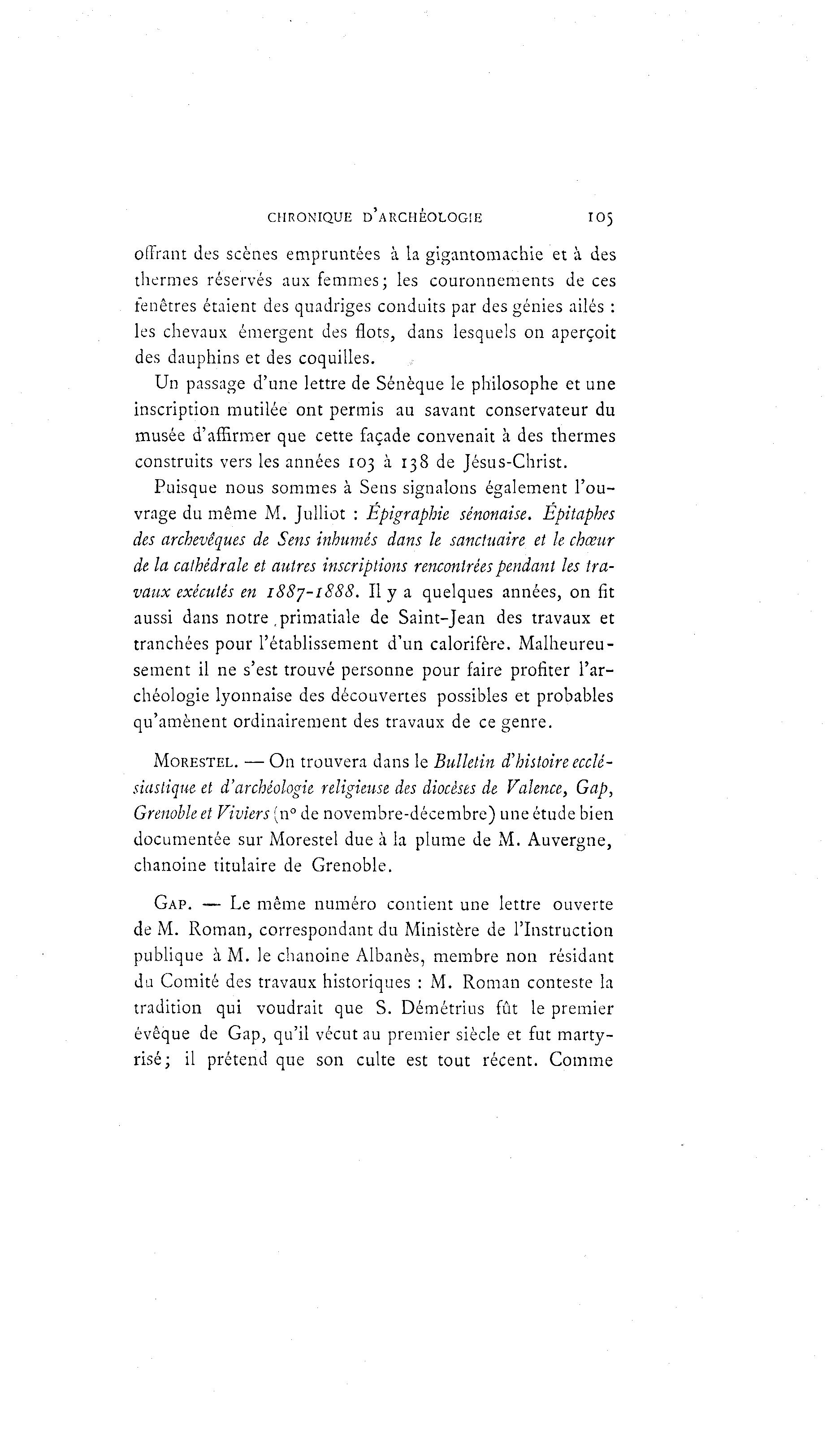 CHRONIQUE D'ARCHÉOLOGIE IO5 offrant des scènes empruntées à la gigantomachie et à des thermes réservés aux femmes; les couronnements de ces fenêtres étaient des quadriges conduits par des génies ailés : les chevaux émergent des flots, dans lesquels on aperçoit des dauphins et des coquilles. Un passage d'une lettre de Sénèque le philosophe et une inscription mutilée ont permis au savant conservateur du musée d'affirmer que cette façade convenait à des thermes construits vers les années 103 à 138 de Jésus-Christ. Puisque nous sommes à Sens signalons également l'ou- vrage du même M. Julliot : Epigraphie sénonaise. Epitaphes des archevêques de Sens inhumés dans le sanctuaire et le chœur de la cathédrale et autres inscriptions rencontrées pendant les tra- vaux exécutés en I88J-I888. Il y a quelques années, on fit aussi dans notre .primatiale de Saint-Jean des travaux et tranchées pour l'établissement d'un calorifère. Malheureu- sement il ne s'est trouvé personne pour faire profiter l'ar- chéologie lyonnaise des découvertes possibles et probables qu'amènent ordinairement des travaux de ce genre. MORESTEL. — On trouvera dans le Bulletin d'histoire ecclé- siastique et d'archéologie religieuse des diocèses de Valence, Gap, Grenoble et Viviers |n° de novembre-décembre) une étude bien documentée sur Morestel due à la plume de M. Auvergne, chanoine titulaire de Grenoble. GAP. — Le même numéro contient une lettre ouverte de M. Roman, correspondant du Ministère de l'Instruction publique à M. le chanoine Albanès, membre non résidant du Comité des travaux historiques : M. Roman conteste la tradition qui voudrait que S. Démétrius fût le premier évêque de Gap, qu'il vécut au premier siècle et fut marty- risé; il prétend que son culte est tout récent. Comme