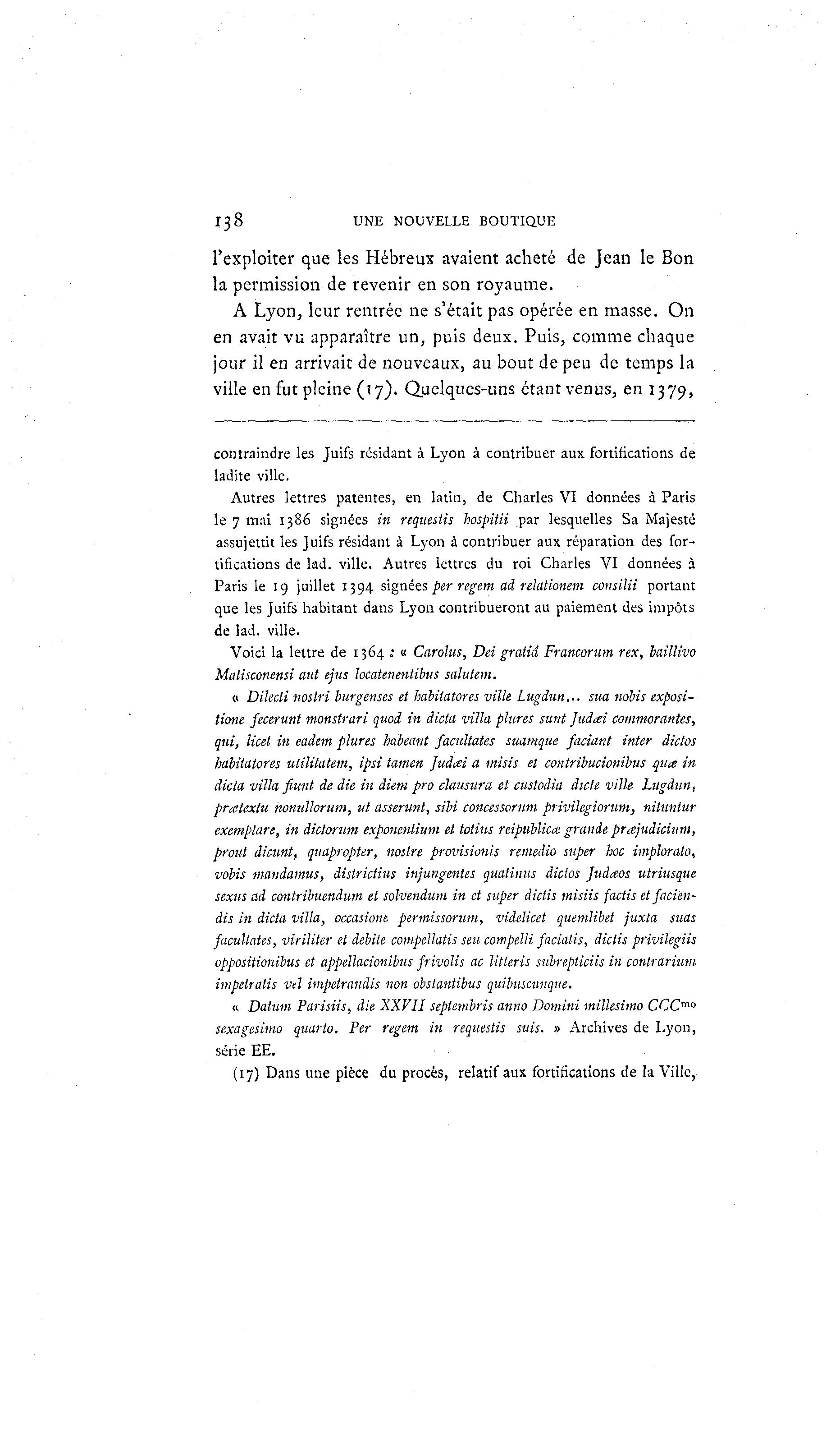 I38 UNE NOUVELLE BOUTIQUE l'exploiter que les Hébreux avaient acheté de Jean le Bon la permission de revenir en son royaume. A Lyon, leur rentrée ne s'était pas opérée en masse. On en avait vu apparaître un, puis deux. Puis, comme chaque jour il en arrivait de nouveaux, au bout de peu de temps la ville en fut pleine (17). Quelques-uns étant venus, en 1379, contraindre les Juifs résidant à Lyon à contribuer aux fortifications de ladite ville. Autres lettres patentes, en latin, de Charles VI données à Paris le 7 mai 1386 signées in requestis hospitii par lesquelles Sa Majesté assujettit les Juifs résidant à Lyon à contribuer aux réparation des for- tifications de lad. ville. Autres lettres du roi Charles VI données à Paris le 19 juillet 1394 signées per regem ad relationem consilii portant que les Juifs habitant dans Lyon contribueront au paiement des impôts de lad. ville. Voici la lettre de 1364 „ « Carolus, Dei gratid Francorum rex, haillivo • Matisconensi aut ejus locatenentibus salutem. « Dilecti nosiri burgenses et habitatores ville Lugdun... sua nobis exposi- tione fecerunt monstrari quod in dicta villa plures surit Judœi commorantes, qui, licet in eadem plures habeant facultates suamque faciant inter dictas habitatores ulilitatem, ipsi tamen fudai a tnisis et contribucionibus quœ in dicta villa fiunt de die in diem pro clausura et custodia dicte ville Lugdun, pratextu nonullorum, ut asserunt, sibi concessorum privilegiorum, nituntur exemplare, in dicloram exponentium et totiits reipublicœ grande prajudicium, prout dicunt, quapropter, nostre provisionis remédia super hoc implorato, vobis mandamus, districtius injungentes quatinus diclos Judaos utriusque sexus ad contribuendum et solvendum in et super dictis misiis factis et facien- dis in dicta villa, occasions permissorum, videlicet quemlibet juxta suas facultates, viriliter et débile compellatis seu compelli faciatis, dictis privilegiis oppositionibus et appellacionibus frivolis ac litleris subrepticiis in contrarium impetratis vtl impetrandis non obstantibus quibuscunque. « Datum Parisiis, die XXVII septembris anno Domini millesimo CCCmo sexagesimo quarto. Per regem in requestis suis. » Archives de Lyon, série EE. (17) Dans une pièce du procès, relatif aux fortifications de la Ville,