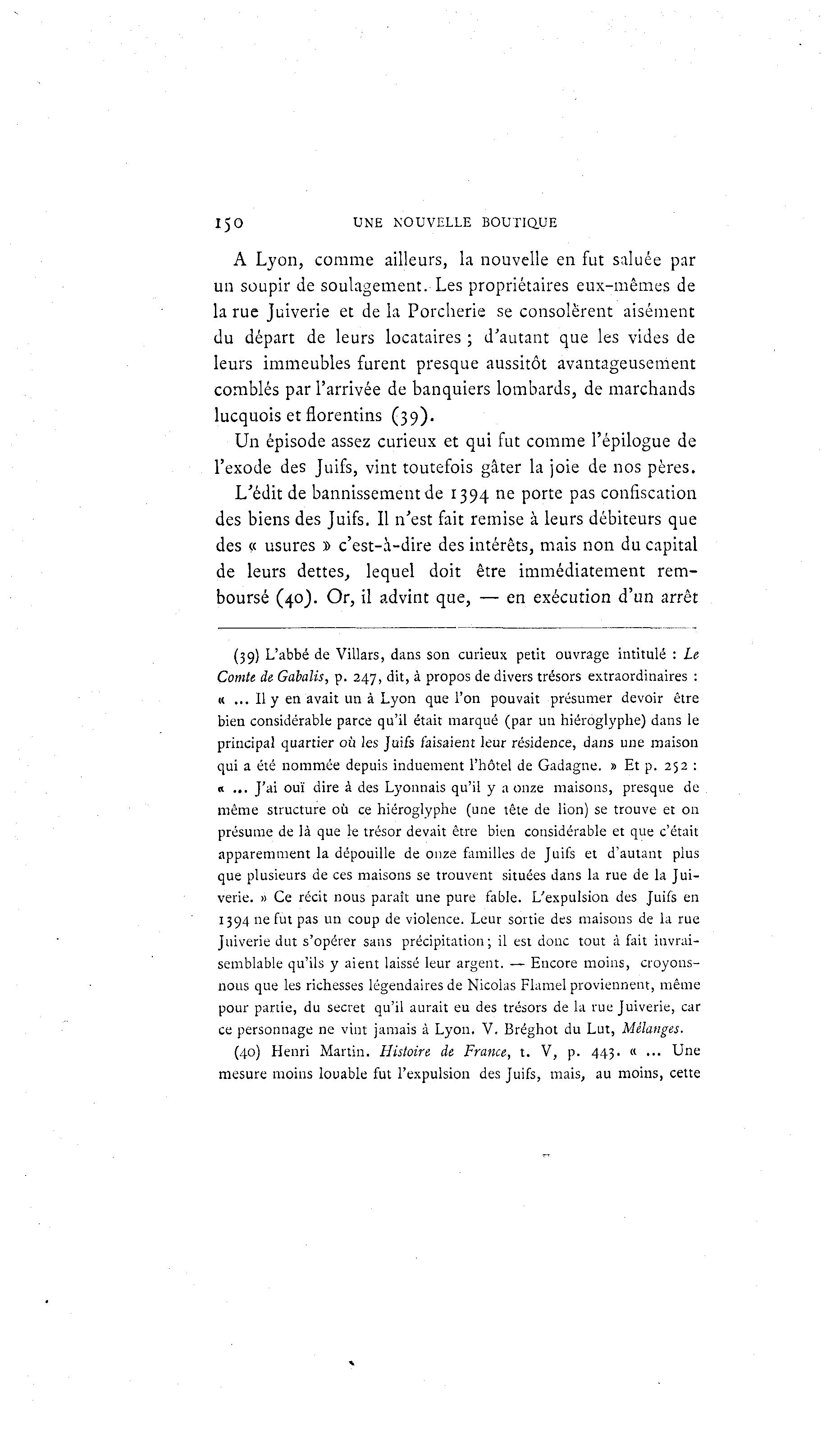 iSo UNE NOUVELLE BOUTIQUE A Lyon, comme ailleurs, la nouvelle en fut saluée par un soupir de soulagement. Les propriétaires eux-mêmes de la rue Juiverie et de la Porcherie se consolèrent aisément du départ de leurs locataires ; d'autant que les vides de leurs immeubles furent presque aussitôt avantageusement comblés par l'arrivée de banquiers lombards, de marchands lucquois et florentins (39). Un épisode assez curieux et qui fut comme l'épilogue de l'exode des Juifs, vint toutefois gâter la joie de nos pères. L'édit de bannissement de 1394 ne porte pas confiscation des biens des Juifs. Il n'est fait remise à leurs débiteurs que des « usures » c'est-à -dire des intérêts, mais non du capital de leurs dettes, lequel doit être immédiatement rem- boursé (40). Or, il advint que, — en exécution d'un arrêt (39) L'abbé de Villars, dans son curieux petit ouvrage intitulé : Le Comte de Gabalis, p. 247, dit, à propos de divers trésors extraordinaires : « ... Il y en avait un à Lyon que l'on pouvait présumer devoir être bien considérable parce qu'il était marqué (par un hiéroglyphe) dans le principal quartier où les Juifs faisaient leur résidence, dans une maison qui a été nommée depuis induement l'hôtel de Gadagne. » Et p. 252 : « ... J'ai ouï dire à des Lyonnais qu'il y a onze maisons, presque de même structure où ce hiéroglyphe (une tête de lion) se trouve et on présume de là que le trésor devait être bien considérable et que c'était apparemment la dépouille de onze familles de Juifs et d'autant plus que plusieurs de ces maisons se trouvent situées dans la rue de la Jui- verie. » Ce récit nous paraît une pure fable. L'expulsion des Juifs en 1394 ne fut pas un coup de violence. Leur sortie des maisons de la rue Juiverie dut s'opérer sans précipitation; il est donc tout à fait invrai- semblable qu'ils y aient laissé leur argent. — Encore moins, croyons- nous que les richesses légendaires de Nicolas Flamel proviennent, même pour partie, du secret qu'il aurait eu des trésors de la rue Juiverie, car ce personnage ne vint jamais à Lyon, V. Bréghot du Lut, Mélanges. (40) Henri Martin. Histoire de France, t. V, p. 443. « ... Une mesure moins louable fut l'expulsion des Juifs, mais, au moins, cette