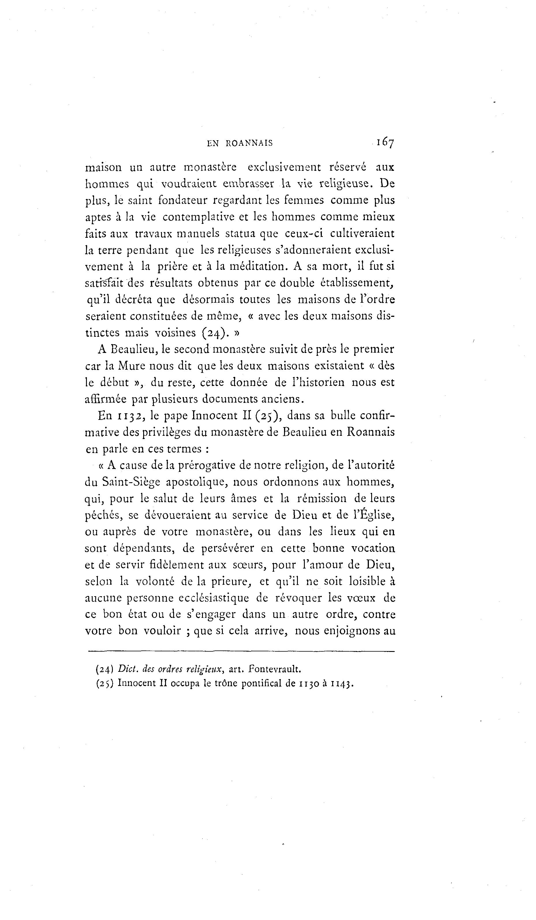 EN ROANNAIS 167 maison un autre monastère exclusivement réservé aux hommes qui voudraient embrasser la vie religieuse. De plus, le saint fondateur regardant les femmes comme plus aptes à la vie contemplative et les hommes comme mieux faits aux travaux manuels statua que ceux-ci cultiveraient la terre pendant que les religieuses s'adonneraient exclusi- vement à la prière et à la méditation. A sa mort, il fut si satisfait des résultats obtenus par ce double établissement, qu'il décréta que désormais toutes les maisons de l'ordre seraient constituées de même, « avec les deux maisons dis- tinctes mais voisines (24). » A Beaulieu, le second monastère suivit de près le premier car la Mure nous dit que les deux maisons existaient « dès le début », du reste, cette donnée de l'historien nous est affirmée par plusieurs documents anciens. En 1132, le pape Innocent II (25), dans sa bulle confir- mative des privilèges du monastère de Beaulieu en Roannais en parle en ces termes : « A cause de la prérogative de notre religion, de l'autorité du Saint-Siège apostolique, nous ordonnons aux hommes, qui, pour le salut de leurs âmes et la rémission de leurs péchés, se dévoueraient au service de Dieu et de l'Église, ou auprès de votre monastère, ou dans les lieux qui en sont dépendants, de persévérer en cette bonne vocation et de servir fidèlement aux sœurs, pour l'amour de Dieu, selon la volonté de la prieure, et qu'il ne soit loisible à aucune personne ecclésiastique de révoquer les voeux de ce bon état ou de s'engager dans un autre ordre, contre votre bon vouloir ; que si cela arrive, nous enjoignons au (24) Dict. des ordres religieux, art. Fontevrault. (25) Innocent II occupa le trône pontifical de 1130 à 1143.