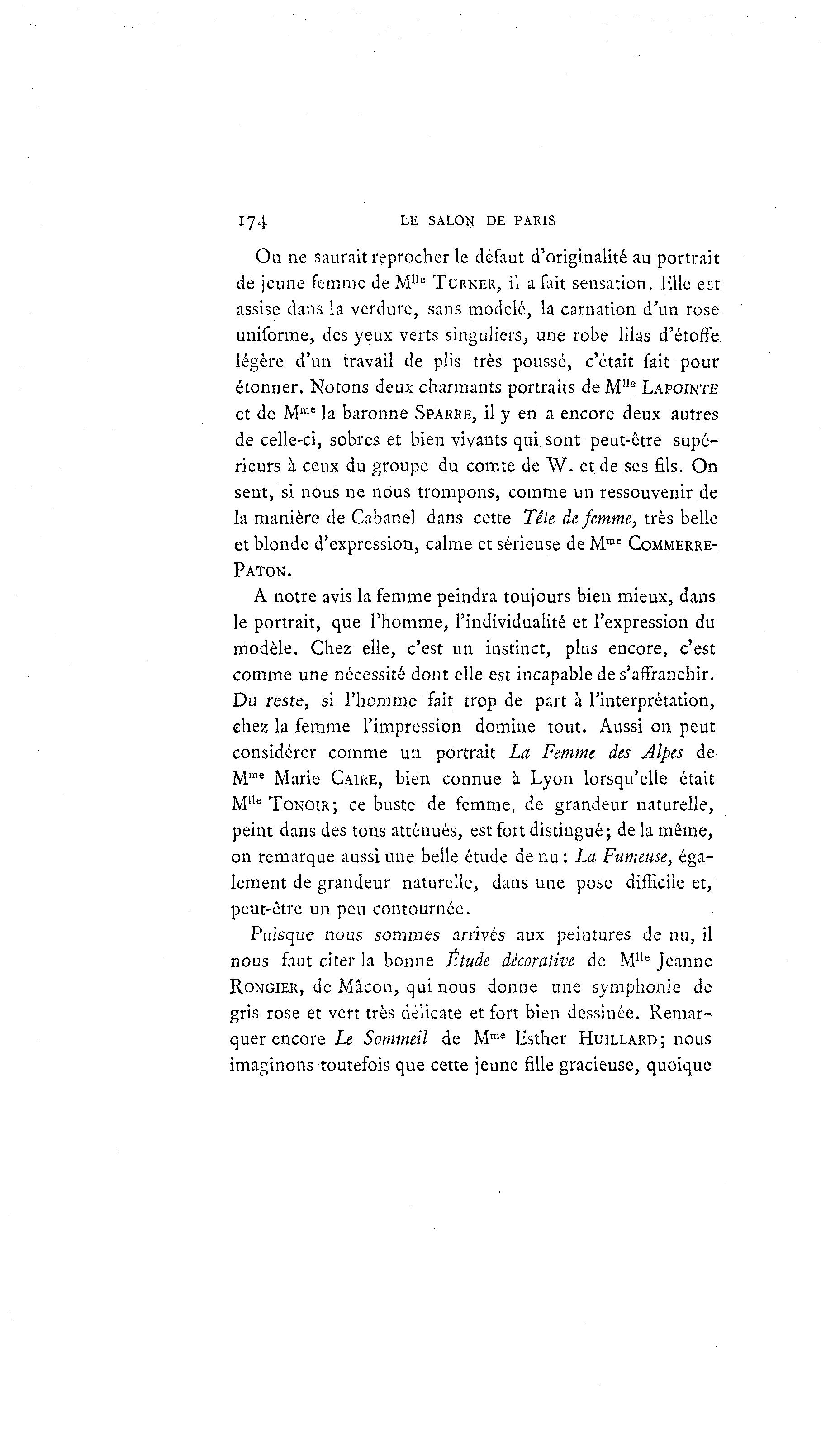 L 174 E SALON DE PARIS On ne saurait reprocher le défaut d'originalité au portrait de jeune femme de M1Ie TURNER, il a fait sensation. Elle est assise dans la verdure, sans modelé, la carnation d'un rose uniforme, des yeux verts singuliers, une robe lilas d'étoffe légère d'un travail de plis très poussé, c'était fait pour étonner. Notons deux charmants portraits de Mlle LAPOINTE et de Mme la baronne SPARRE, il y en a encore deux autres de celle-ci, sobres et bien vivants qui sont peut-être supé- rieurs à ceux du groupe du comte de W . et de ses fils. On sent, si nous ne nous trompons, comme un ressouvenir de la manière de Cabanel dans cette Tête de femme, très belle et blonde d'expression, calme et sérieuse de Mmc COMMERRE- PATON. A notre avis la femme peindra toujours bien mieux, dans le portrait, que l'homme, l'individualité et l'expression du modèle. Chez elle, c'est un instinct, plus encore, c'est comme une nécessité dont elle est incapable de s'affranchir. Du reste, si l'homme fait trop de part à l'interprétation, chez la femme l'impression domine tout. Aussi on peut considérer comme un portrait La Femme des Alpes de Mme Marie CAIRE, bien connue à Lyon lorsqu'elle était MUe TONOIR; ce buste de femme, de grandeur naturelle, peint dans des tons atténués, est fort distingué ; de la même, on remarque aussi une belle étude de nu : La Fumeuse, éga- lement de grandeur naturelle, dans une pose difficile et, peut-être un peu contournée. Puisque nous sommes arrivés aux peintures de nu, il nous faut citer la bonne Etude décorative de Mlle Jeanne RONGIER, de Mâcon, qui nous donne une symphonie de gris rose et vert très délicate et fort bien dessinée. Remar- quer encore Le Sommeil de Mme Esther HUILLARD; nous imaginons toutefois que cette jeune fille gracieuse, quoique