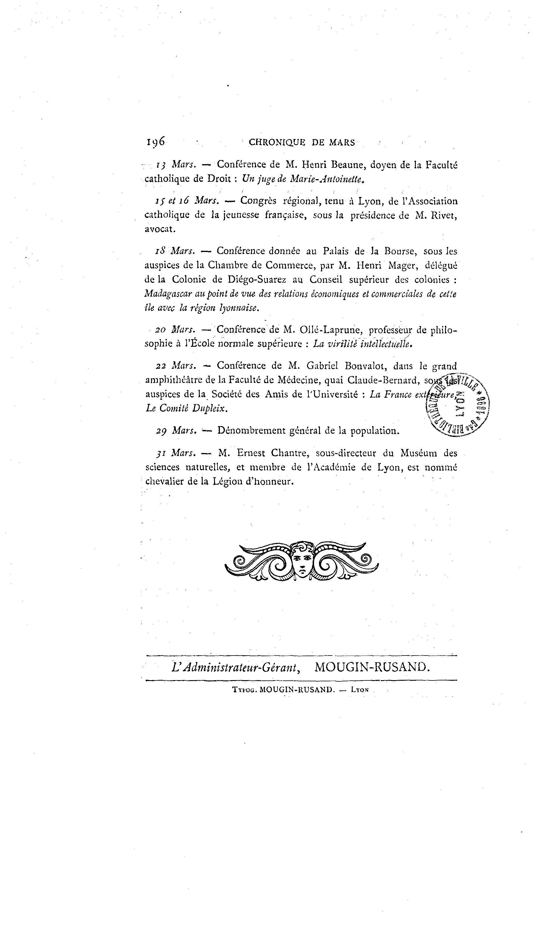 - 13 Mars. — Conférence de M. Henri Beaune, doyen de la Faculté
