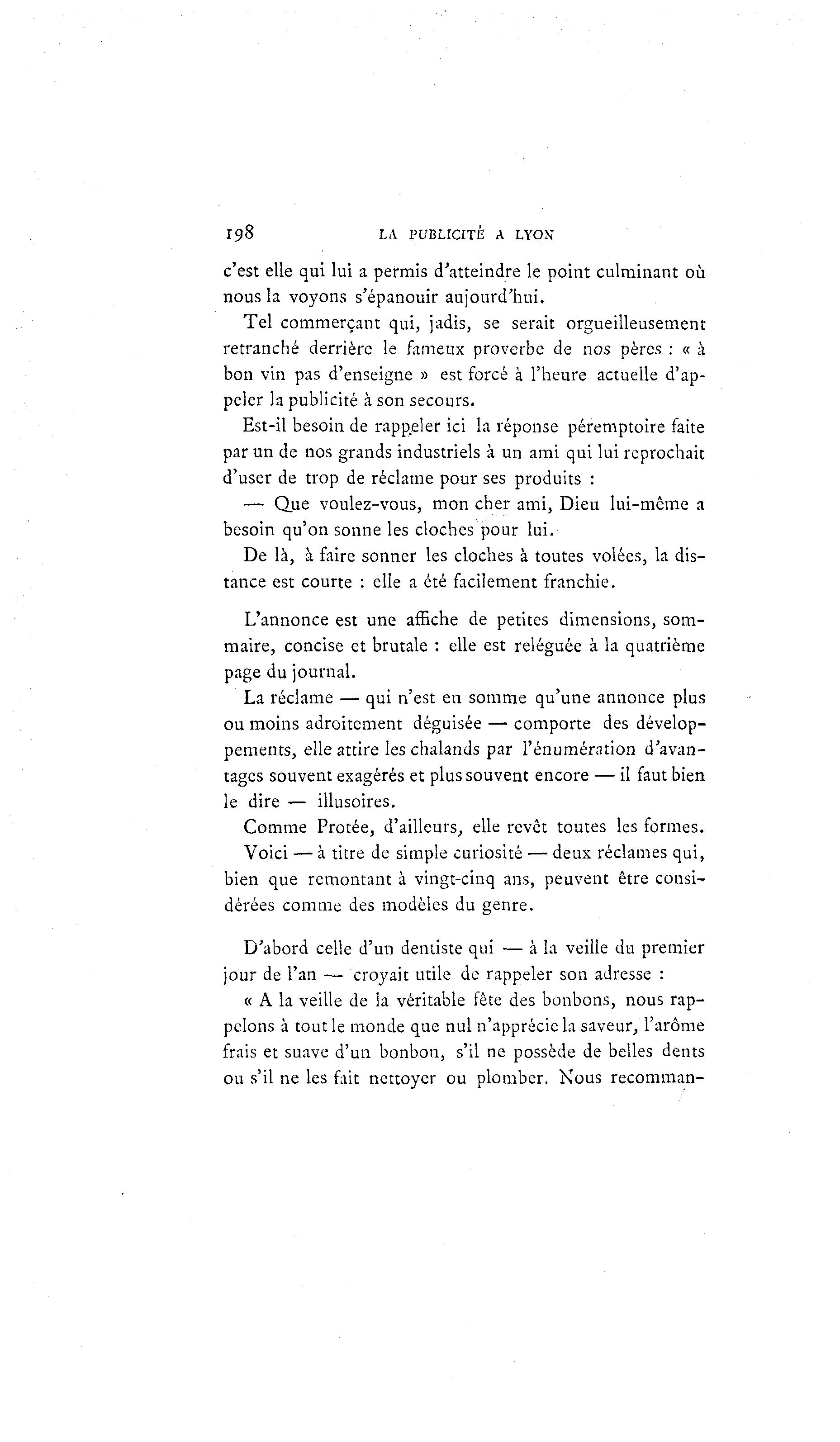 198 LA PUBLICITÉ A LYON c'est elle qui lui a permis d'atteindre le point culminant où nous la voyons s'épanouir aujourd'hui. Tel commerçant qui, jadis, se serait orgueilleusement retranché derrière le fameux proverbe de nos pères : « à bon vin pas d'enseigne » est forcé à l'heure actuelle d'ap- peler la publicité à son secours. Est-il besoin de rappeler ici la réponse péremptoire faite par un de nos grands industriels à un ami qui lui reprochait d'user de trop de réclame pour ses produits : — Que voulez-vous, mon cher ami, Dieu lui-même a besoin qu'on sonne les cloches pour lui. De là , à faire sonner les cloches à toutes volées, la dis- tance est courte : elle a été facilement franchie. L'annonce est une affiche de petites dimensions, som- maire, concise et brutale : elle est reléguée à la quatrième page du journal. La réclame — qui n'est en somme qu'une annonce plus ou moins adroitement déguisée — comporte des dévelop- pements, elle attire les chalands par rénumération d'avan- tages souvent exagérés et plus souvent encore — il faut bien le dire — illusoires. Comme Protée, d'ailleurs, elle revêt toutes les formes. Voici — à titre de simple curiosité — deux réclames qui, bien que remontant à vingt-cinq ans, peuvent être consi- dérées comme des modèles du genre. D'abord celle d'un dentiste qui — à la veille du premier jour de l'an — croyait utile de rappeler son adresse : « A la veille de la véritable fête des bonbons, nous rap- pelons à tout le monde que nul n'apprécie la saveur, l'arôme frais et suave d'un bonbon, s'il ne possède de belles dents ou s'il ne les fait nettoyer ou plomber. Nous recomman-