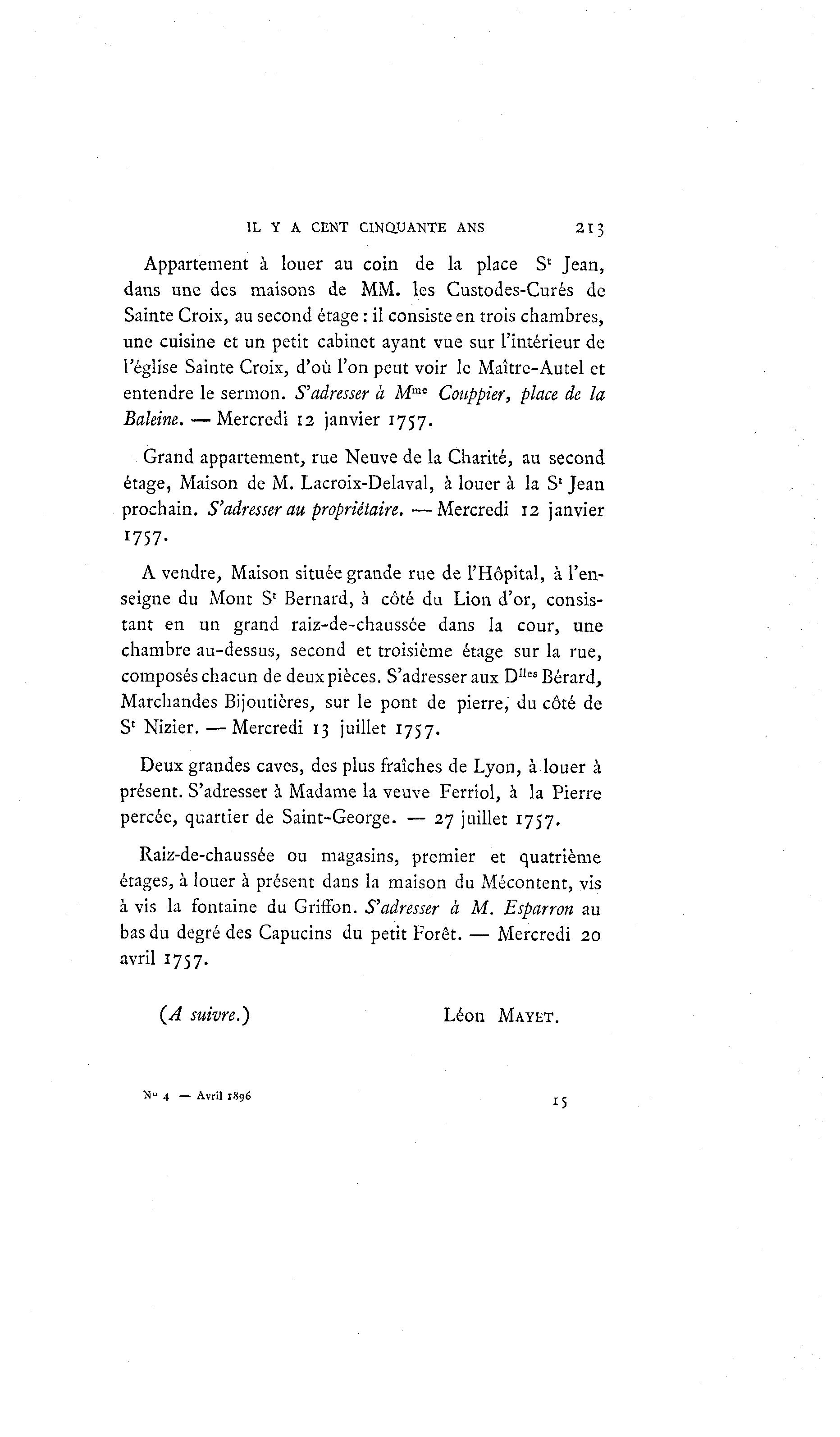 étage, Maison de M. Lacroix-Delaval, à louer à la S' Jean
