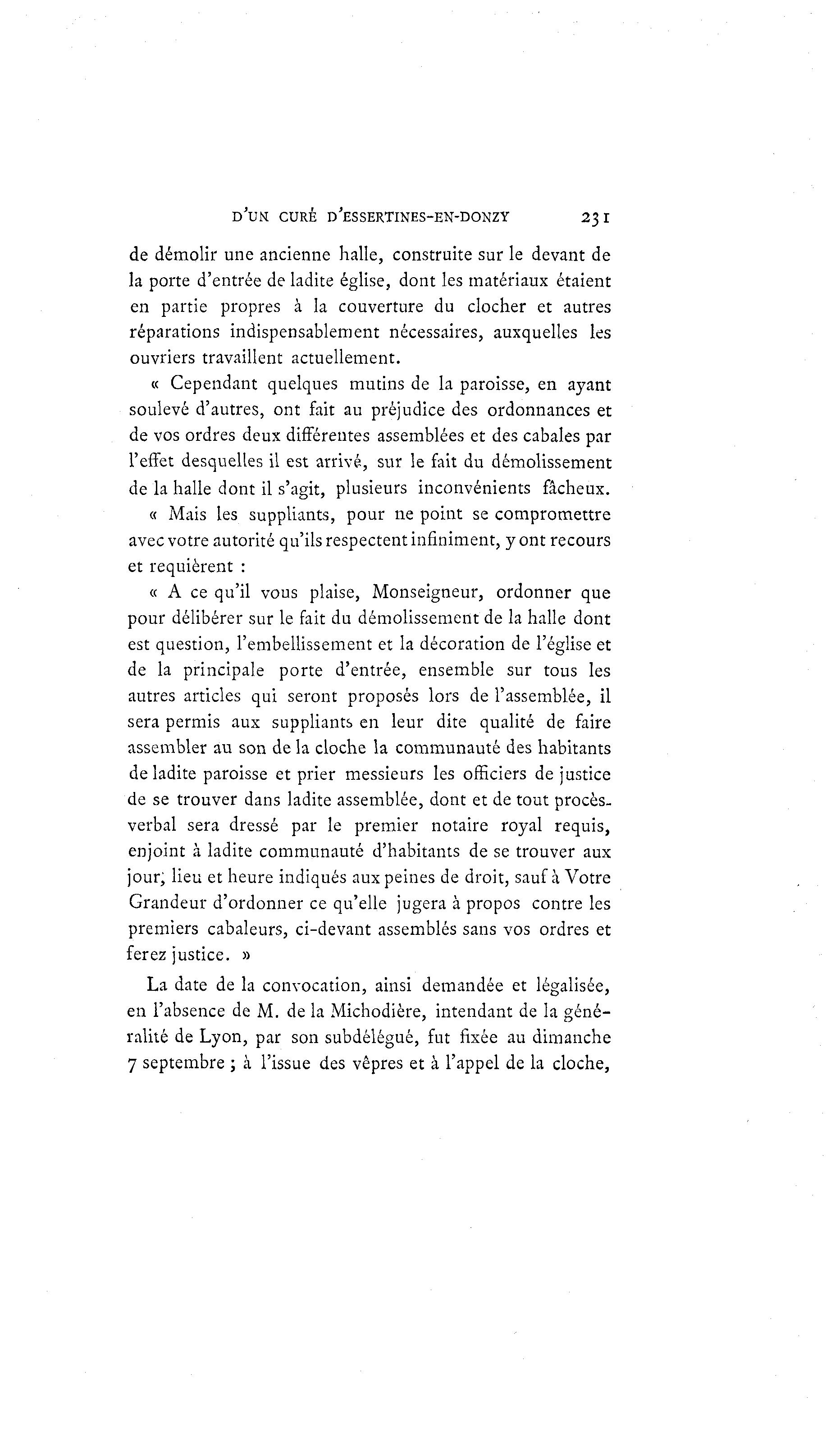 D'UN CURÉ D'ESSERTINES-EN-DONZY 231 de démolir une ancienne halle, construite sur le devant de la porte d'entrée de ladite église, dont les matériaux étaient en partie propres à la couverture du clocher et autres réparations indispensablement nécessaires, auxquelles les ouvriers travaillent actuellement. « Cependant quelques mutins de la paroisse, en ayant soulevé d'autres, ont fait au préjudice des ordonnances et de vos ordres deux différentes assemblées et des cabales par l'effet desquelles il est arrivé, sur le fait du démolissement de la halle dont il s'agit, plusieurs inconvénients fâcheux. « Mais les suppliants, pour ne point se compromettre avec votre autorité qu'ils respectent infiniment, y ont recours et requièrent : « A ce qu'il vous plaise, Monseigneur, ordonner que pour délibérer sur le fait du démolissement de la halle dont est question, l'embellissement et la décoration de l'église et de la principale porte d'entrée, ensemble sur tous les autres articles qui seront proposés lors de l'assemblée, il sera permis aux suppliants en leur dite qualité de faire assembler au son de la cloche la communauté des habitants de ladite paroisse et prier messieurs les officiers de justice de se trouver dans ladite assemblée, dont et de tout procès- verbal sera dressé par le premier notaire royal requis, enjoint à ladite communauté d'habitants de se trouver aux jour, lieu et heure indiqués aux peines de droit, sauf à Votre Grandeur d'ordonner ce qu'elle jugera à propos contre les premiers cabaleurs, ci-devant assemblés sans vos ordres et ferez justice. » La date de la convocation, ainsi demandée et légalisée, en l'absence de M. de la Michodière, intendant de la géné- ralité de Lyon, par son subdélégué, fut fixée au dimanche 7 septembre ; à l'issue des vêpres et à l'appel de la cloche,