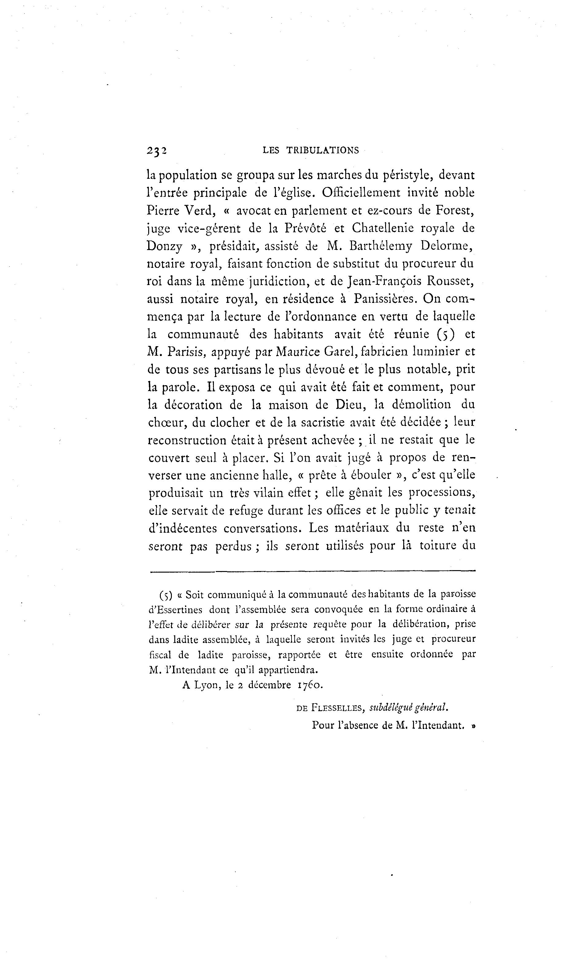 232 LES TRIBULATIONS la population se groupa sur les marches du péristyle, devant l'entrée principale de l'église. Officiellement invité noble Pierre Verd, « avocat en parlement et ez-cours de Forest, juge vice-gérent de la Prévôté et Chatellenie royale de Donzy », présidait, assisté de M. Barthélémy Delorme, notaire royal, faisant fonction de substitut du procureur du roi dans la même juridiction, et de Jean-François Rousset, aussi notaire royal, en résidence à Panissières. On com- mença par la lecture de l'ordonnance en vertu de laquelle la communauté des habitants avait été réunie (5) et M. Parisis, appuyé par Maurice Garel, fabricien luminier et de tous ses partisans le plus dévoué et le plus notable, prit la parole. Il exposa ce qui avait été fait et comment, pour la décoration de la maison de Dieu, la démolition du chœur, du clocher et de la sacristie avait été décidée ; leur reconstruction était à présent achevée ; il ne restait que le couvert seul à placer. Si l'on avait jugé à propos de ren- verser une ancienne halle, « prête à ébouler », c'est qu'elle produisait un très vilain effet ; elle gênait les processions, elle servait de refuge durant les offices et le public y tenait d'indécentes conversations. Les matériaux du reste n'en seront pas perdus ; ils seront utilisés pour là toiture du (5) « Soit communiqué à la communauté des habitants de la paroisse d'Essertines dont l'assemblée sera convoquée en la forme ordinaire à l'effet de délibérer sur la présente requête pour la délibération, prise dans ladite assemblée, à laquelle seront invités les juge et procureur fiscal de ladite paroisse, rapportée et être ensuite ordonnée par M. l'Intendant ce qu'il appartiendra. A Lyon, le 2 décembre 1760. DE FLESSELLES, suhdélégué général. Pour l'absence de M. l'Intendant. »