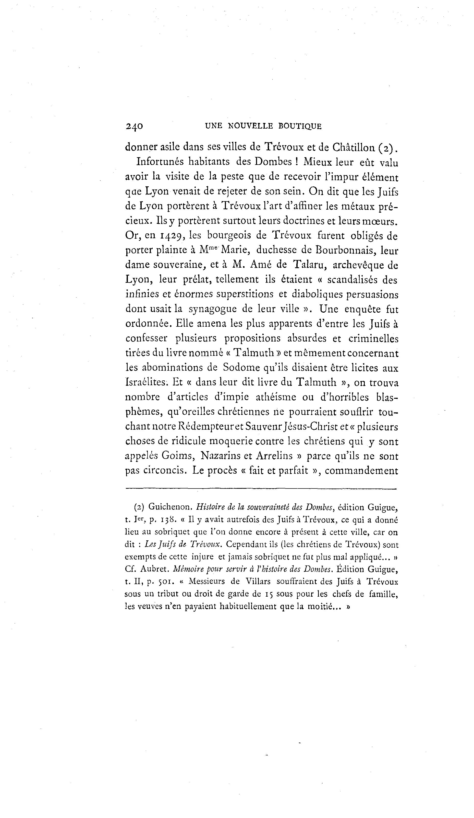 24O UNE NOUVELLE BOUTIQUE donner asile dans ses villes de Trévoux et de Châtillon ( 2 ) . Infortunés habitants des Dorabes ! Mieux leur eût valu avoir la visite de la peste que de recevoir l'impur élément qae Lyon venait de rejeter de son sein. On dit que les Juifs de Lyon portèrent à Trévoux l'art d'affiner les métaux pré- cieux. Ils y portèrent surtout leurs doctrines et leurs moeurs. Or, en 1429, les bourgeois de Trévoux furent obligés de porter plainte à Mme Marie, duchesse de Bourbonnais, leur dame souveraine, et à M. Amé de Talaru, archevêque de Lyon, leur prélat, tellement ils étaient « scandalisés des infinies et énormes superstitions et diaboliques persuasions dont usait la synagogue de leur ville ». Une enquête fut ordonnée. Elle amena les plus apparents d'entre les Juifs à confesser plusieurs propositions absurdes et criminelles tirées du livre nommé « Talmuth » et mêmement concernant les abominations de Sodome qu'ils disaient être licites aux Israélites. Et « dans leur dit livre du Talmuth », on trouva nombre d'articles d'impie athéisme ou d'horribles blas- phèmes, qu'oreilles chrétiennes ne pourraient souffrir tou- chant notre Rédempteuret Sauveur Jésus-Christ et « plusieurs choses de ridicule moquerie contre les chrétiens qui y sont appelés Goims, Nazarins et Arrelins » parce qu'ils ne sont pas circoncis. Le procès « fait et parfait », commandement (2) Guichenon. Histoire de la souveraineté des Dombes, édition Guigue, t. I er , p. 138. « Il y avait autrefois des Juifs à Trévoux, ce qui a donné lieu au sobriquet que l'on donne encore à présent à cette ville, car on dit : Les Juif s de Trévoux. Cependant ils (les chrétiens de Trévoux) sont exempts de cette injure et jamais sobriquet ne fut plus mal appliqué... » Cf. Aubret. Mémoire pour servir à l'histoire des Dombes. Édition Guigue, t. II, p. 501. « Messieurs de Villars souffraient des Juifs à Trévoux sous un tribut ou droit de garde de 15 sous pour les chefs de famille, les veuves n'en payaient habituellement que la moitié... »
