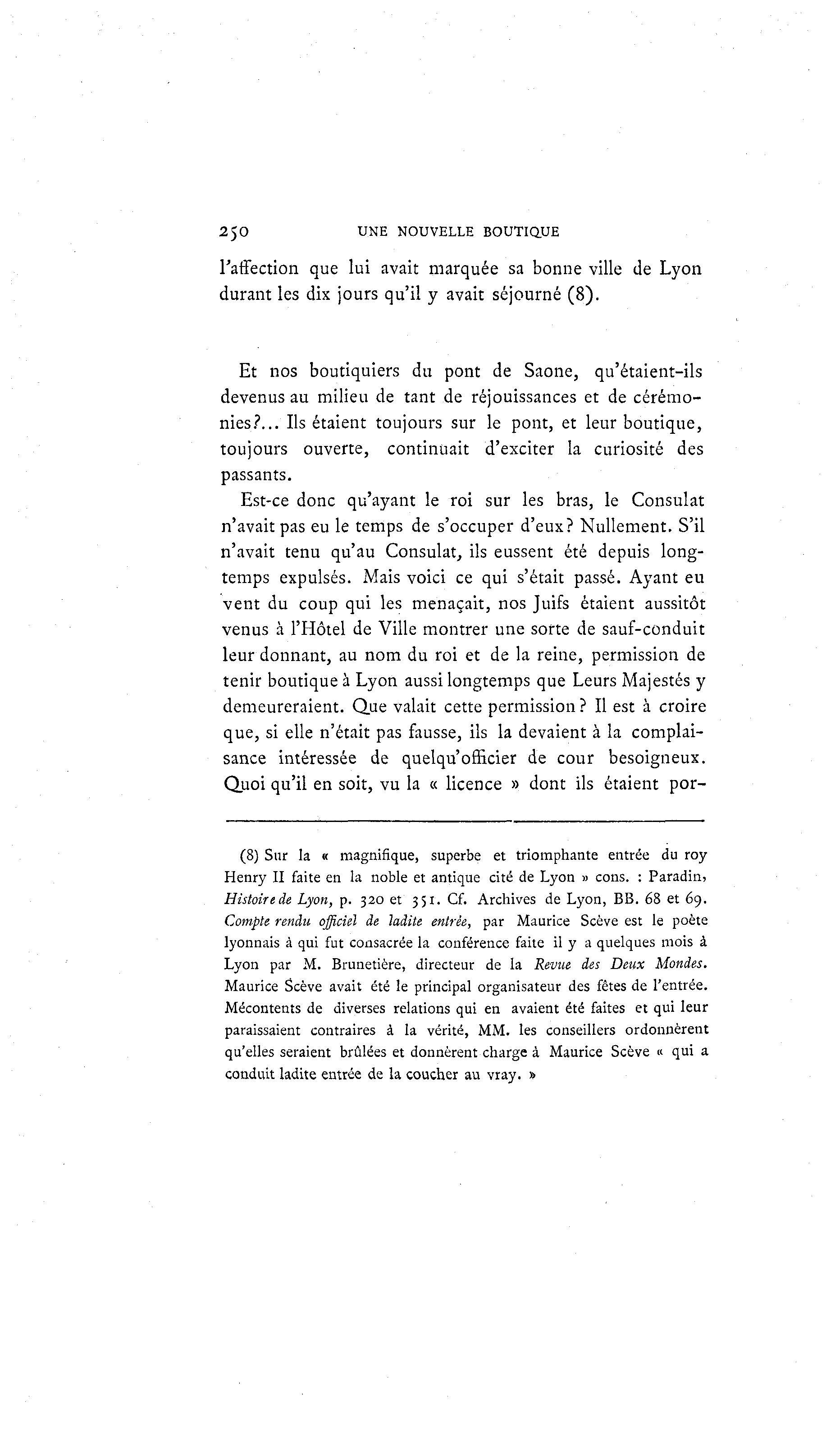 250 UNE NOUVELLE BOUTIQUE l'affection que lui avait marquée sa bonne ville de Lyon durant les dix jours qu'il y avait séjourné (8). Et nos boutiquiers du pont de Saône, qu'étaient-ils devenus au milieu de tant de réjouissances et de cérémo- nies?... Ils étaient toujours sur le pont, et leur boutique, toujours ouverte, continuait d'exciter la curiosité des passants. Est-ce donc qu'ayant le roi sur les bras, le Consulat n'avait pas eu le temps de s'occuper d'eux? Nullement. S'il n'avait tenu qu'au Consulat, ils eussent été depuis long- temps expulsés. Mais voici ce qui s'était passé. Ayant eu vent du coup qui les menaçait, nos Juifs étaient aussitôt venus à l'Hôtel de Ville montrer une sorte de sauf-conduit leur donnant, au nom du roi et de la reine, permission de tenir boutique à Lyon aussi longtemps que Leurs Majestés y demeureraient. Que valait cette permission ? Il est à croire que, si elle n'était pas fausse, ils la devaient à la complai- sance intéressée de quelqu'officier de cour besoigneux. Quoi qu'il en soit, vu la « licence » dont ils étaient por- (8) Sur la « magnifique, superbe et triomphante entrée du roy Henry II faite en la noble et antique cité de Lyon » cons. : Paradin, Histoire de Lyon, p. 320 et 351. Cf. Archives de Lyon, BB. 68 et 69. Compte rendu officiel de ladite entrée, par Maurice Scève est le poète lyonnais à qui fut consacrée la conférence faite il y a quelques mois à Lyon par M. Brunetière, directeur de la Revue des Deux Mondes. Maurice Scève avait été le principal organisateur des fêtes de l'entrée. Mécontents de diverses relations qui en avaient été faites et qui leur paraissaient contraires à la vérité, MM. les conseillers ordonnèrent qu'elles seraient brûlées et donnèrent charge à Maurice Scève « qui a conduit ladite entrée de la coucher au vray. »