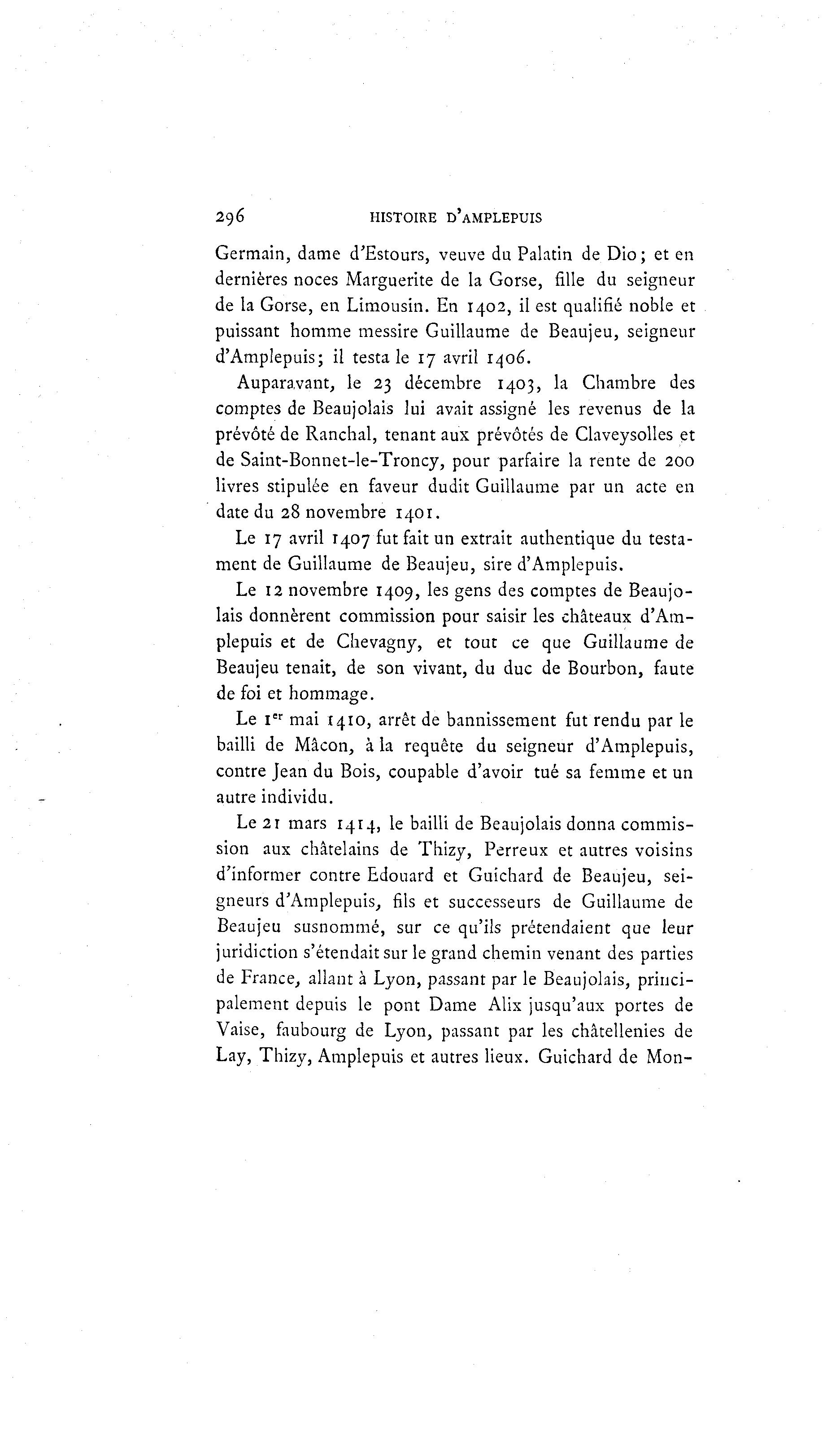 296 HISTOIRE D'AMPLEPUIS Germain, dame d'Estours, veuve du Palatin de Dio; et en dernières noces Marguerite de la Gorse, fille du seigneur de la Gorse, en Limousin. En 1402, il est qualifié noble et puissant homme messire Guillaume de Beaujeu, seigneur d'Amplepuis; il testa le 17 avril 1406. Auparavant, le 23 décembre 1403, la Chambre des comptes de Beaujolais lui avait assigné les revenus de la prévôté de Ranchal, tenant aux prévôtés de Claveysolles et de Saint-Bonnet-le-Troncy, pour parfaire la rente de 200 livres stipulée en faveur dudit Guillaume par un acte en date du 28 novembre 1401. Le 17 avril 1407 fut fait un extrait authentique du testa- ment de Guillaume de Beaujeu, sire d'Amplepuis. Le 12 novembre 1409, les gens des comptes de Beaujo- lais donnèrent commission pour saisir les châteaux d'Am- plepuis et de Chevagny, et tout ce que Guillaume de Beaujeu tenait, de son vivant, du duc de Bourbon, faute de foi et hommage. Le 1" mai 1410, arrêt de bannissement fut rendu par le bailli de Mâcon, à la requête du seigneur d'Amplepuis, contre Jean du Bois, coupable d'avoir tué sa femme et un autre individu. Le 21 mars 1414, le bailli de Beaujolais donna commis- sion aux châtelains de Thizy, Perreux et autres voisins d'informer contre Edouard et Guichard de Beaujeu, sei- gneurs d'Amplepuis, fils et successeurs de Guillaume de Beaujeu susnommé, sur ce qu'ils prétendaient que leur juridiction s'étendait sur le grand chemin venant des parties de France, allant à Lyon, passant par le Beaujolais, princi- palement depuis le pont Dame Alix jusqu'aux portes de Vaise, faubourg de Lyon, passant par les châtellenies de Lay, Thizy, Amplepuis et autres lieux. Guichard de Mon-